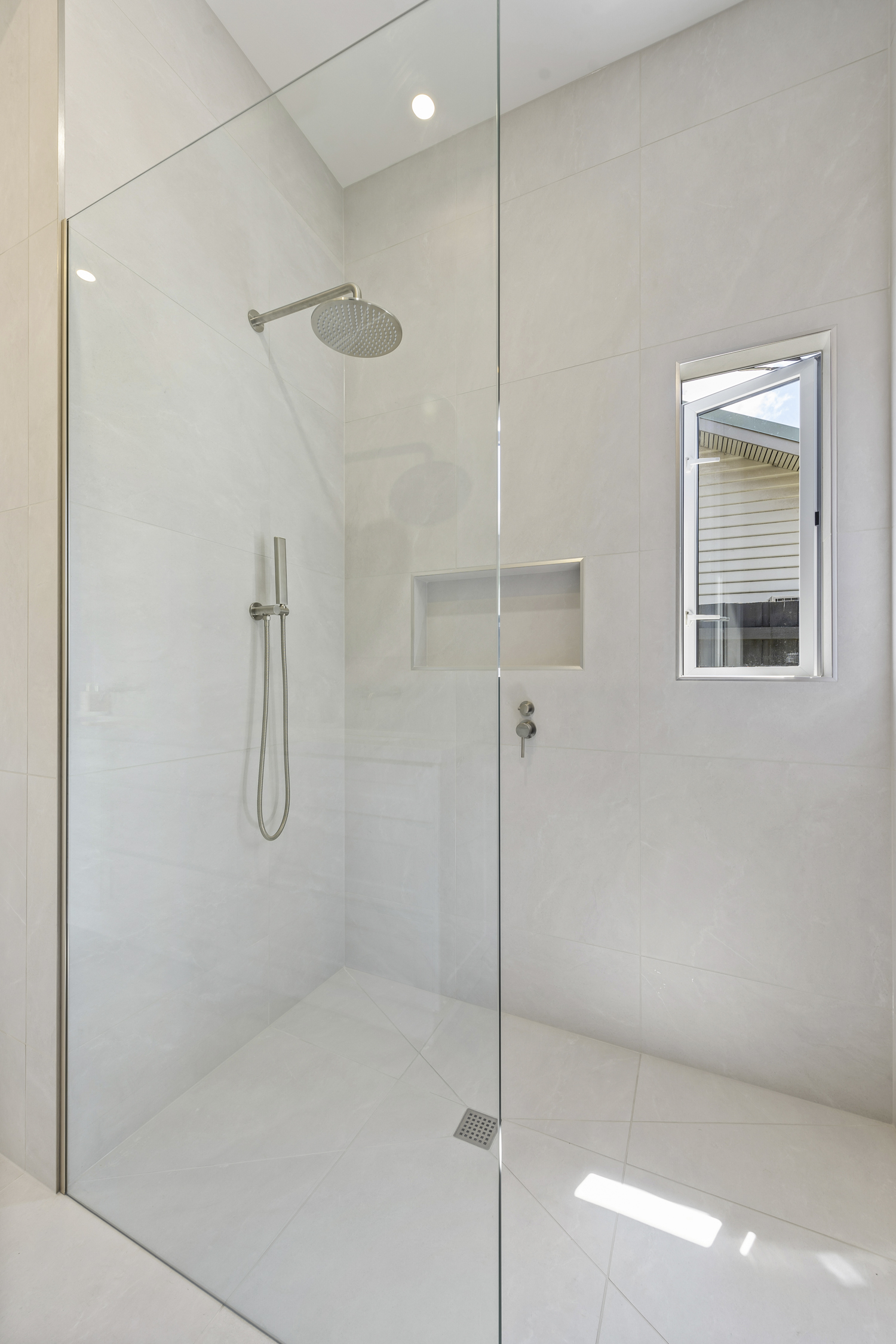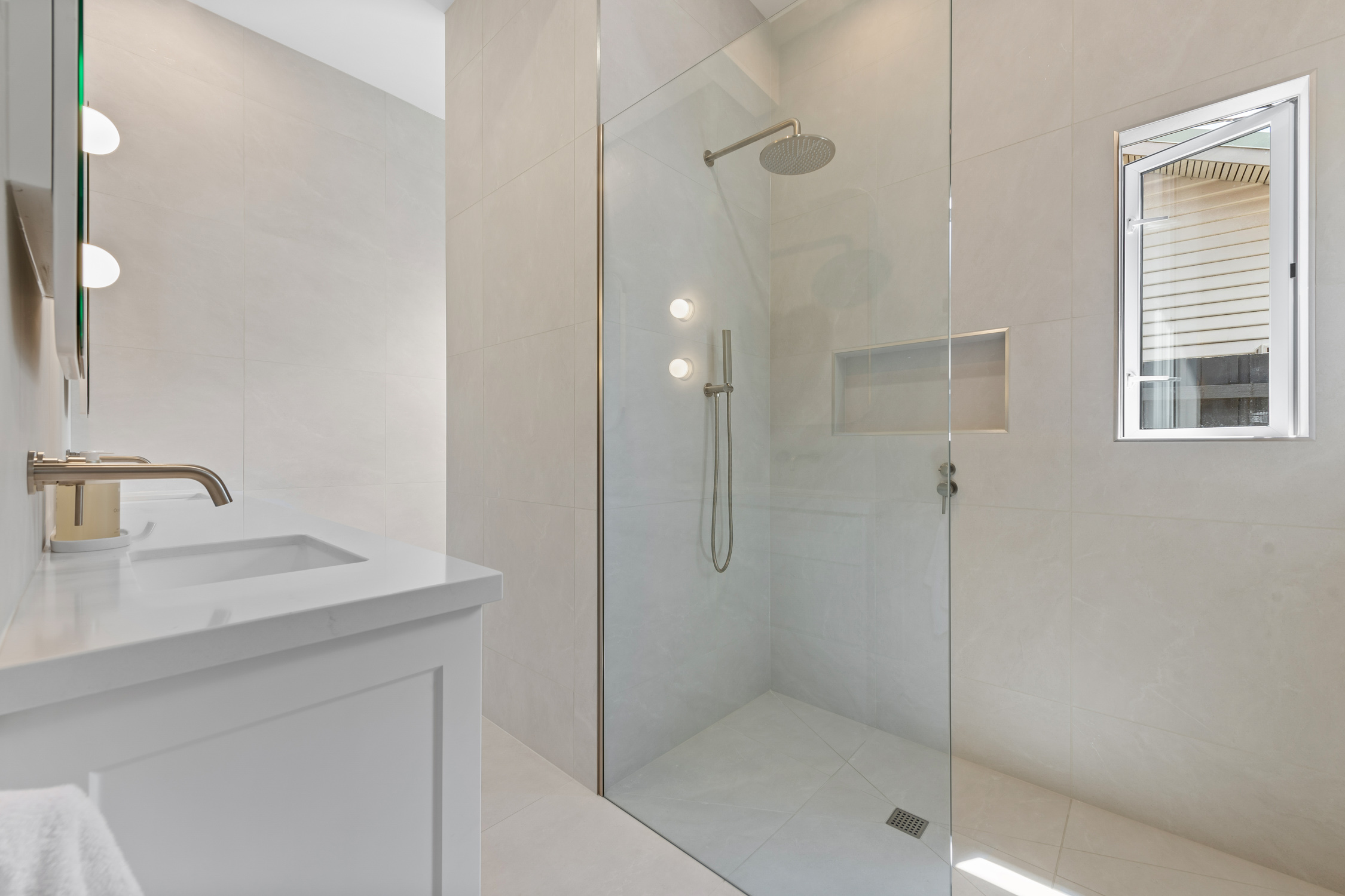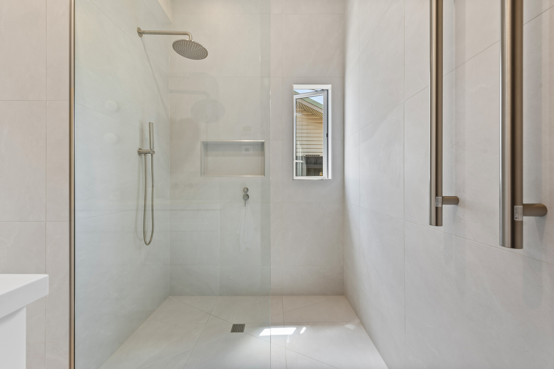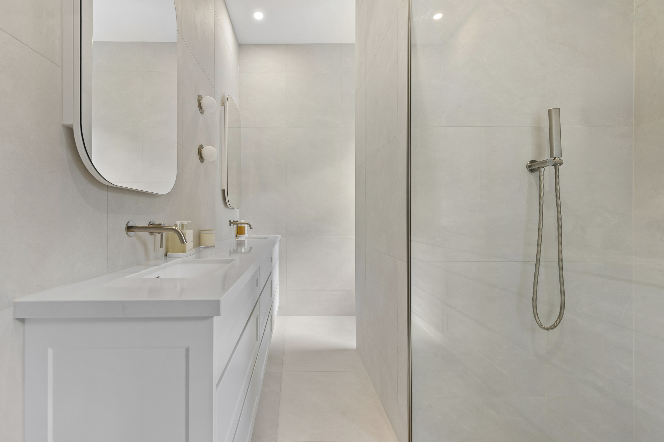 The ensuite design centres around clean geometry and understated luxury. Full-height tiling in a soft stone finish wraps the entire room, creating a continuous and calming visual flow. A fully frameless 1000mm glass shower screen encloses the walk-in shower, where a central drain over a Wedi waterproof base ensures both safety and performance. The 300mm x 600mm tiled shower niche, carefully positioned at eye level, adds built-in convenience without compromising the sleek wall lines.