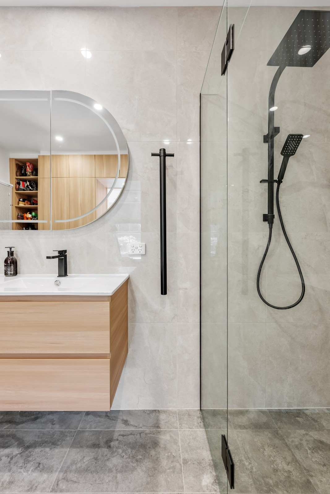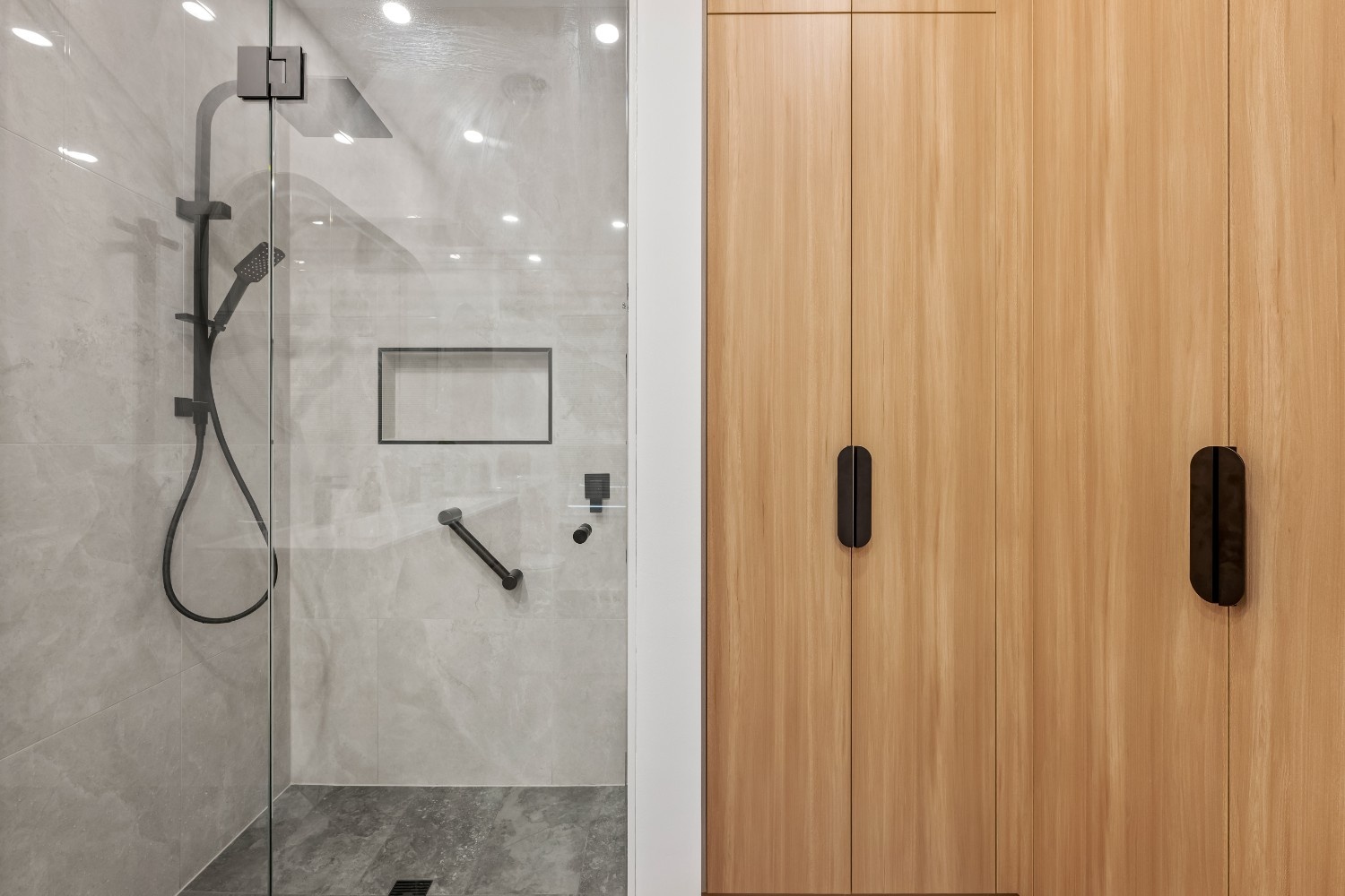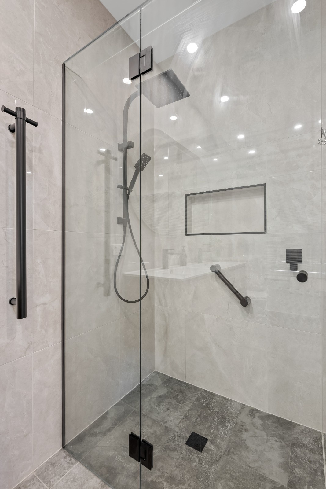 Each element of this renovation was chosen for both its design impact and its ability to withstand the demands of daily use. The matte black fixtures and fittings, including the heated towel rail and grab rail, provide a stylish, functional addition while the lighting choices, including LED downlights, ensure the space is always well-lit, enhancing its sleek design. The spacious shower area, with its carefully planned niche, provides ample storage while maintaining a clean, minimalistic feel.