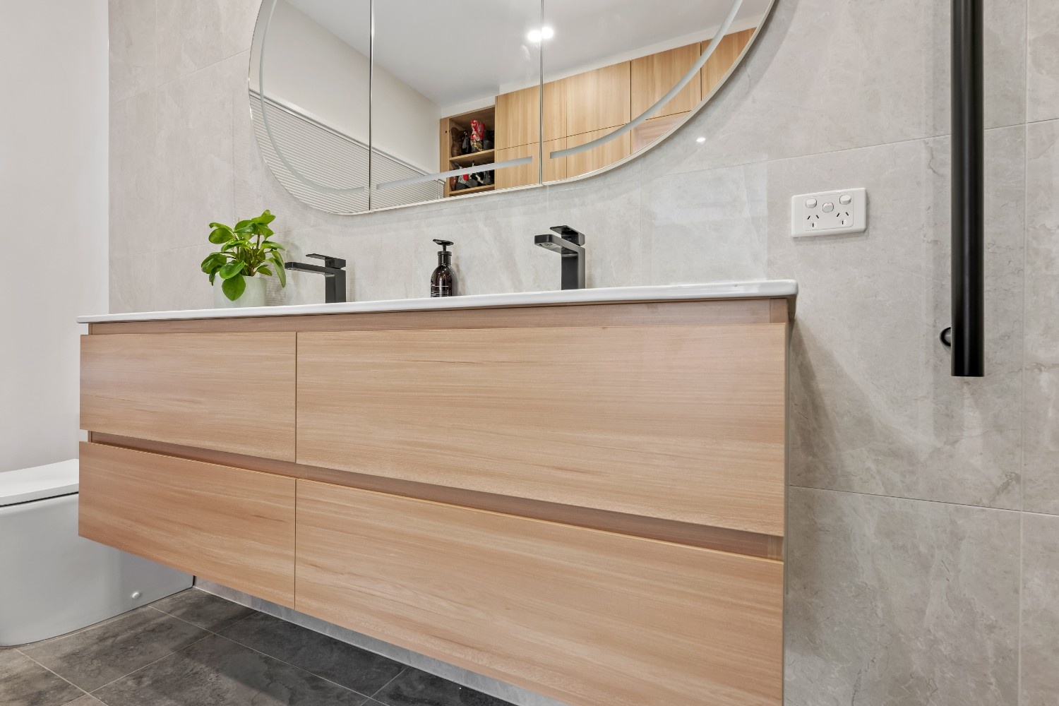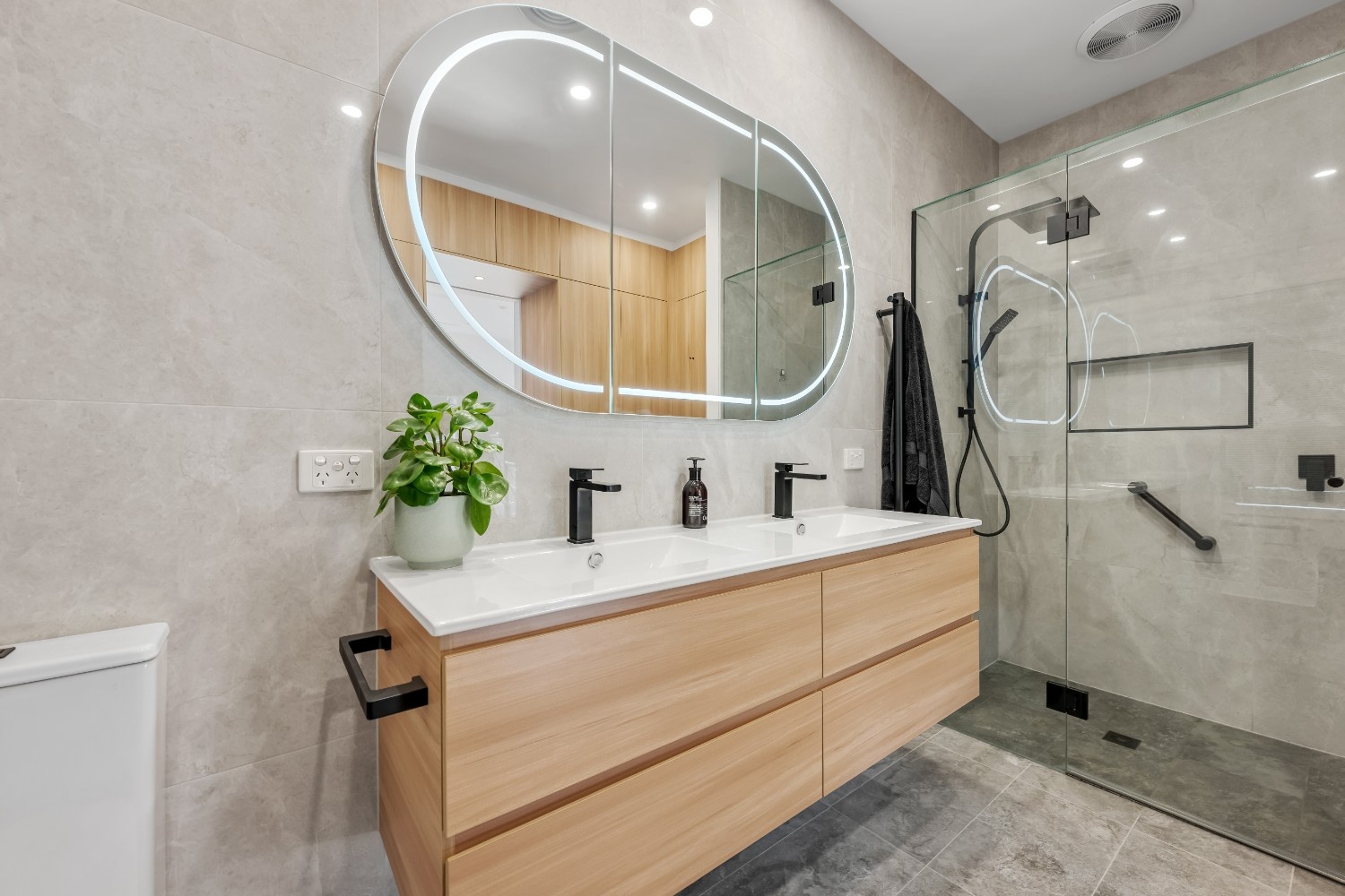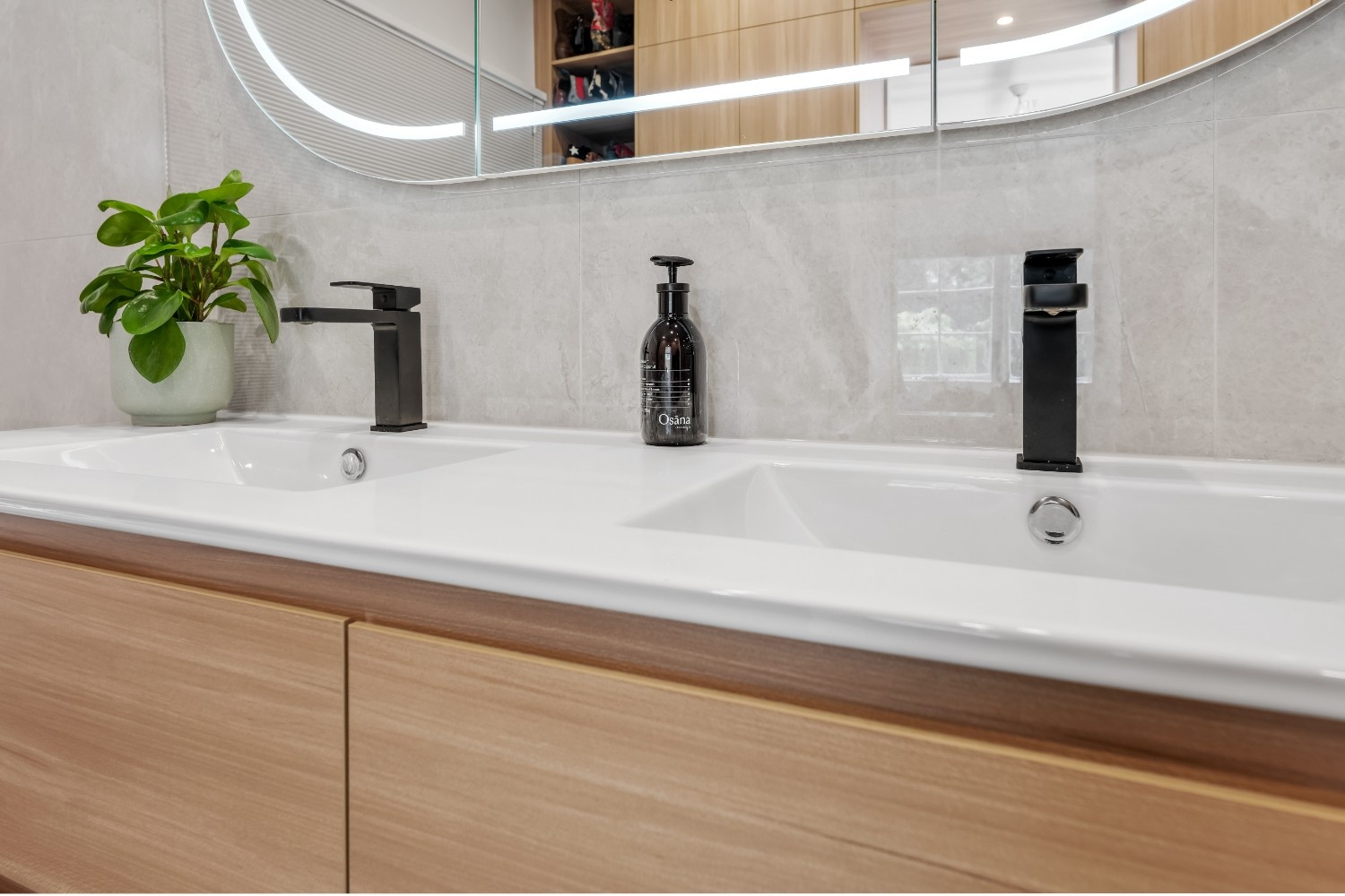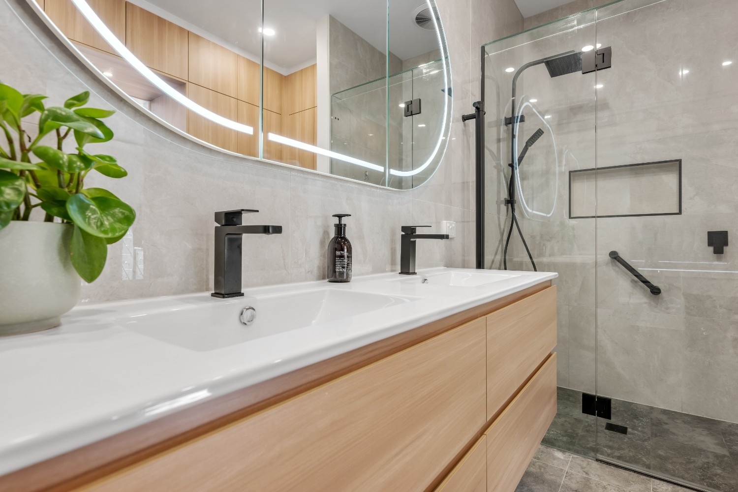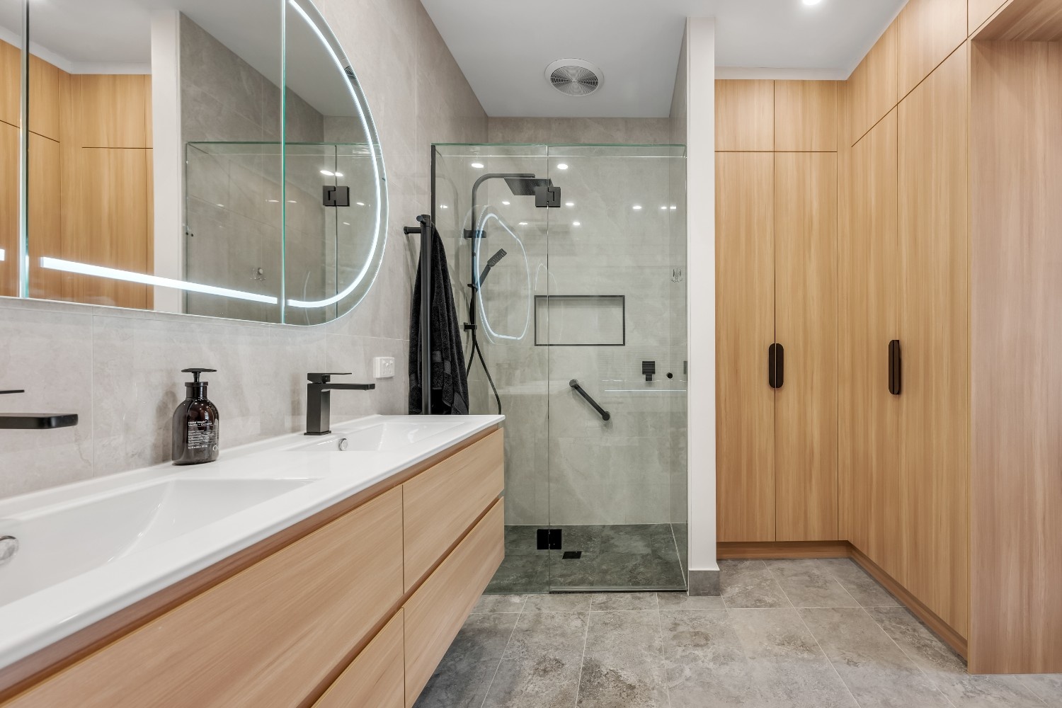 The design of this bathroom combines modern aesthetics with superior functionality. Custom cabinetry, including a sleek Plantation Ash vanity, offers ample storage space while maintaining a clean and minimalist look. The bathroom features a double-basin ceramic top vanity, highlighted by matte black Celia basin mixers and shower fixtures, adding a modern contrast to the warm tones of the cabinetry.
