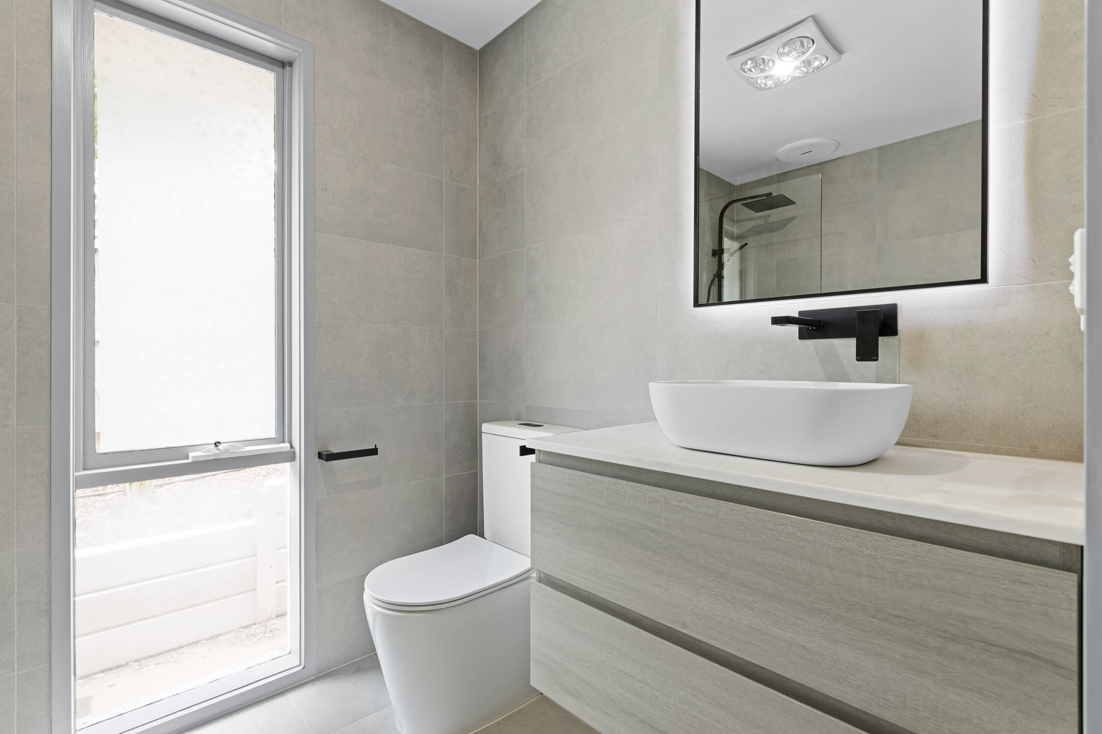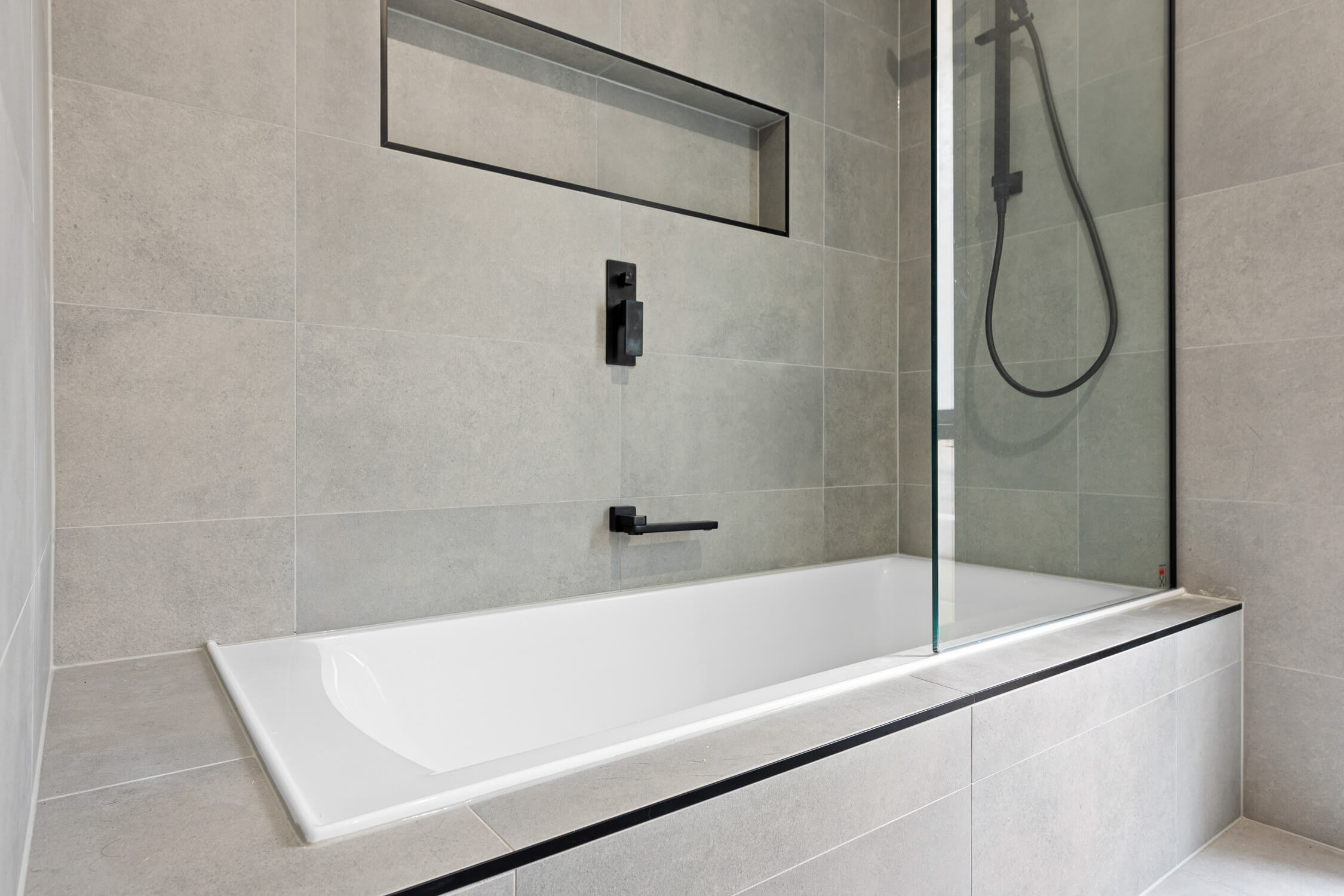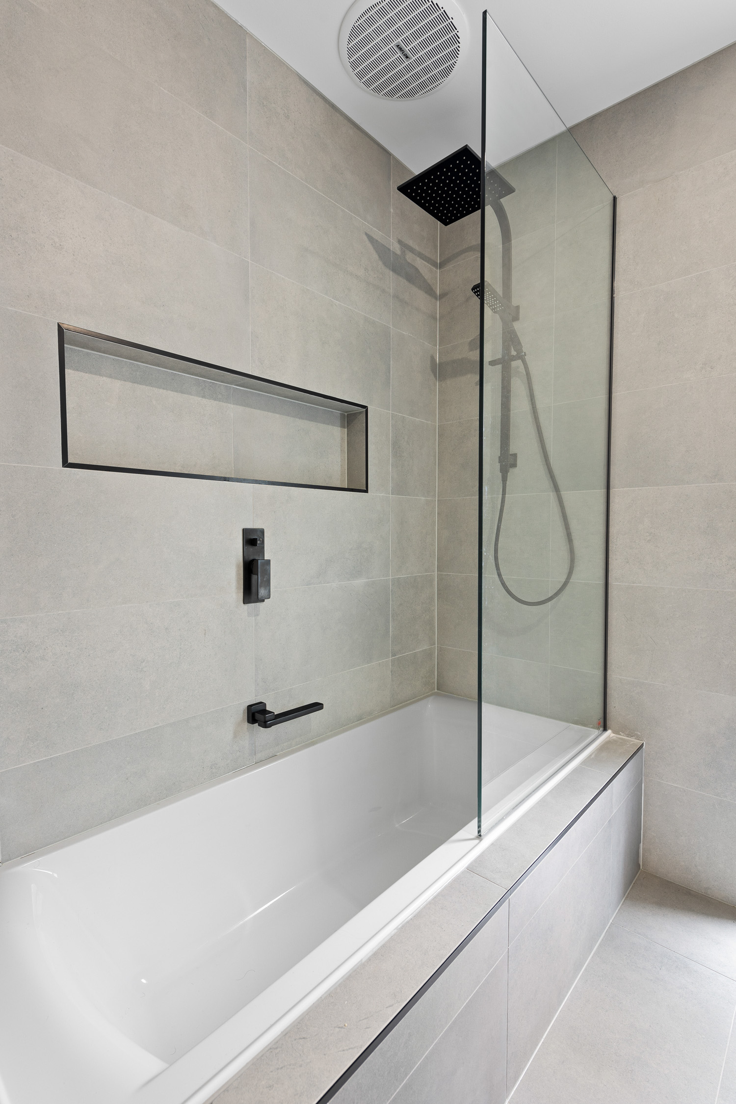 To maximise functionality without crowding the space, we installed a frameless glass shower panel over an inset bathtub, paired with a built-in niche finished in matching tile for streamlined storage. Black tapware continues in the bath and shower area, including a square rainfall showerhead and hand shower combination. Subtle but effective lighting is delivered via a 3-in-1 IXL heat lamp and a dedicated fan above the shower.