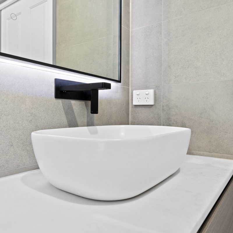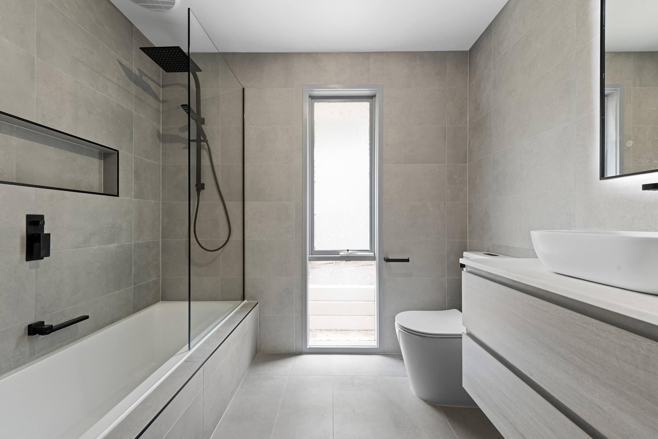 We started with full demolition, then meticulously rebuilt the space from the substructure up, ensuring precise wall straightening, waterproofing, and tiling to Australian Standards. The palette for this renovation features large-format Cliffstone Perla Matt tiles (300x600mm) across walls and floors, laid in a clean stack bond pattern to enhance spatial symmetry and lend an understated elegance to the room.