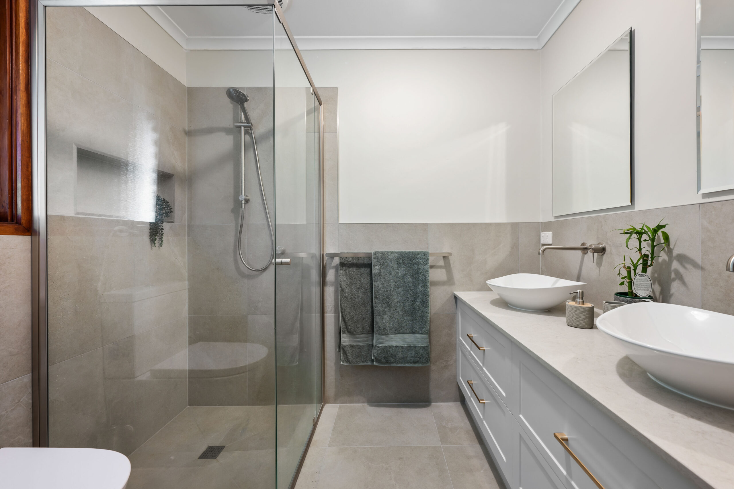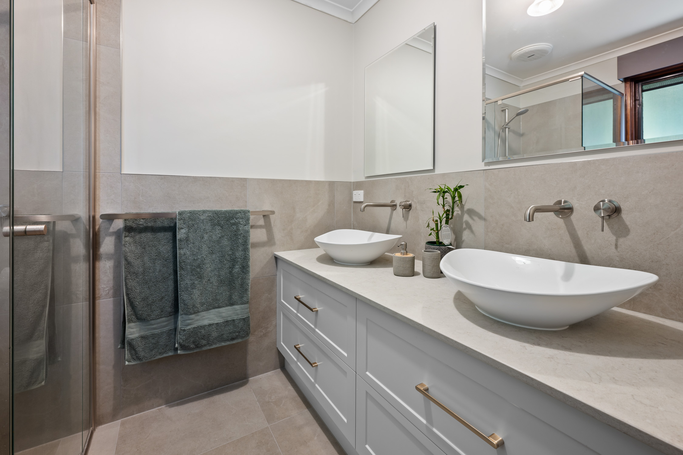 The custom vanity features shaker-style cabinetry in crisp white, paired with brushed gold handles and topped with a stone benchtop for durability and elegance. Above, a polished-edge mirror enhances the sense of light and space, while twin vessel basins in the ensuite add to the luxury feel. Wall-mounted tapware in a sleek brushed finish reinforces the modern design.