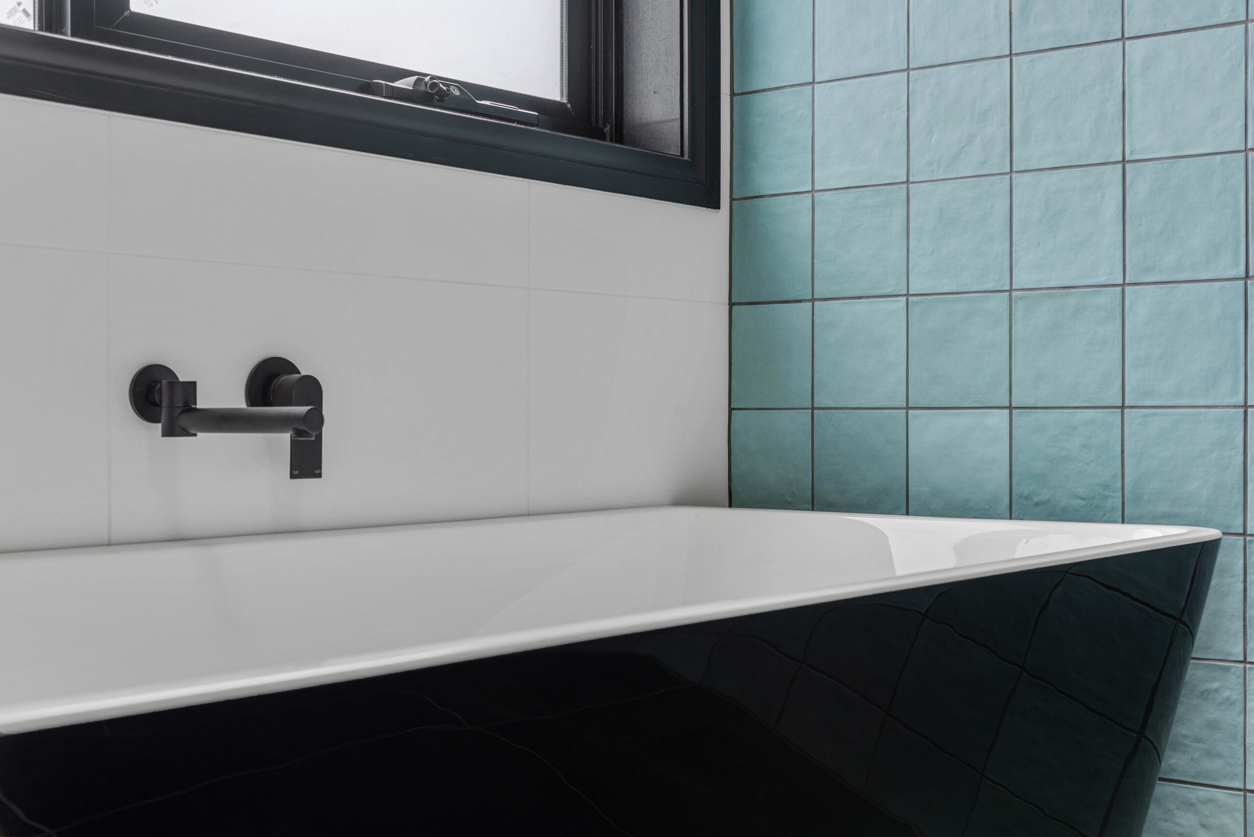 From the outset, our aim was to create a serene and grounded space that offered visual contrast without sacrificing warmth. The bathroom features full-height tiling with a striking mix of Lux White Satin wall tiles and an aqua sea matte feature wall in the shower and bath zone. This gentle splash of colour breathes personality into the space, creating a coastal calm that pairs beautifully with sleek black fixtures.