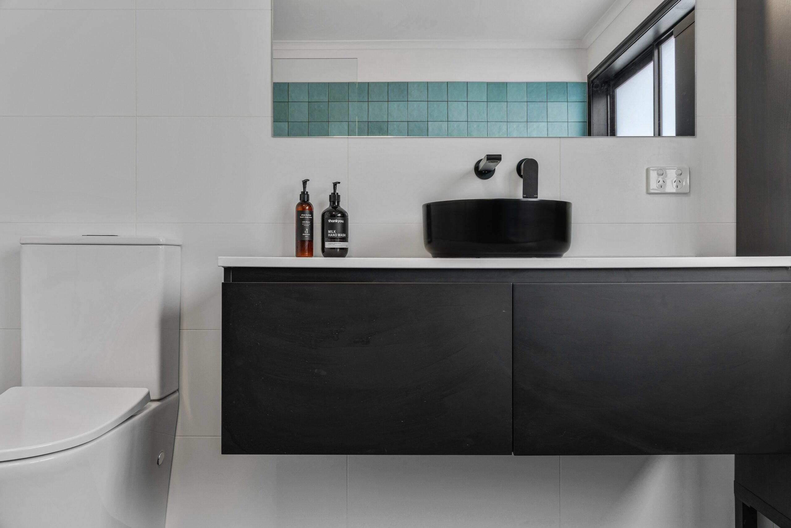 Custom joinery throughout the bathroom includes a floating 1200mm vanity with a crisp white benchtop and an above-counter black basin. Paired with matte black wall-mounted tapware, the vanity zone feels sculptural and high-end, while offering ample storage. A polished edge mirror spans the width of the vanity, reflecting light and opening up the space visually.