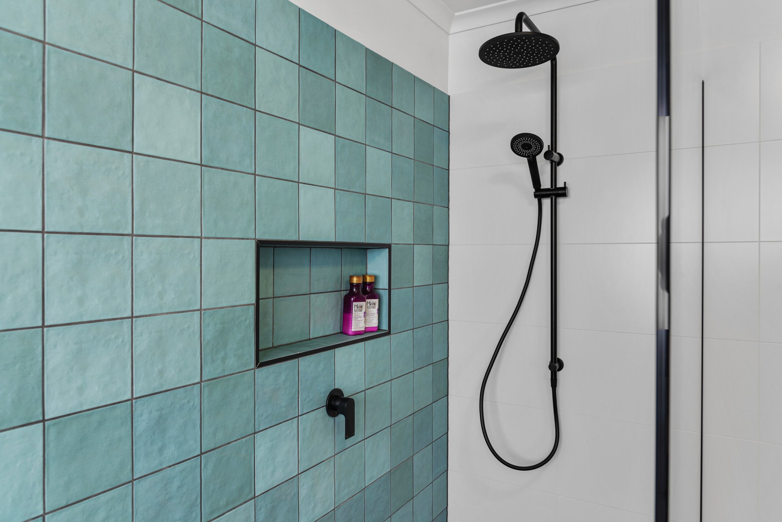 We began with a bold tile selection—Bali Verde Gloss tiles in 225 x 225 format—to clad the shower wall and wrap the floor and custom-built shower bench. The result is a spa-like mood, rich in teal and seafoam tones, grounded by the metallic textures in the glaze. Paired with clean, white Lux Satin wall tiles and black matte tapware, the space delivers striking contrast in a serene palette.