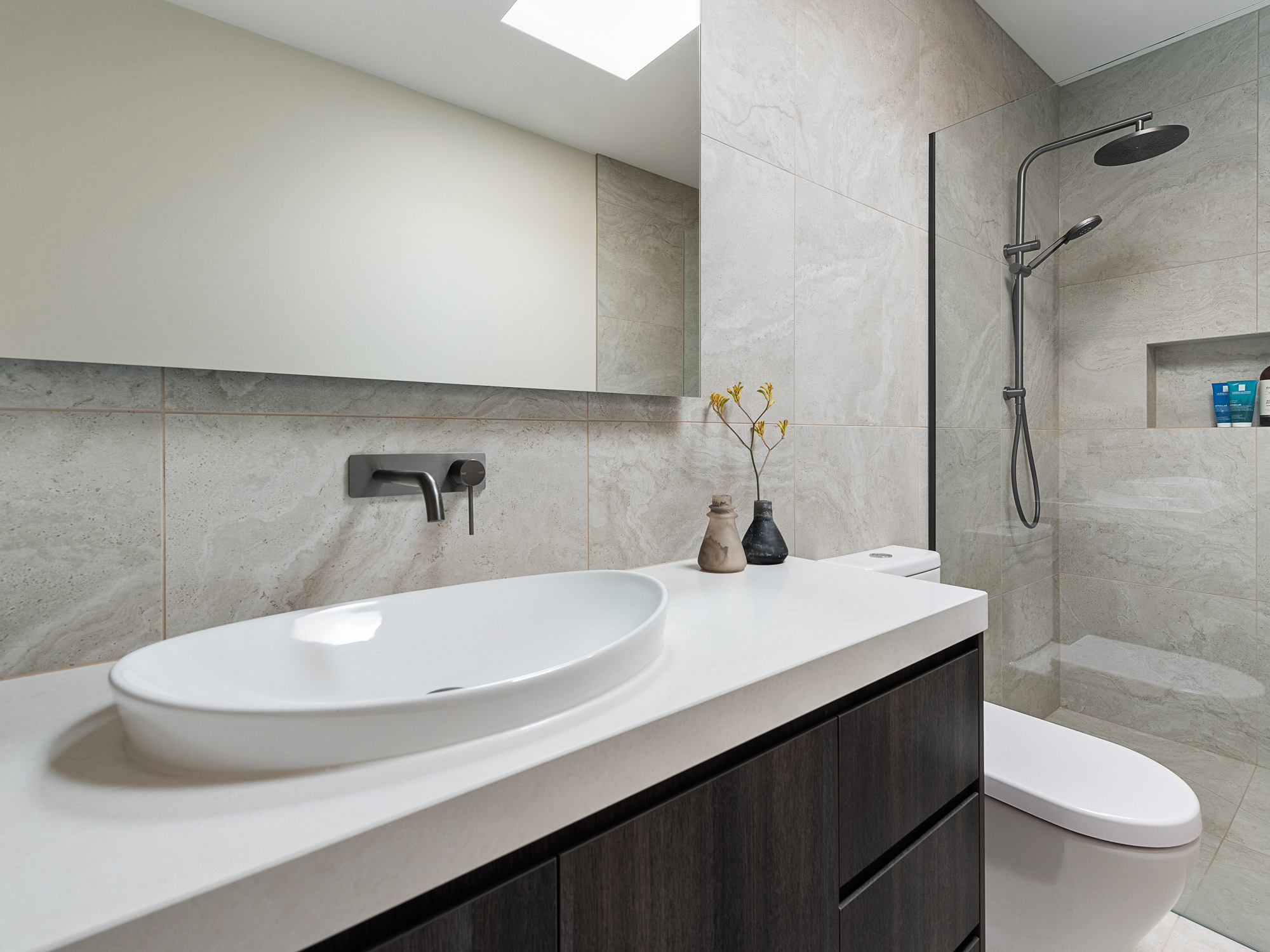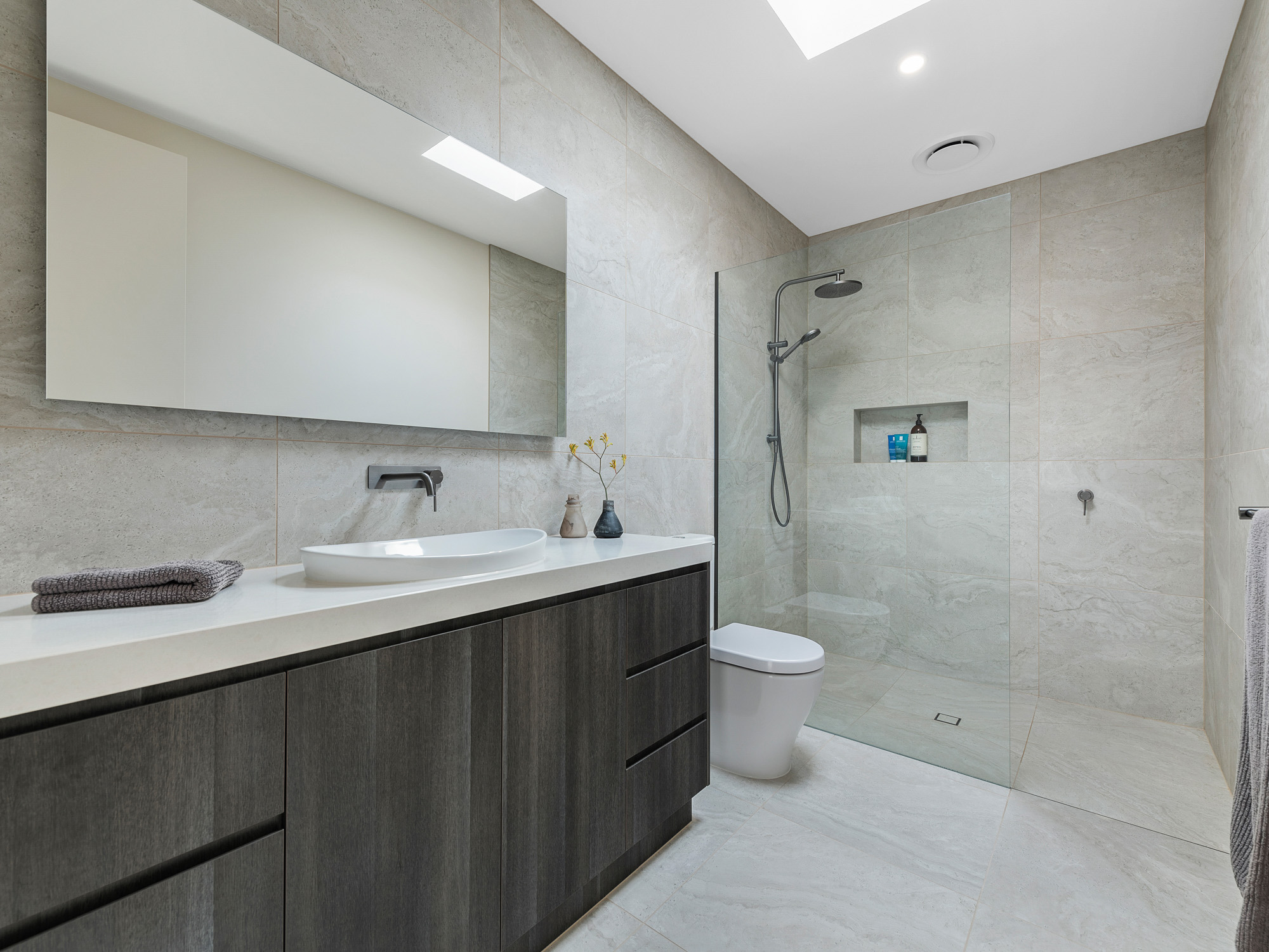 In the ensuite, we carried through the design philosophy of texture and simplicity, but with a bolder, more modern edge. The floor-to-ceiling tiles—Unique Travertine Silver Minimal—create a natural stone look that’s sophisticated yet understated. A frameless 1200mm glass shower panel allows full visibility across the space, giving prominence to the integrated niche and matte black twin shower system.