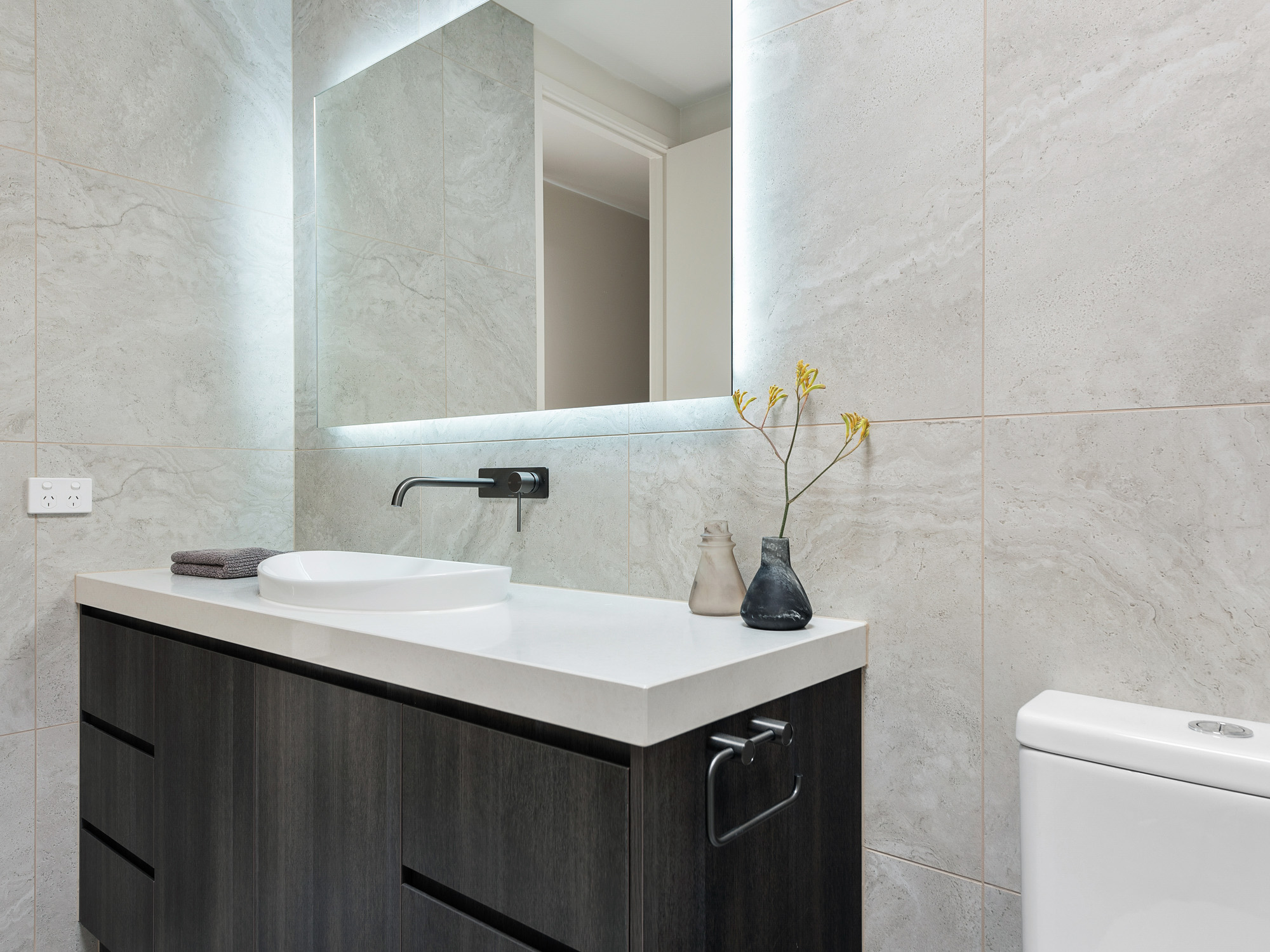 The custom double vanity features dark Polytec woodgrain joinery with a contrasting Caesarstone top and twin vessel sinks. Above, a full-width Ablaze SS backlit mirror enhances the sense of scale and adds even light across the wall. The matte black wall-mounted tapware repeats throughout, reinforcing the clean, linear look.