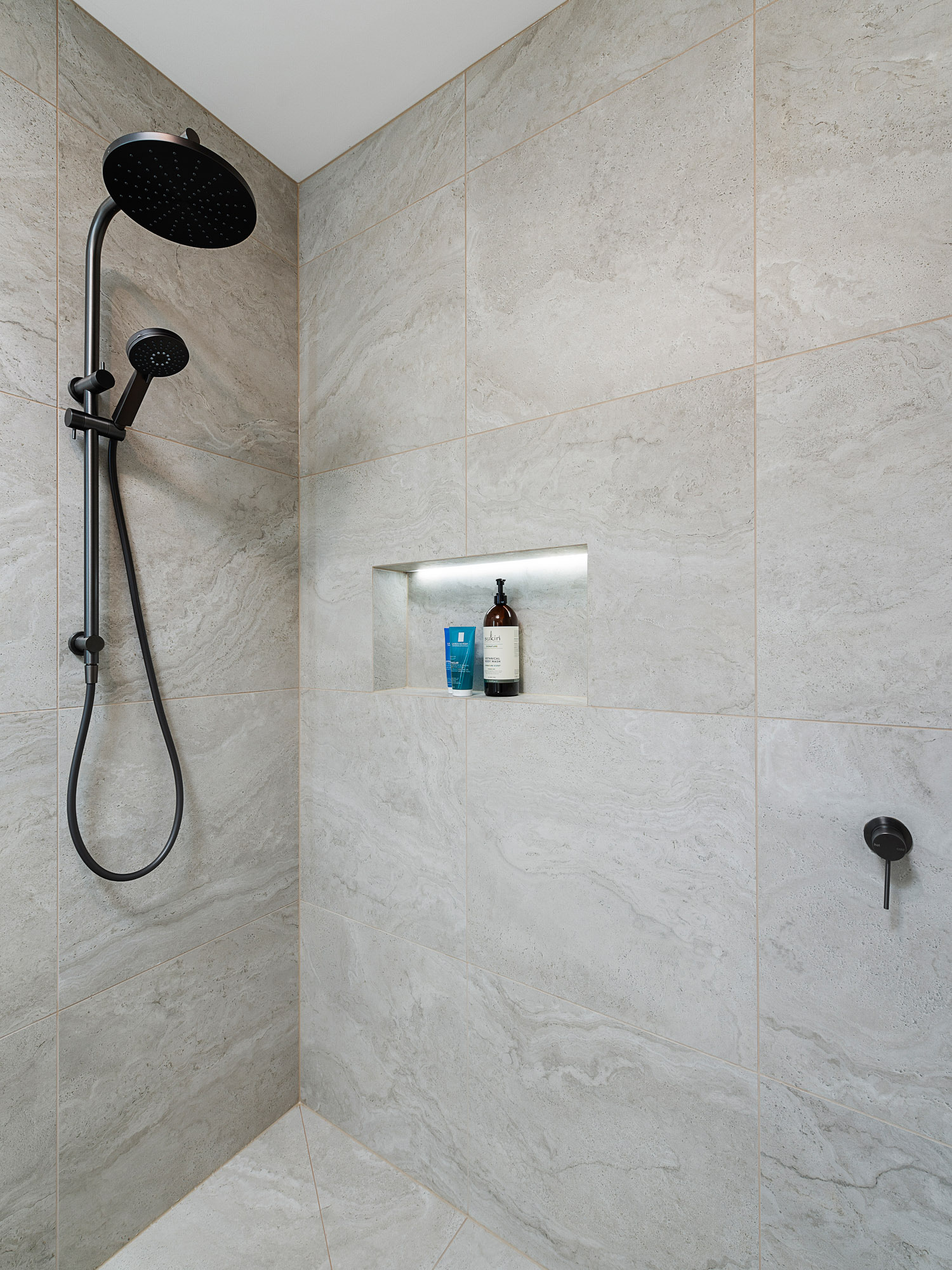 Underfoot, 600 x 600 floor tiles carry through seamlessly from wall to shower floor, showcasing a consistent and high-end finish. A ceiling-mounted fan and LED-lit niche complete the space, offering style and comfort in equal measure.