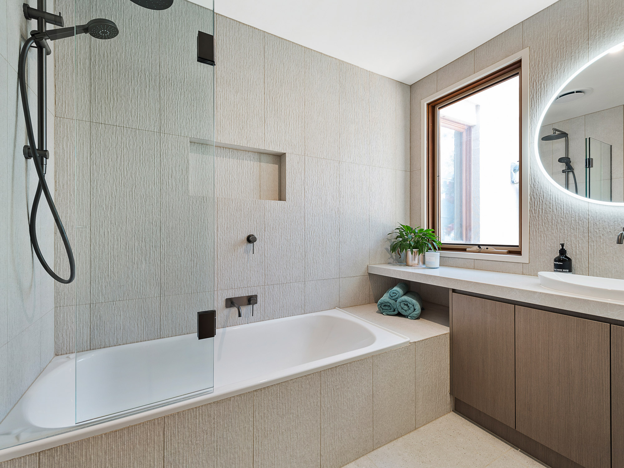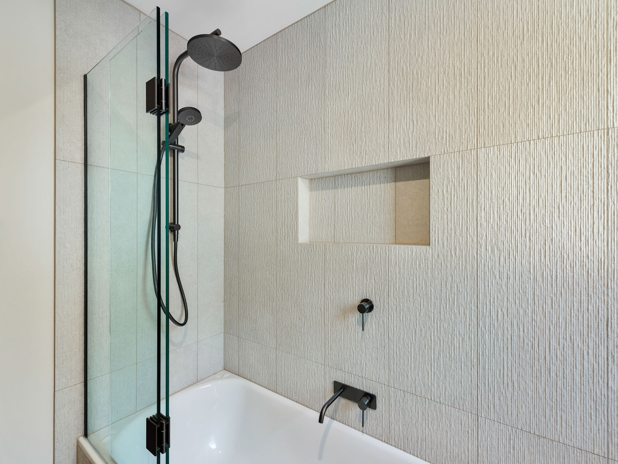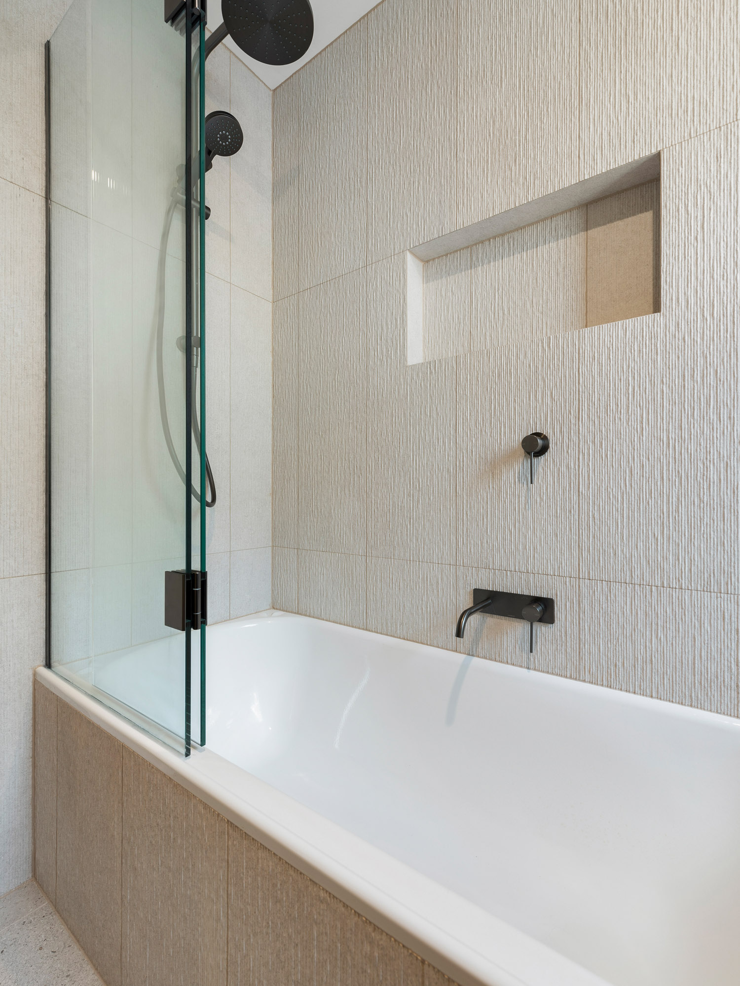 We designed the family bathroom with both elegance and durability in mind. The soft, textured Ozone Scot Pearl wall tiles in a stacked bond layout provide a contemporary base for the entire space. A custom-built bath hob integrates a retained tub, now paired with matte black tapware and a niche shelf for added convenience.