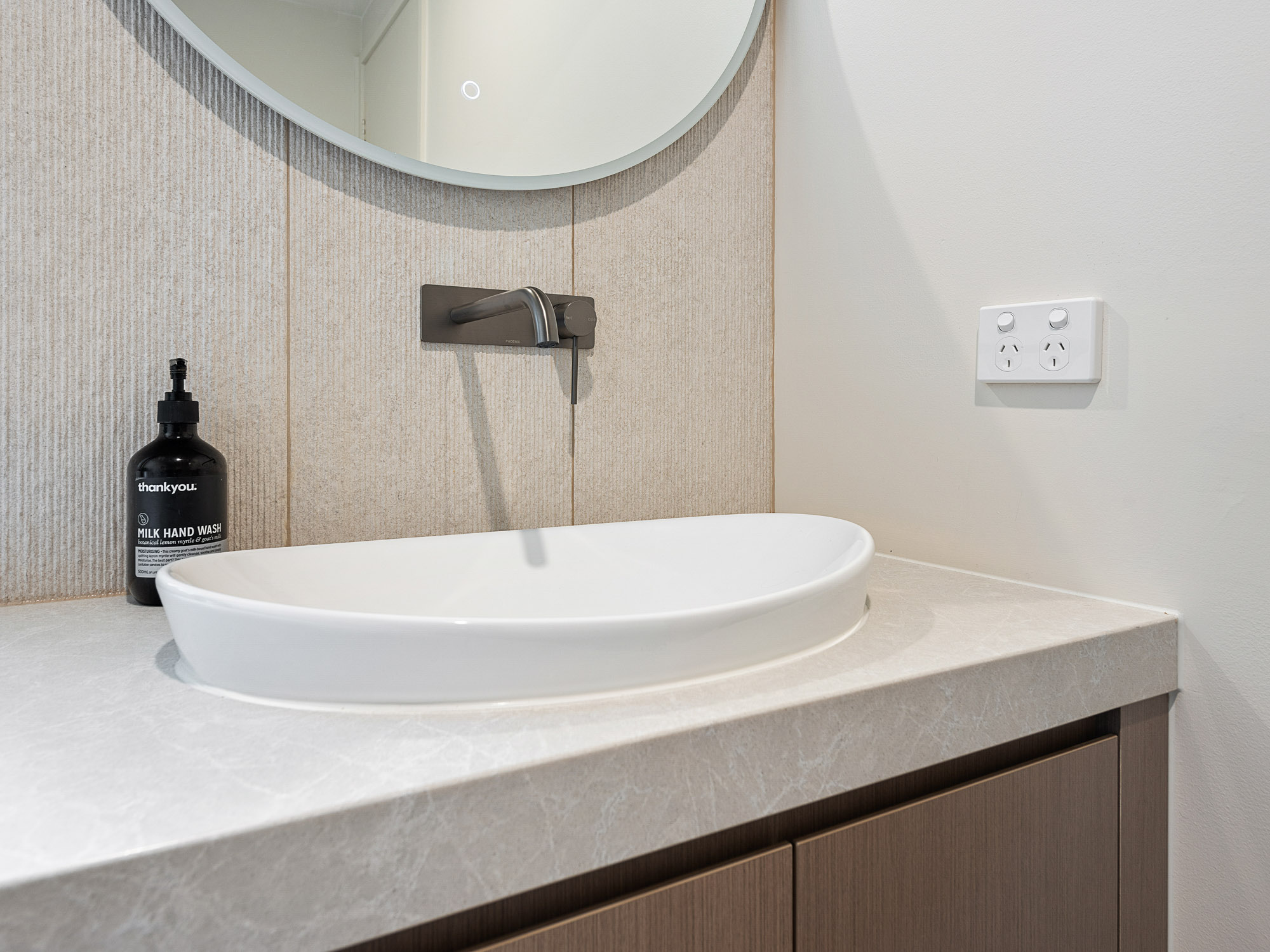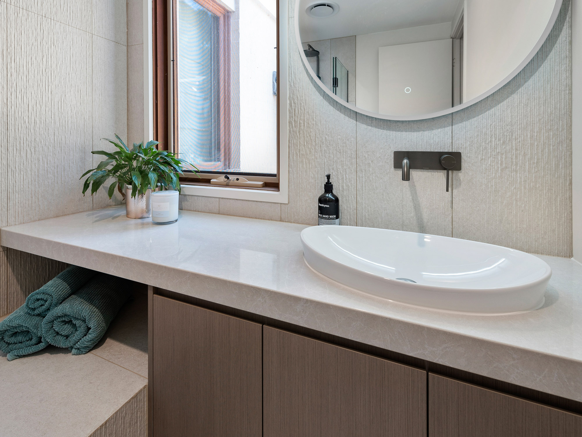 The timber-look Polytec vanity cabinetry adds organic warmth and contrasts subtly against the 60mm Caesarstone benchtop, which extends to create a bench and display nook under the window. A round, backlit Kado Aspect mirror above the vessel basin adds soft ambient light and sculptural presence.