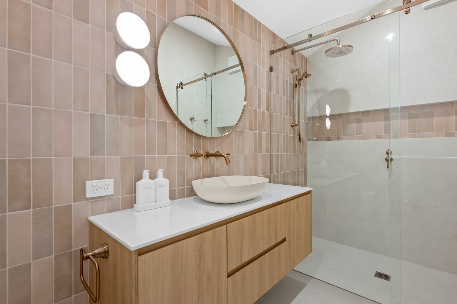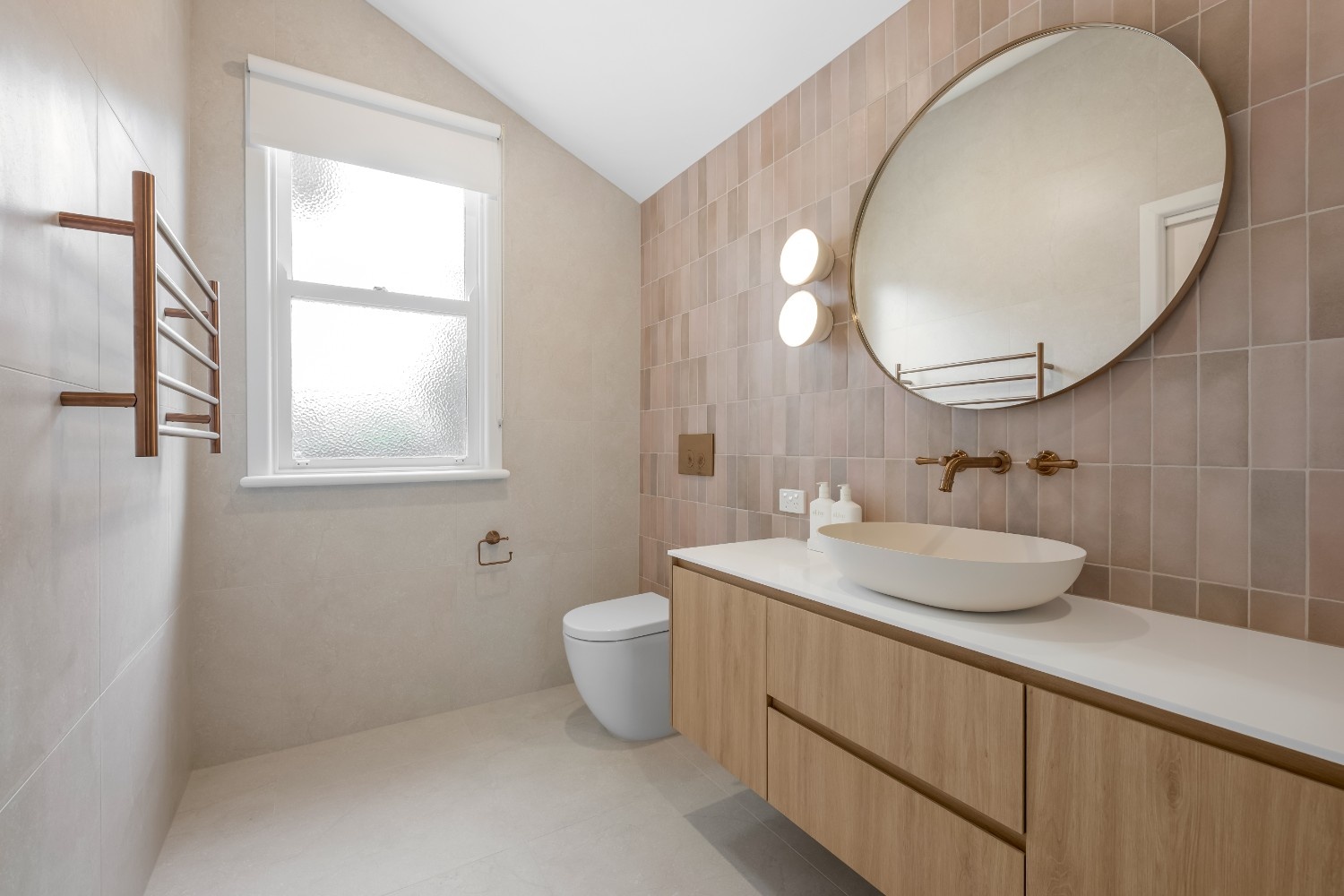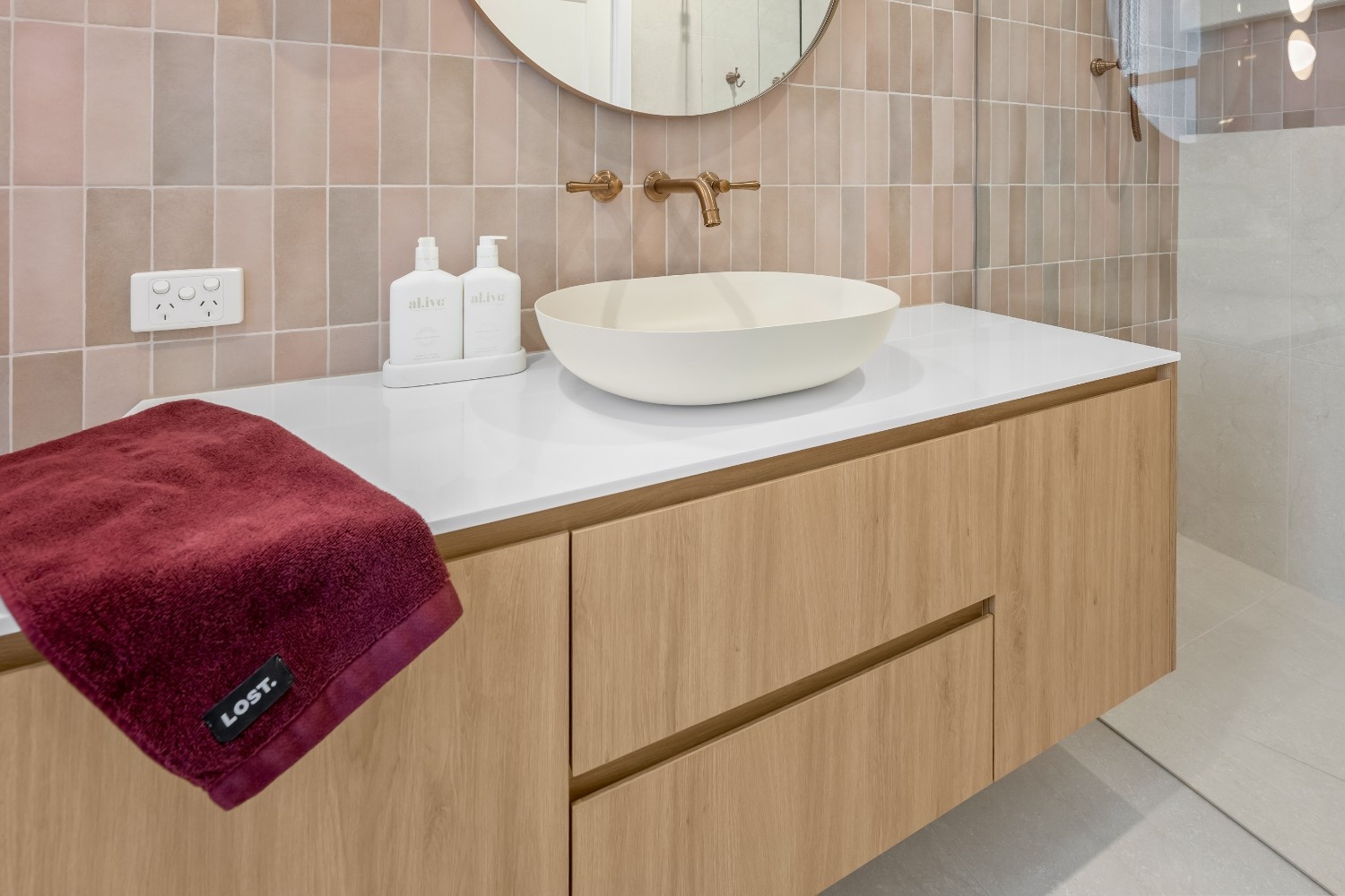 The design focuses on a contemporary aesthetic with a soothing neutral colour scheme. Light-toned tiles and natural wood cabinetry provide a warm, inviting atmosphere. The custom cabinetry in the vanity is meticulously crafted, offering a sleek and modern appearance while providing ample storage. The rounded mirror adds a touch of elegance, complementing the clean lines of the vanity.