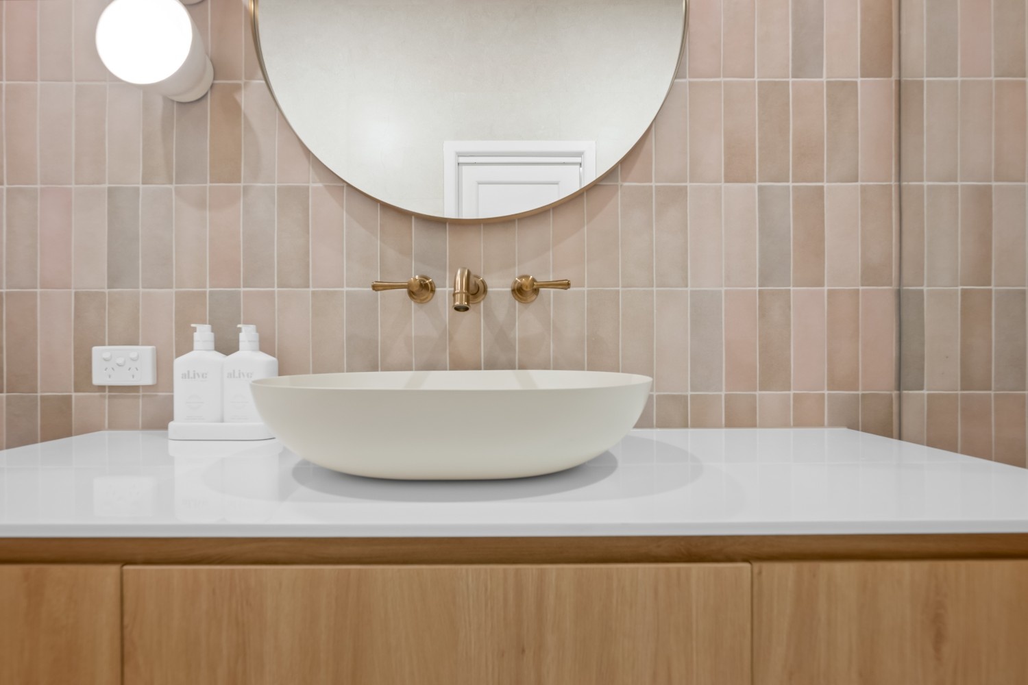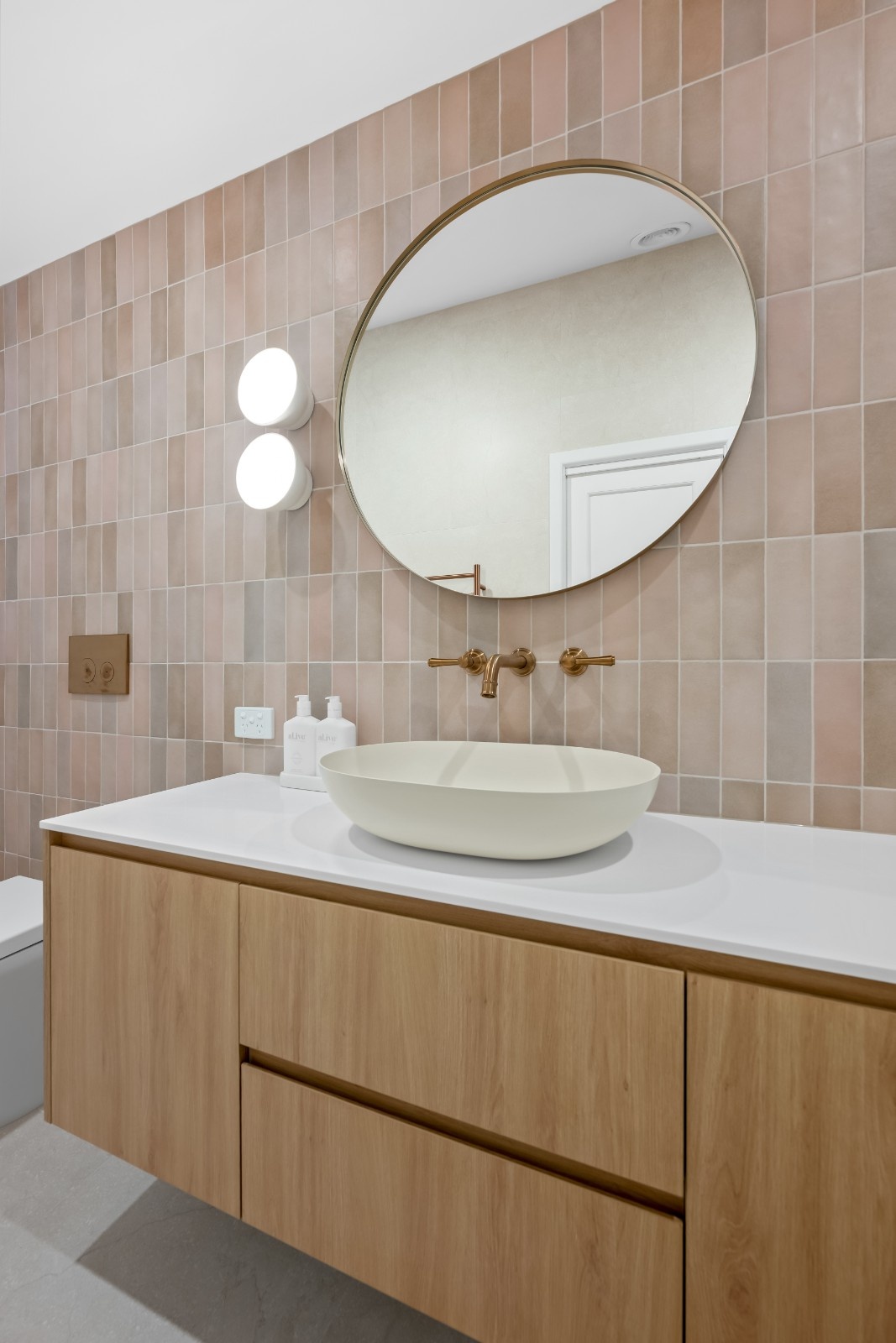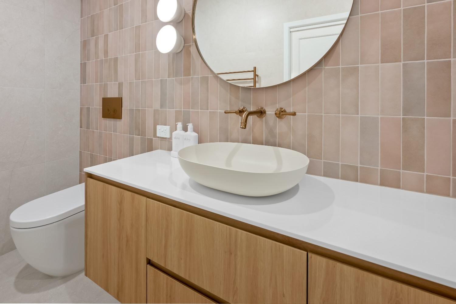 The design focuses on a contemporary aesthetic with a soothing neutral colour scheme. Light-toned tiles and natural wood cabinetry provide a warm, inviting atmosphere. The custom cabinetry in the vanity is meticulously crafted, offering a sleek and modern appearance while providing ample storage. The rounded mirror adds a touch of elegance, complementing the clean lines of the vanity.
