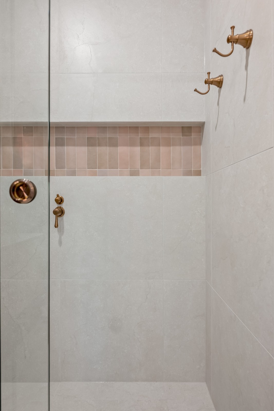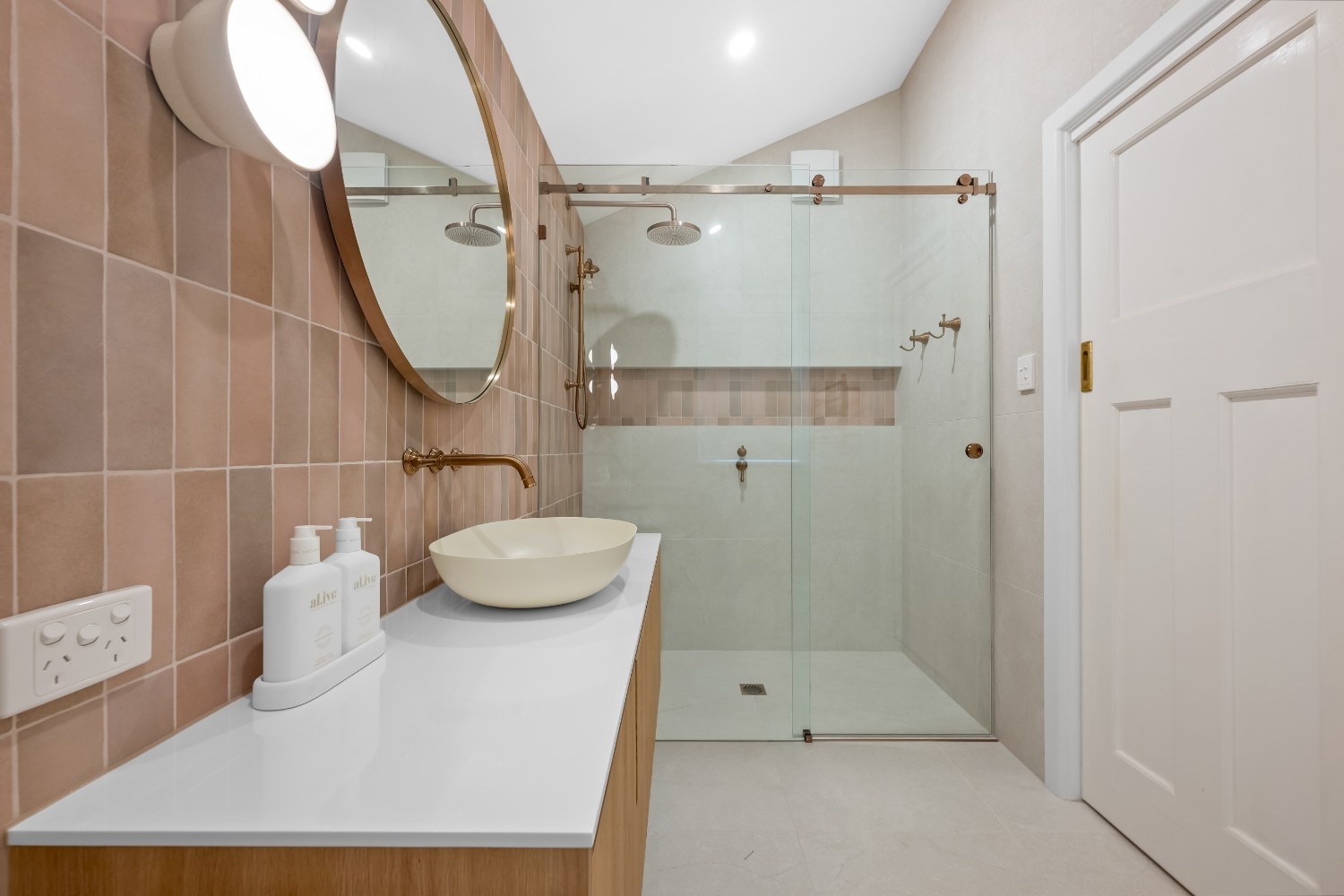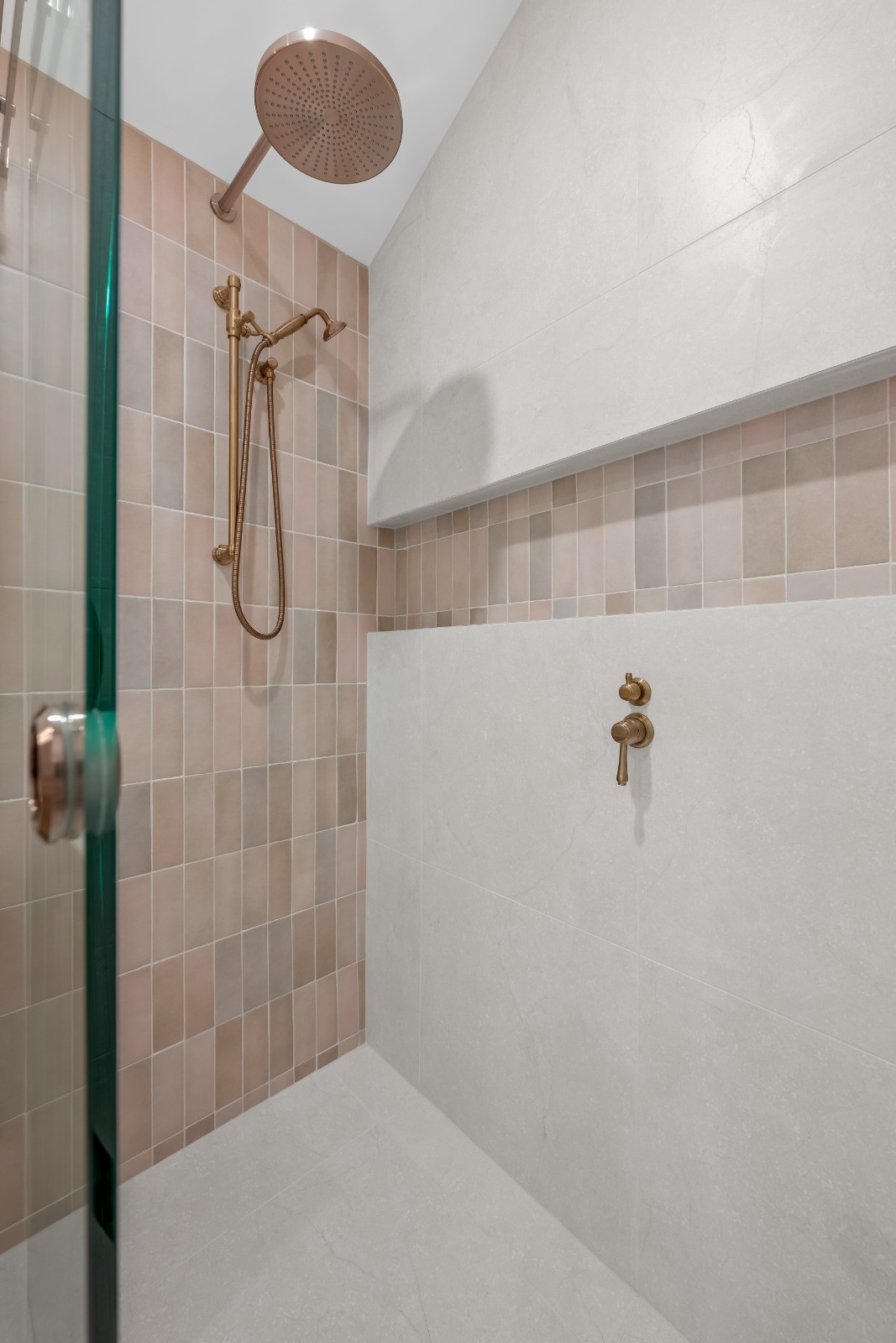 In the shower area, the combination of large format tiles with a pop of colour at the mid-wall offers both style and functionality. The dual shower heads provide versatility, ensuring a luxurious shower experience. The frameless glass screen further enhances the sleek, minimalistic look, allowing the space to feel open and airy.