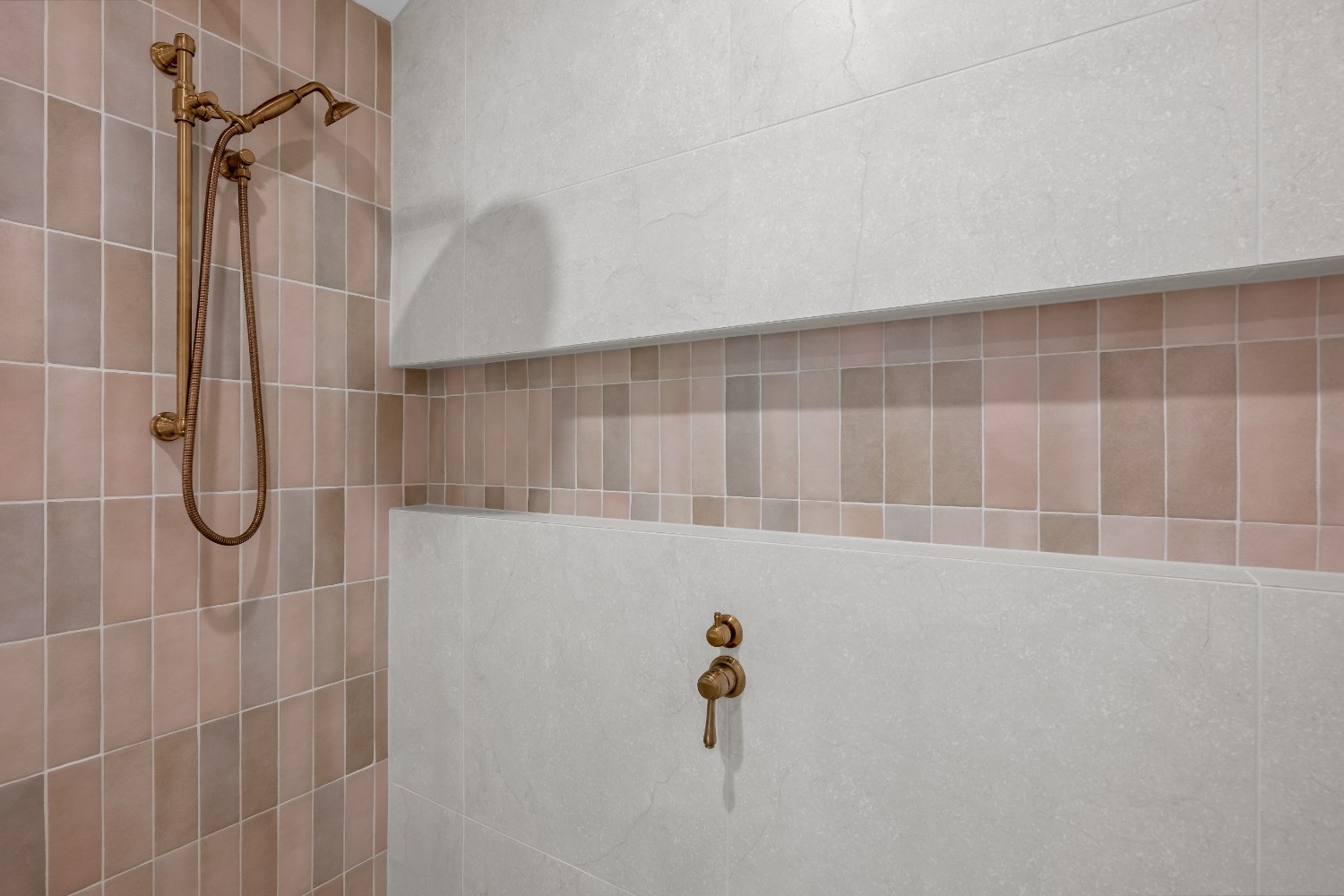 The unique feature wall, adorned with carefully arranged rectangular tiles, creates an eye-catching focal point while enhancing the spacious feel of the room. The high-quality brass fixtures and fittings, including the tapware and towel racks, inject a sense of timeless luxury, harmonizing with the soft hues of the tiles and cabinetry.