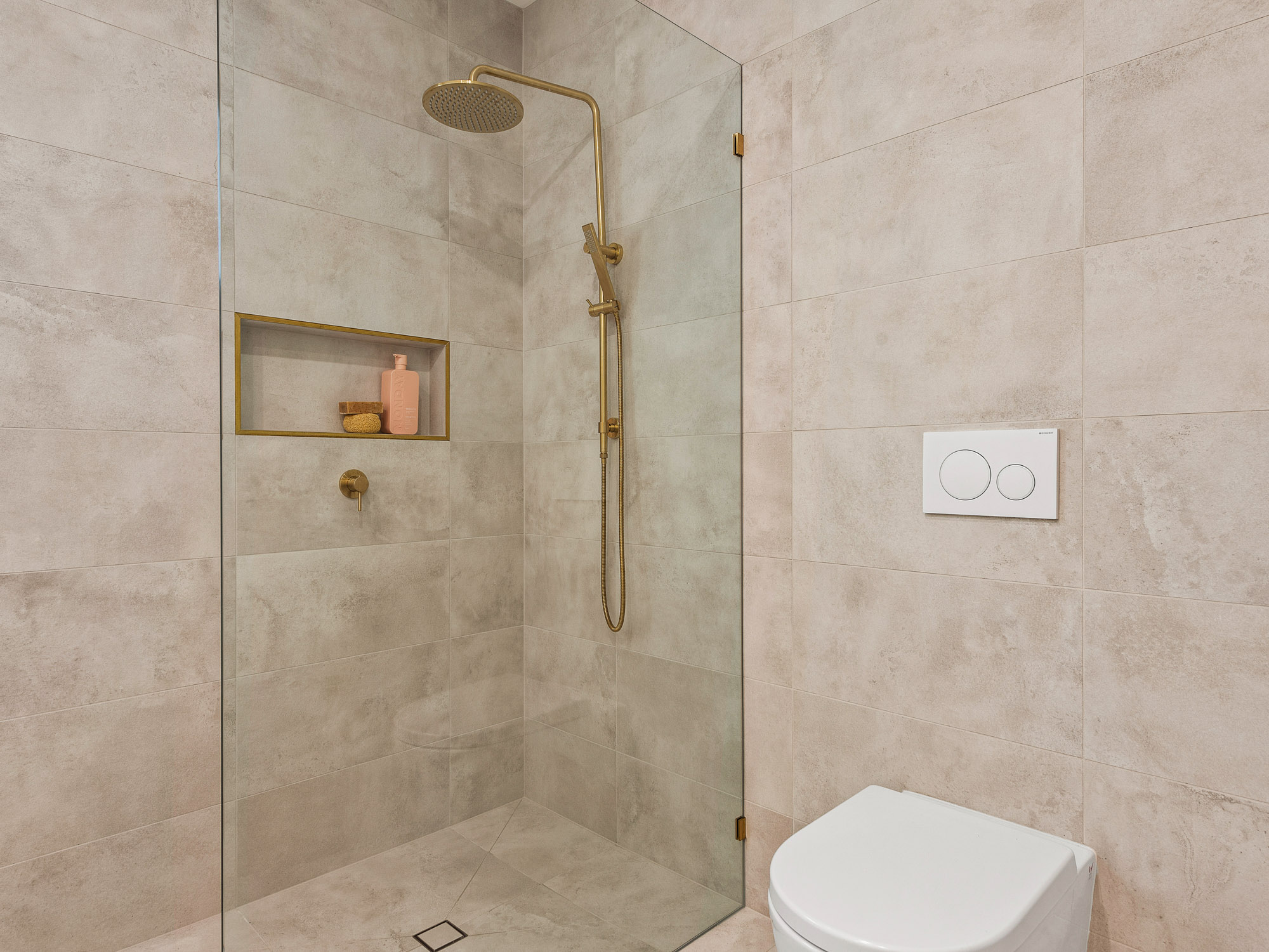Opposite, large-format concrete-look tiles line the floor and remaining walls, setting a serene, spa-like tone throughout. The walk-in shower features a sleek frameless glass screen and a matching niche framed in brass, tying in beautifully with the overhead rainfall shower and integrated handheld unit. A square tile insert drain keeps the look minimalist and cohesive, while clever tile placement ensures subtle continuity across every surface.