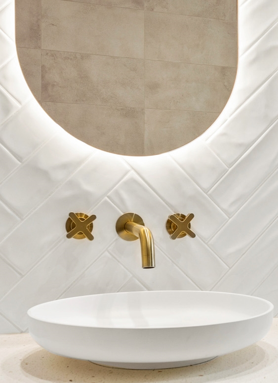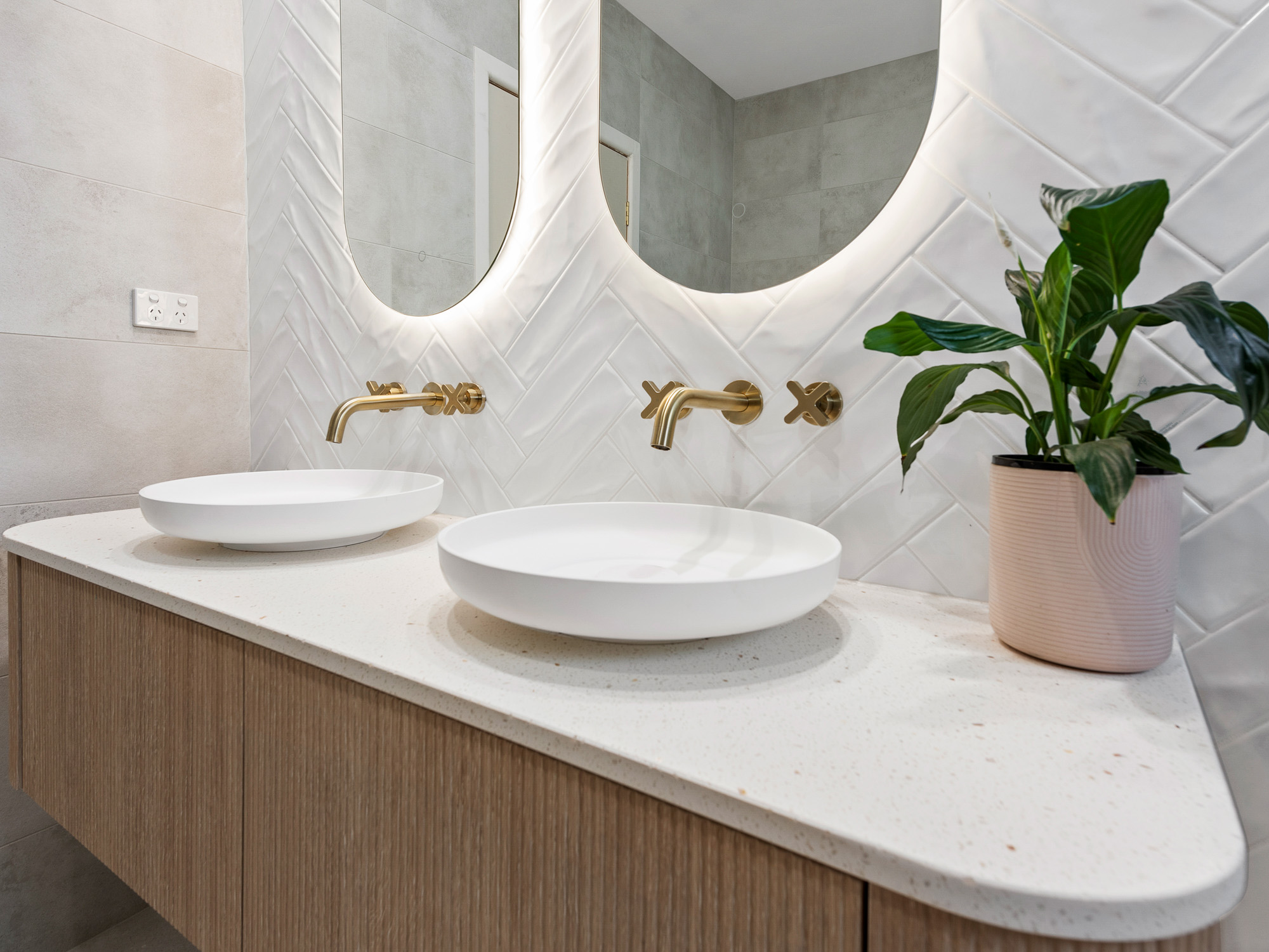 The heart of this transformation is the custom Allure Bathrooms 1500mm floating vanity. Finished in warm timber grain and topped with a stone benchtop, it features dual above-counter basins and wall-mounted brass tapware. The softly curved, backlit mirrors add dimension and ambience, perfectly framed by herringbone-laid white gloss tiles that span the entire vanity wall.