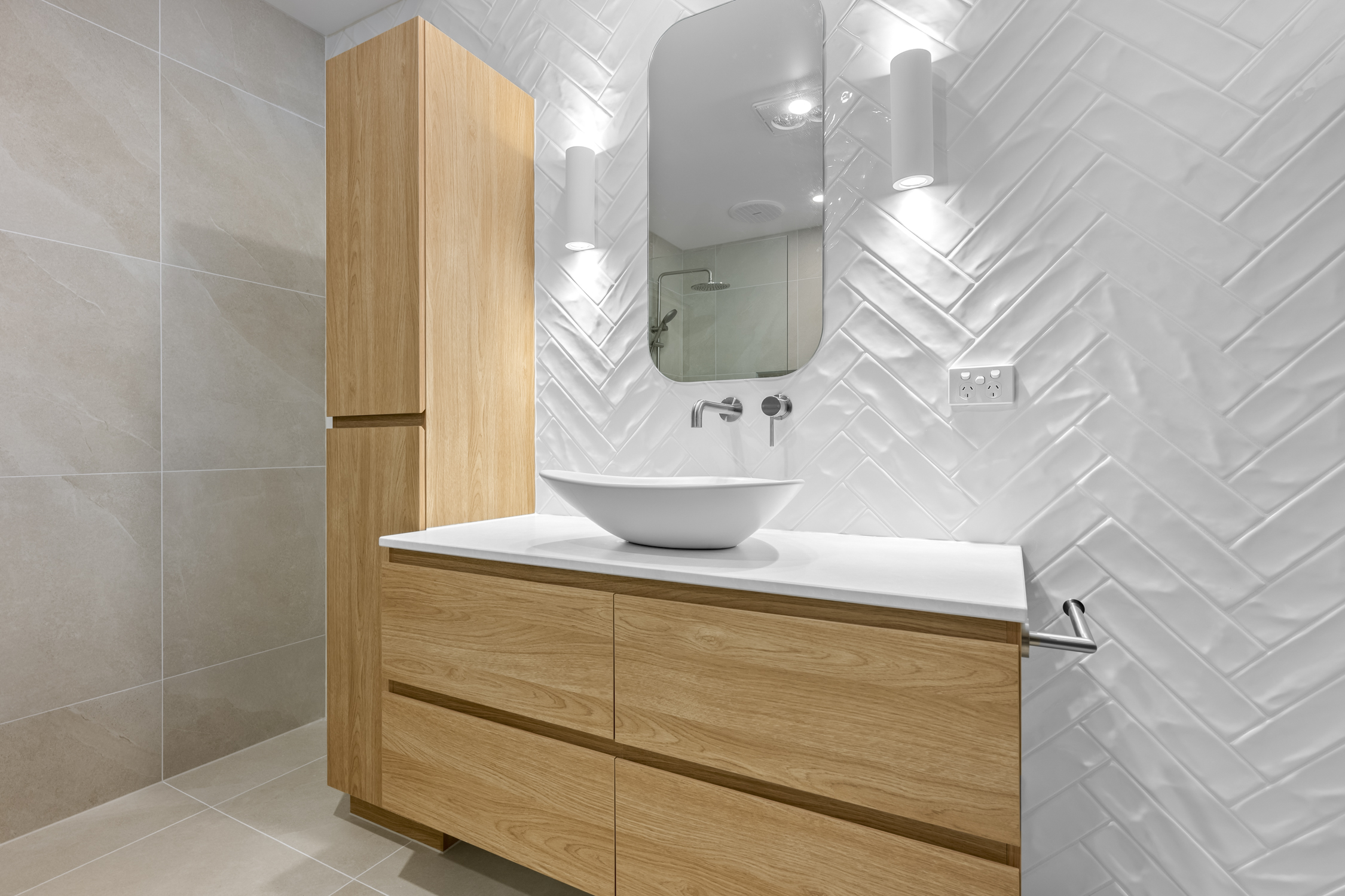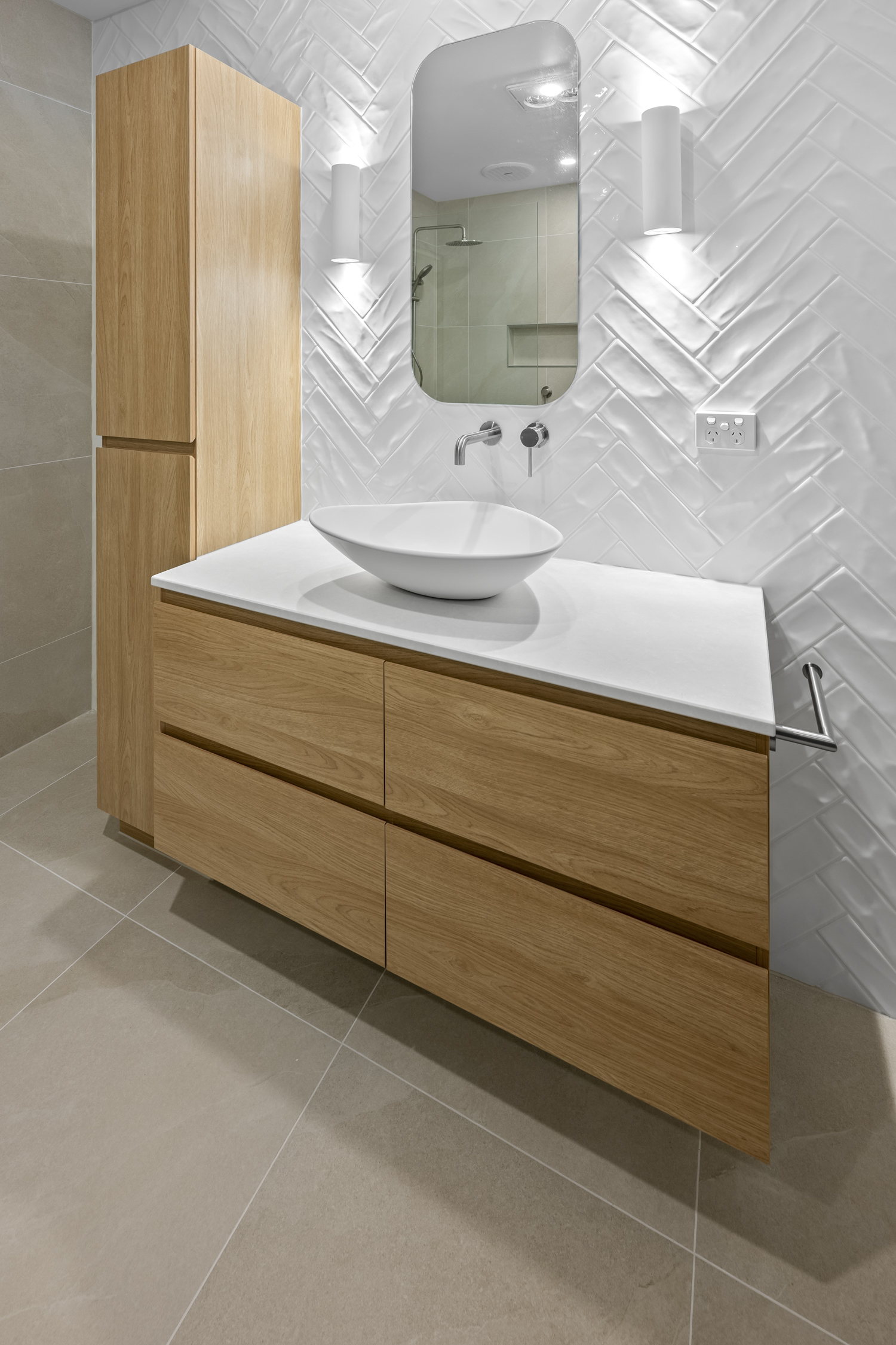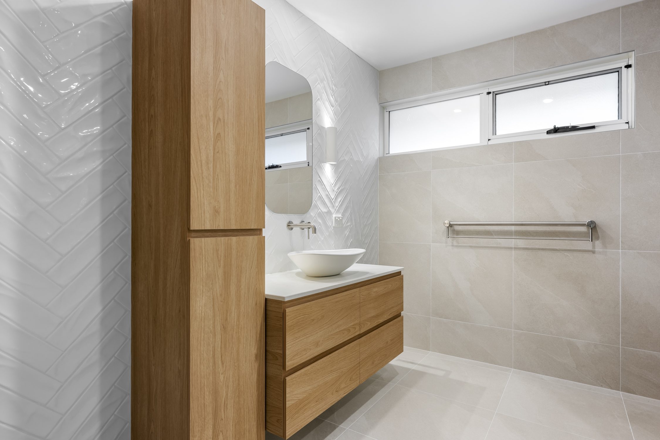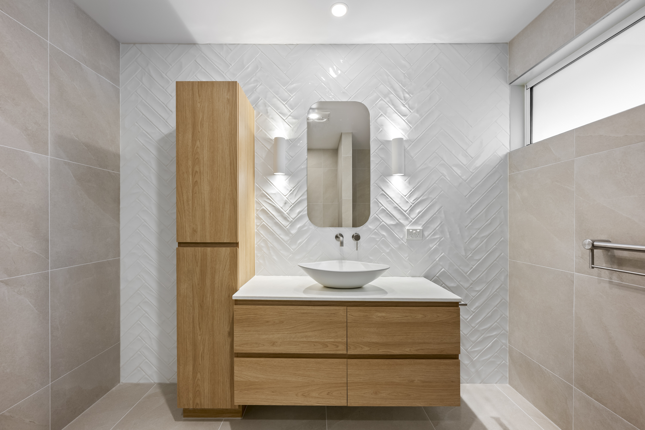 Custom cabinetry was a standout element of this renovation. A 1500mm wide floating vanity in natural timber tones, complete with a matching tallboy cabinet, provides ample storage while maintaining a clean, minimalist aesthetic. The vanity is topped with a sleek, white vessel basin and wall-mounted tapware, creating a refined focal point. Above it, a pencil-edge mirror framed by wall sconces brings both style and functionality, while the custom double-glazed window ensures natural light flows into the space.