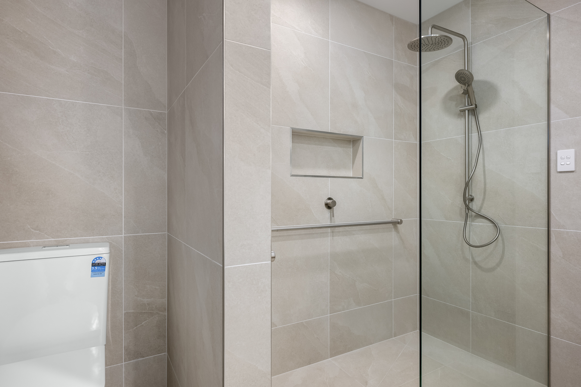 Accessibility and practicality were carefully considered, with grab rails integrated into the design without compromising on visual appeal. Additional details, such as a cavity sliding door, new ceiling resheeting, recessed niche shelving, and subtle lighting upgrades, elevate the overall atmosphere of the bathroom.