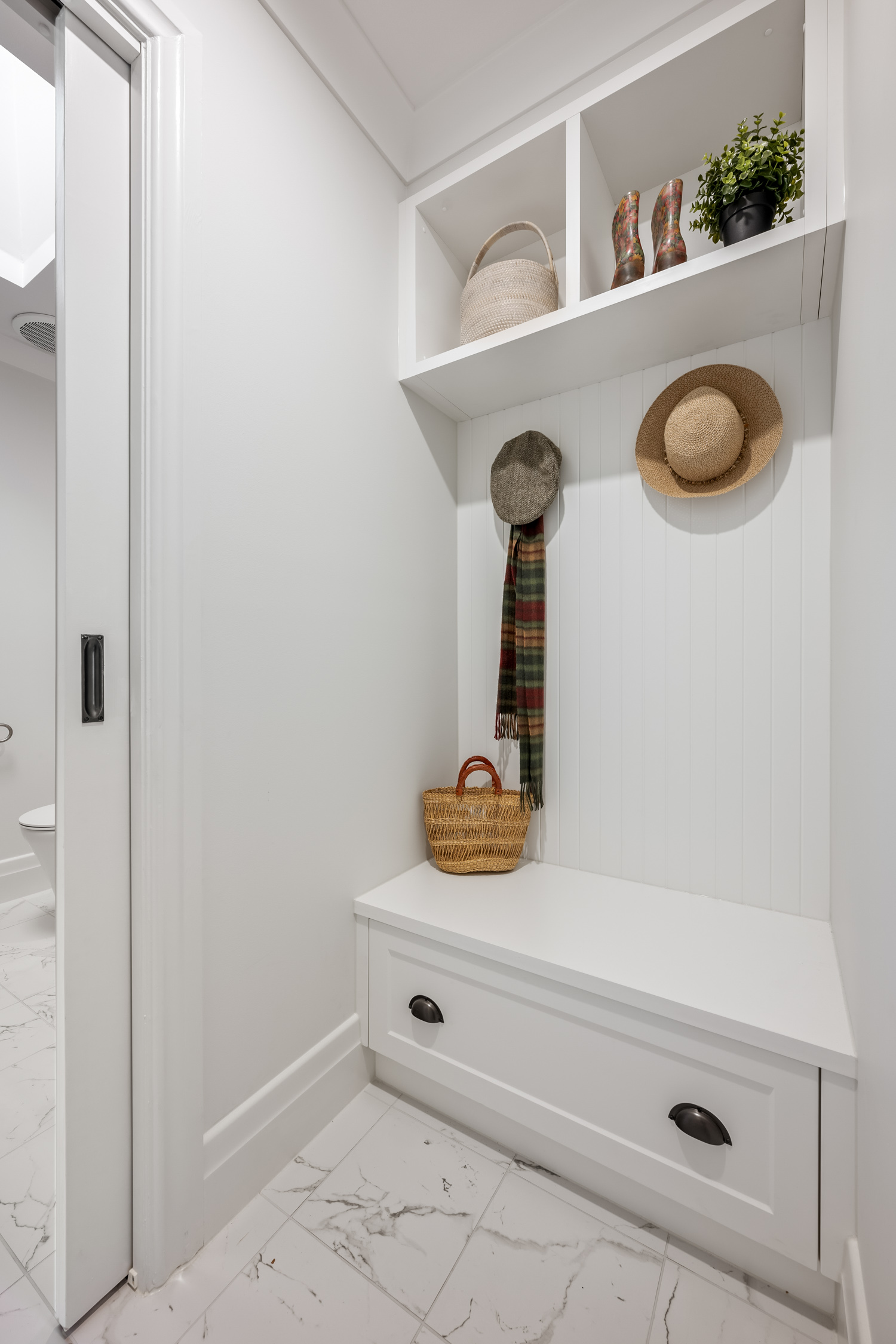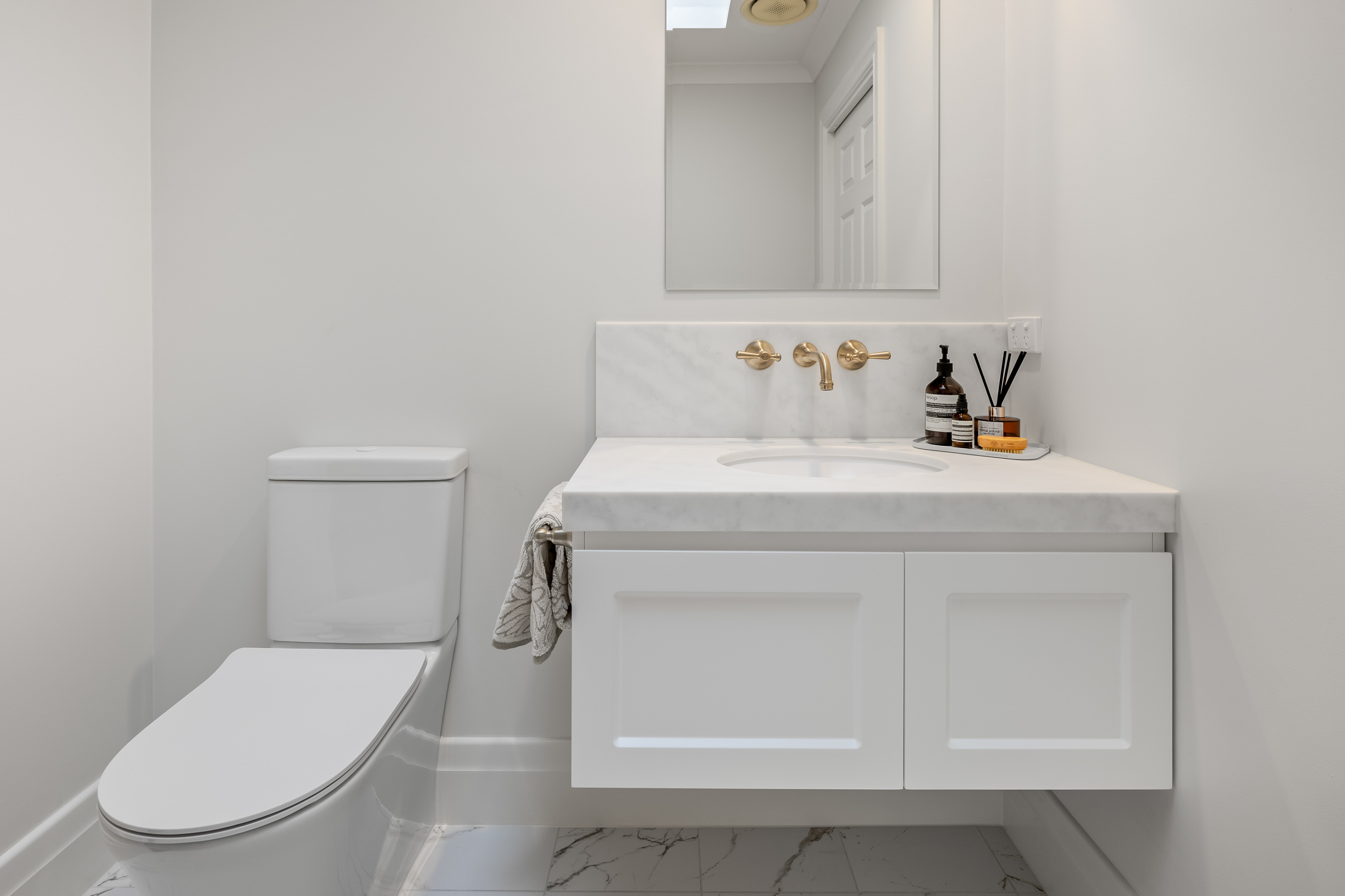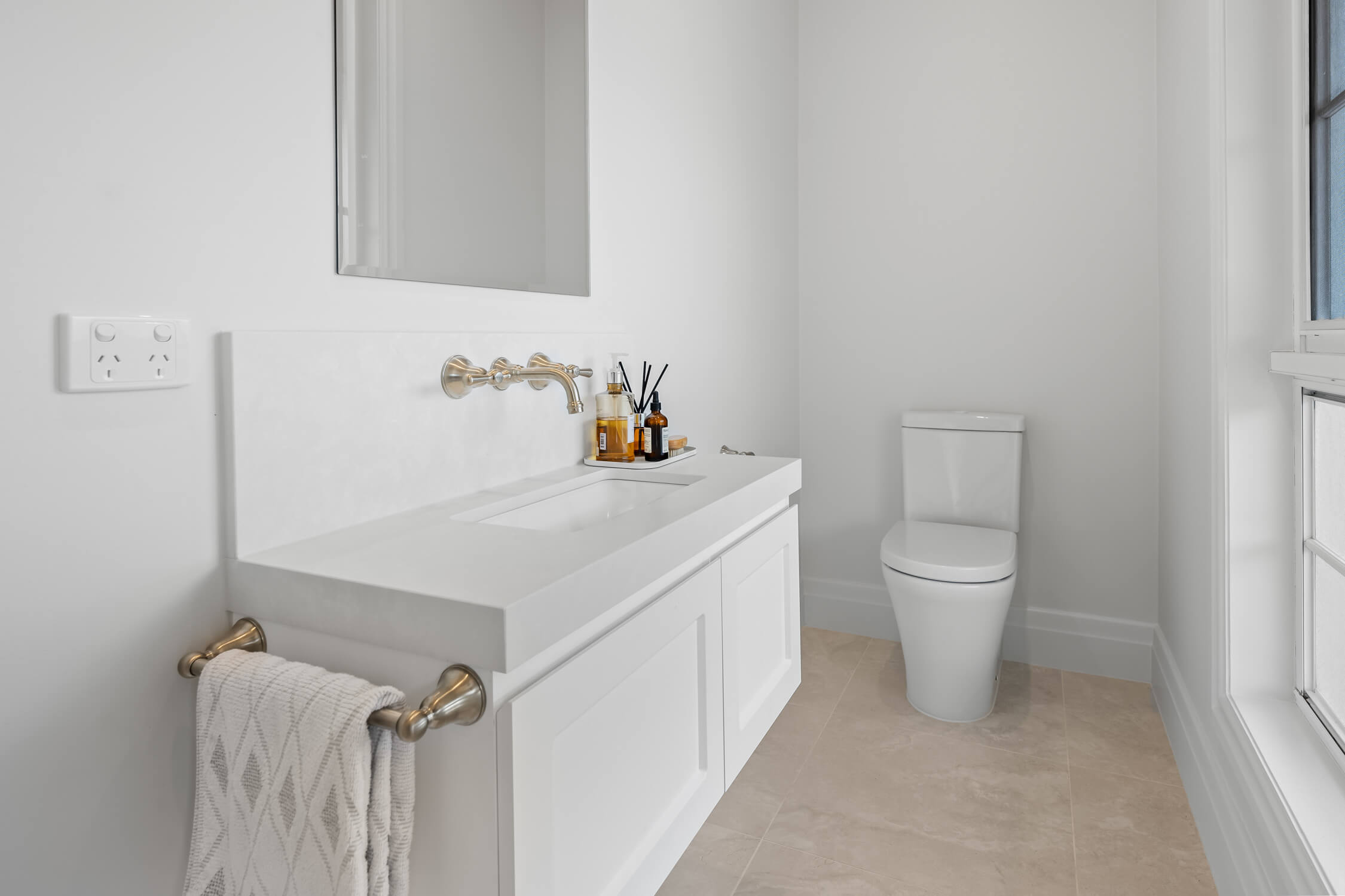 The powder room was updated with a compact vanity, wall-mounted fittings and a tiled splashback for a polished finish. Subtle touches such as hand towel holders, contemporary toilets and premium tapware unify the look across all spaces.