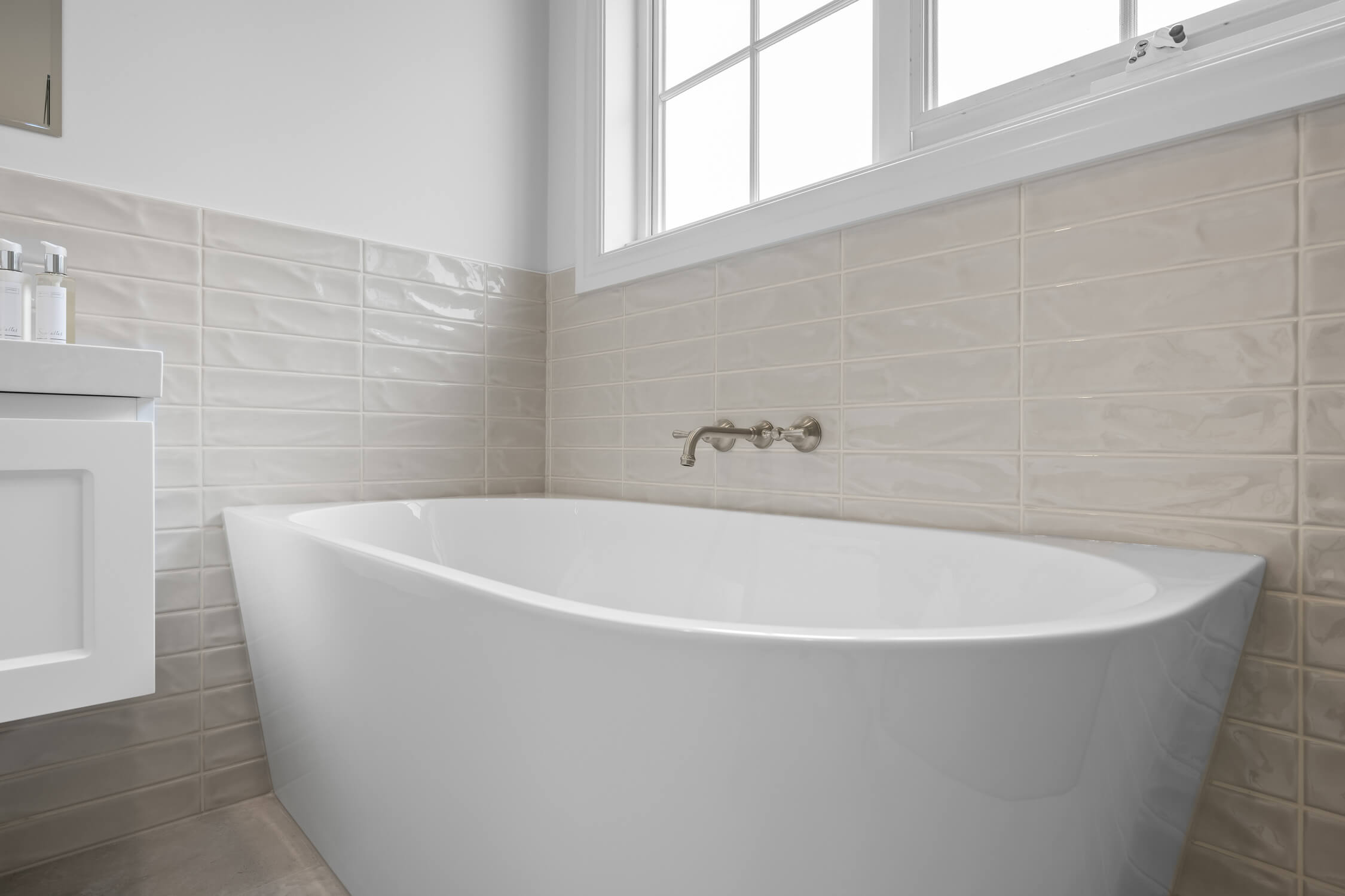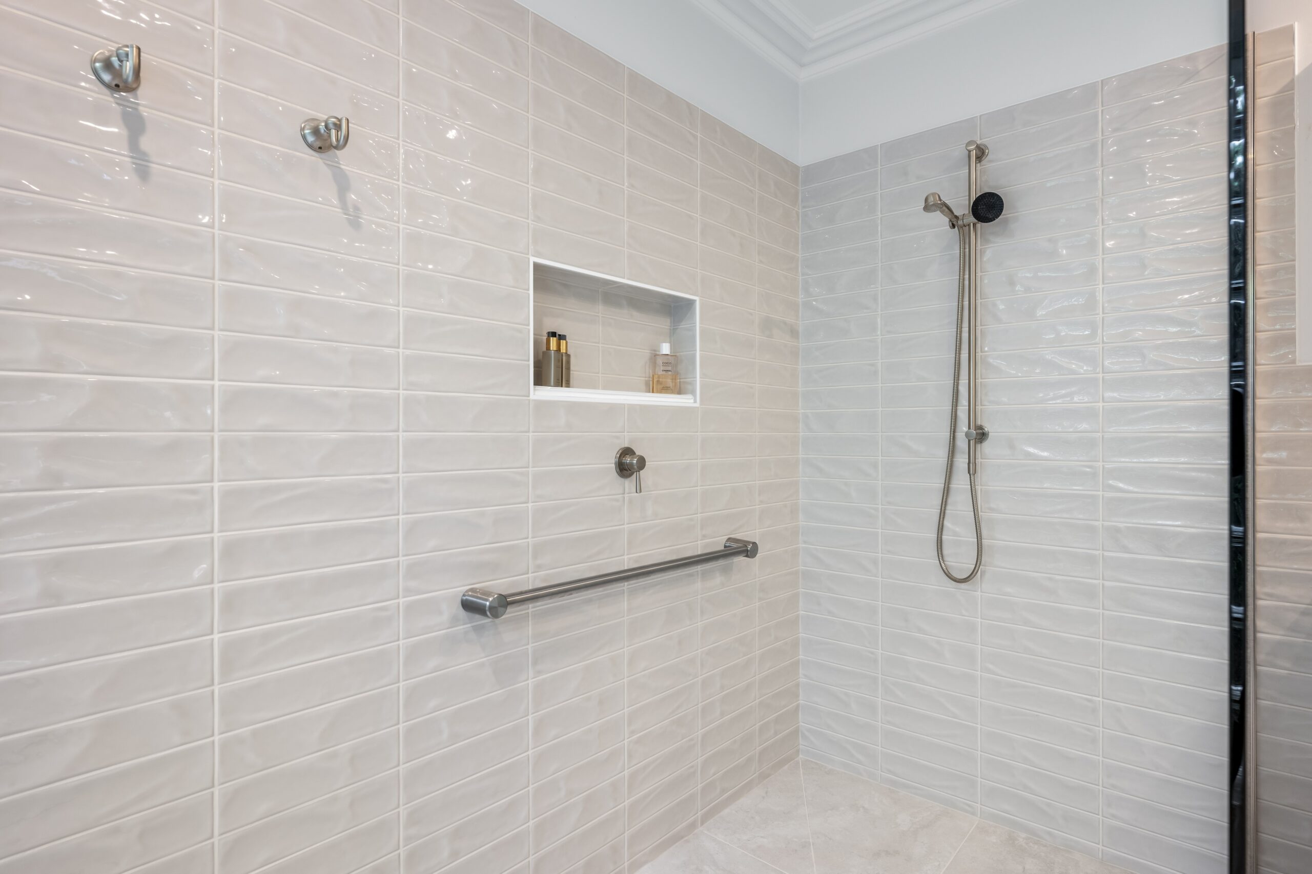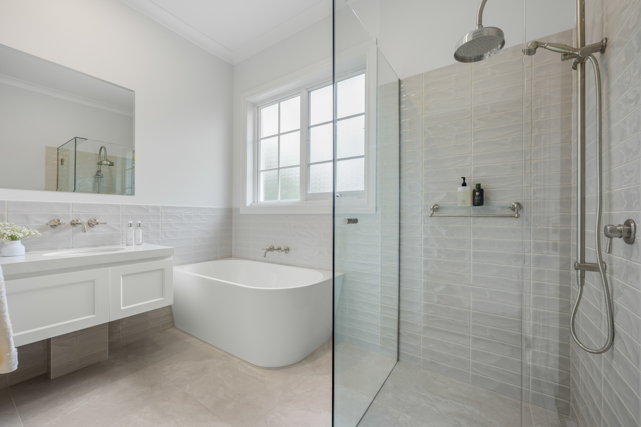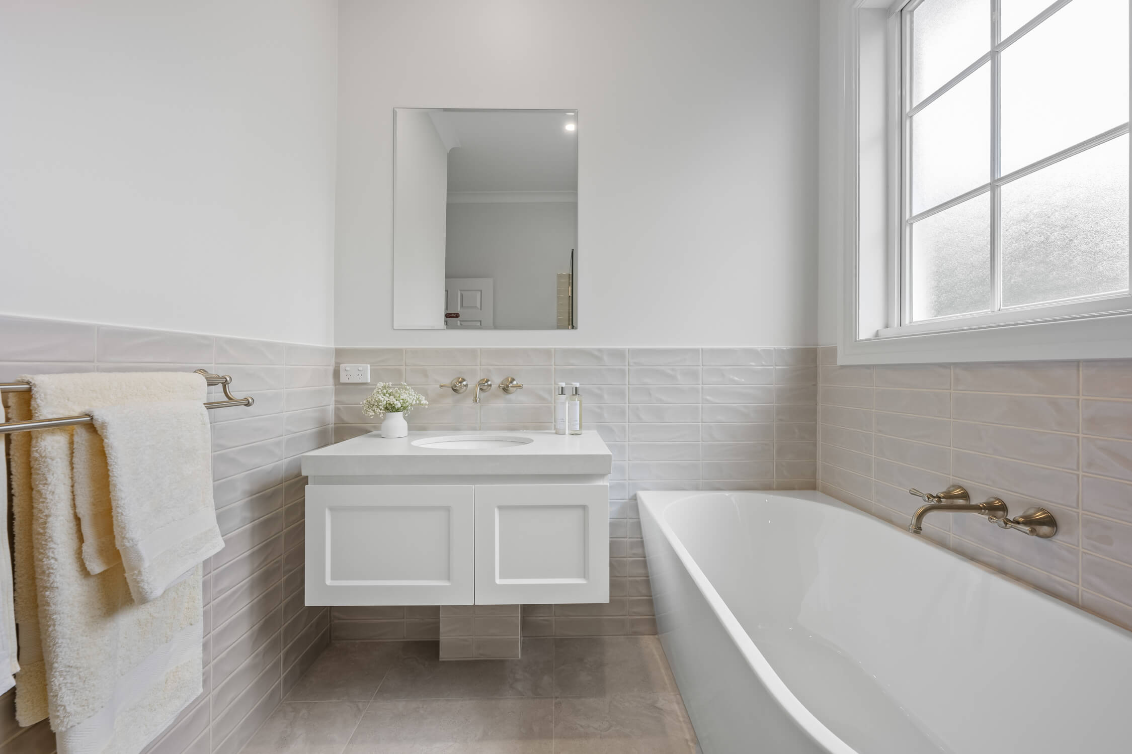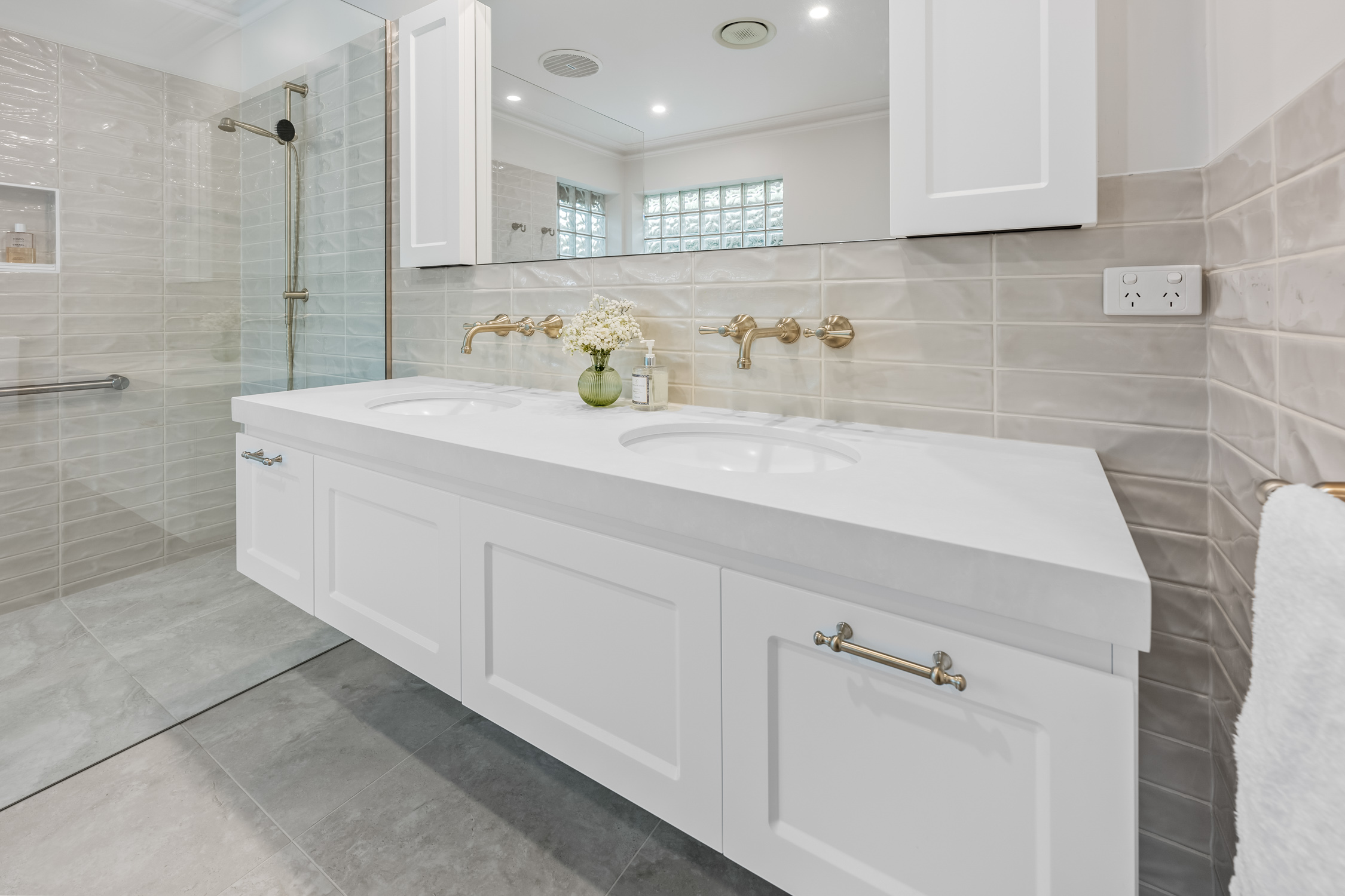 Throughout the renovation, Marlow Desert feature tiles were laid in a horizontal stack bond pattern, complemented by Artstone Bianco matt floor tiles. Decorative glass block windows add character and diffuse natural light, while epoxy grout was used for enhanced durability and resistance against moisture. Every element, from towel rails to lighting, has been curated to deliver a bathroom renovation that exudes understated luxury and long-term functionality.