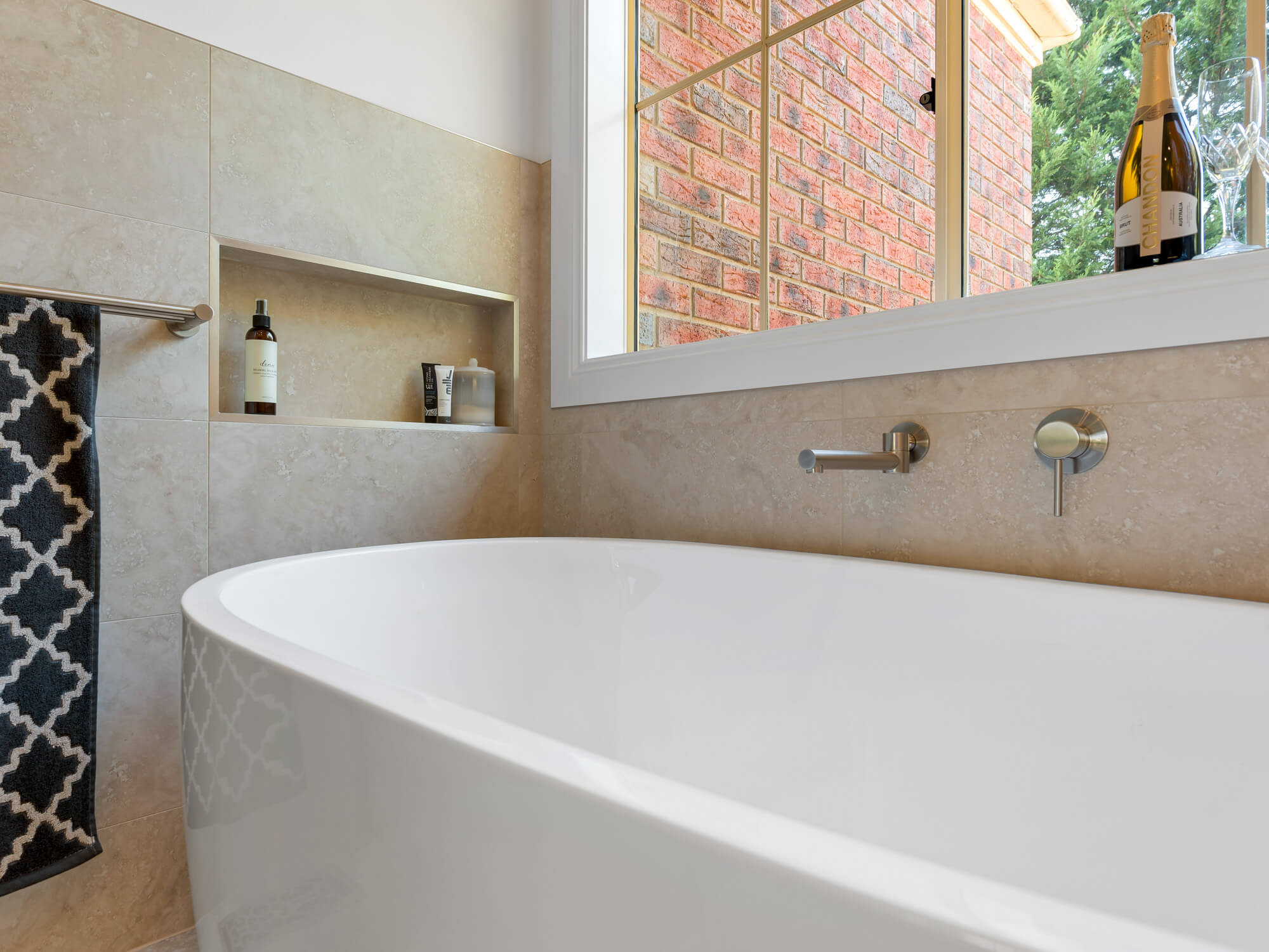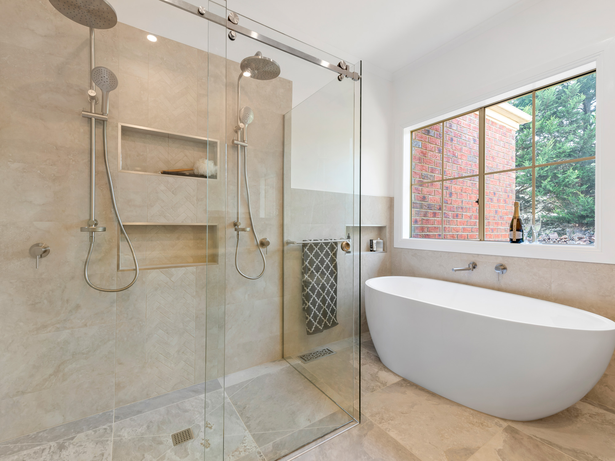 The freestanding bathtub is perfectly positioned under a large window, offering natural light and a sense of indulgence. An inset wall niche provides functional storage for bath essentials, while wall-mounted tapware maintains a clean, uncluttered look. In the shower, dual rainfall showerheads with adjustable rails ensure a spa-like experience, complemented by integrated niches for practicality. A frameless glass screen keeps the space open and airy.