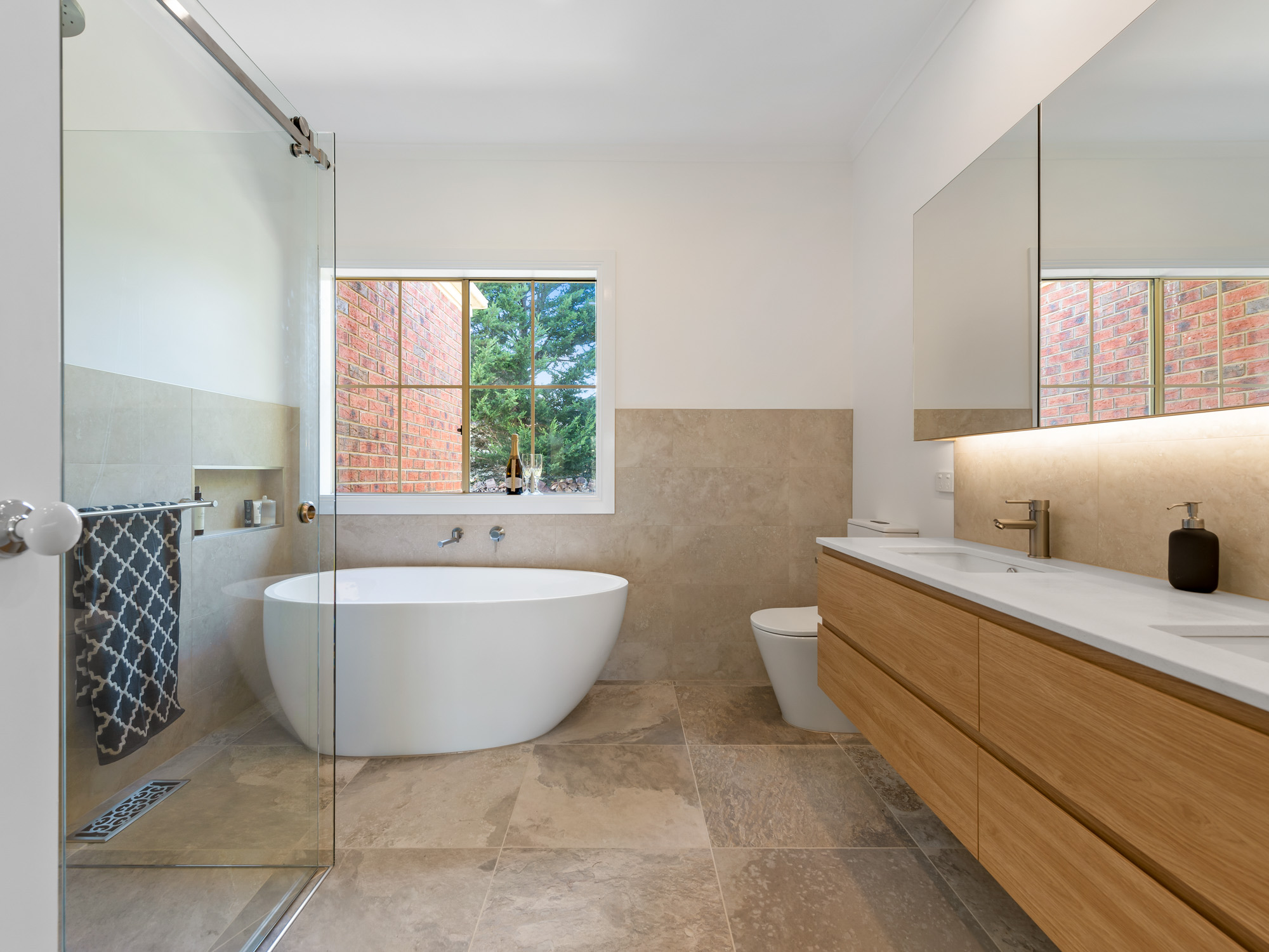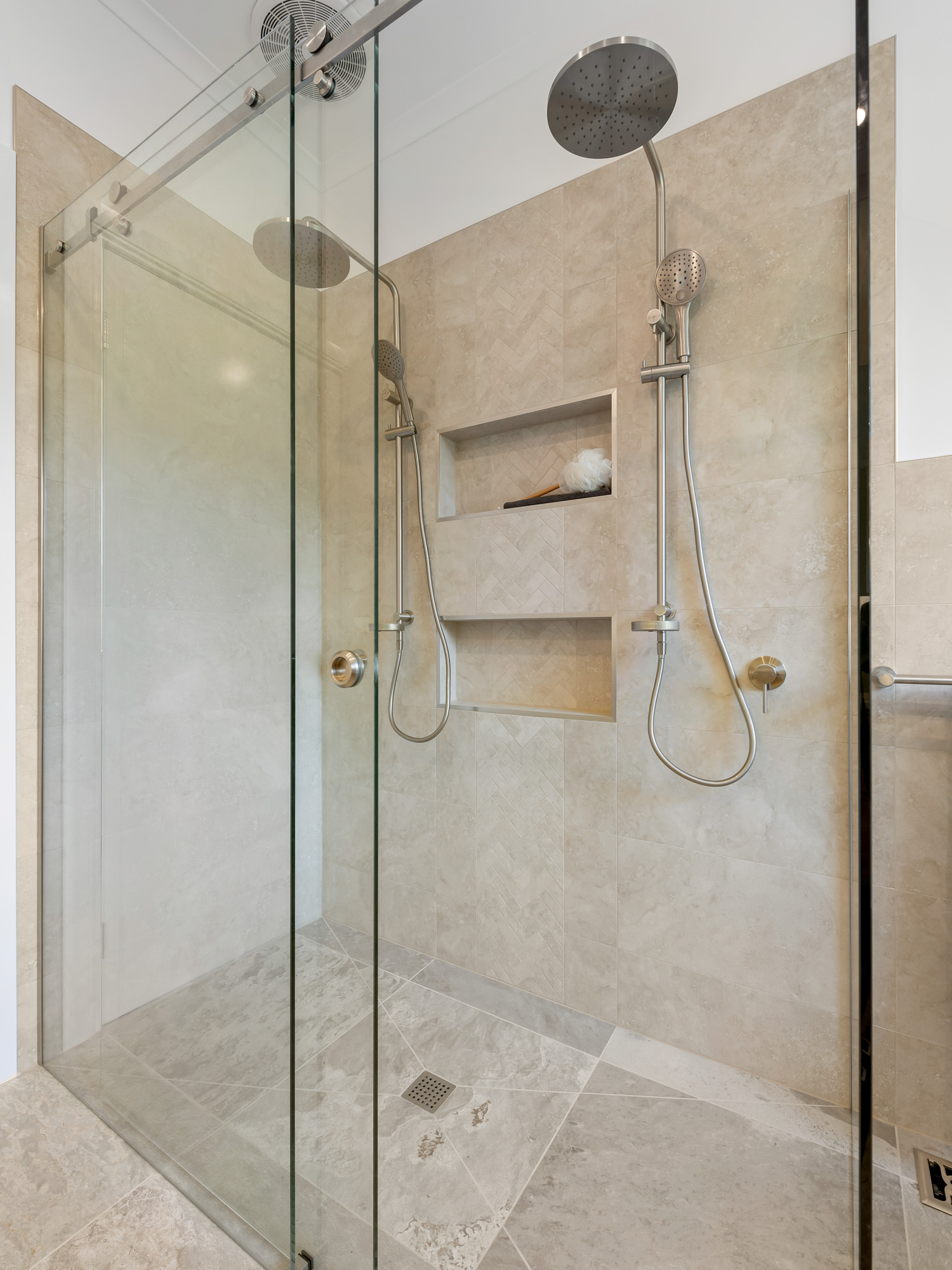 The renovation began with a full transformation of the space, incorporating waterproofing to all wet areas using the WEDI system to guarantee long-lasting performance. Large-format travertine ivory matt tiles were paired with a striking herringbone mosaic feature strip in the shower, bringing visual texture and warmth to the room. The flooring features a durable nut-toned tile with a slip-resistant finish, balancing safety with sophisticated appeal.