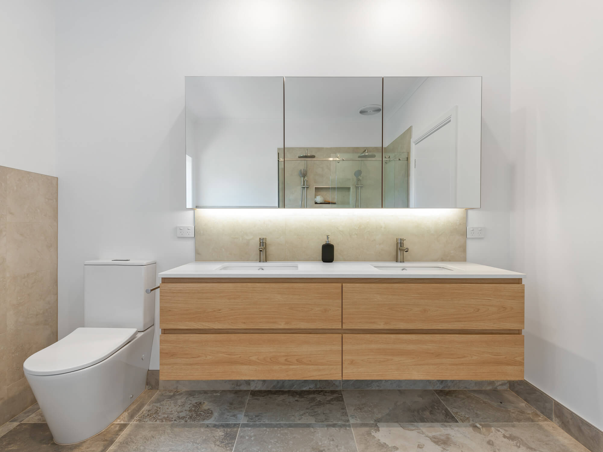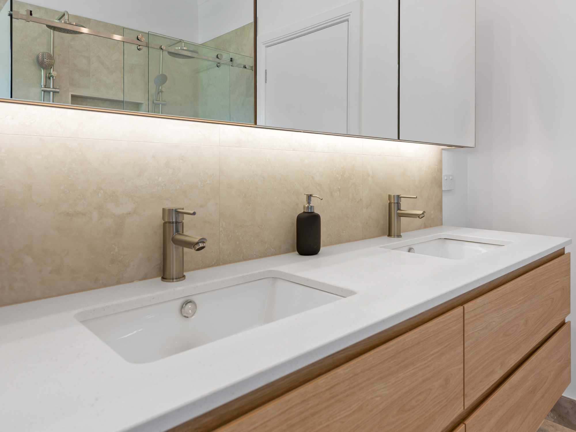 A custom floating vanity in natural timber tones anchors the design. Topped with a sleek white benchtop and dual undermount basins, it offers generous storage and a crisp, minimalist aesthetic. Above, a recessed mirrored shaving cabinet with built-in lighting and power points enhances convenience while providing a subtle, ambient glow.