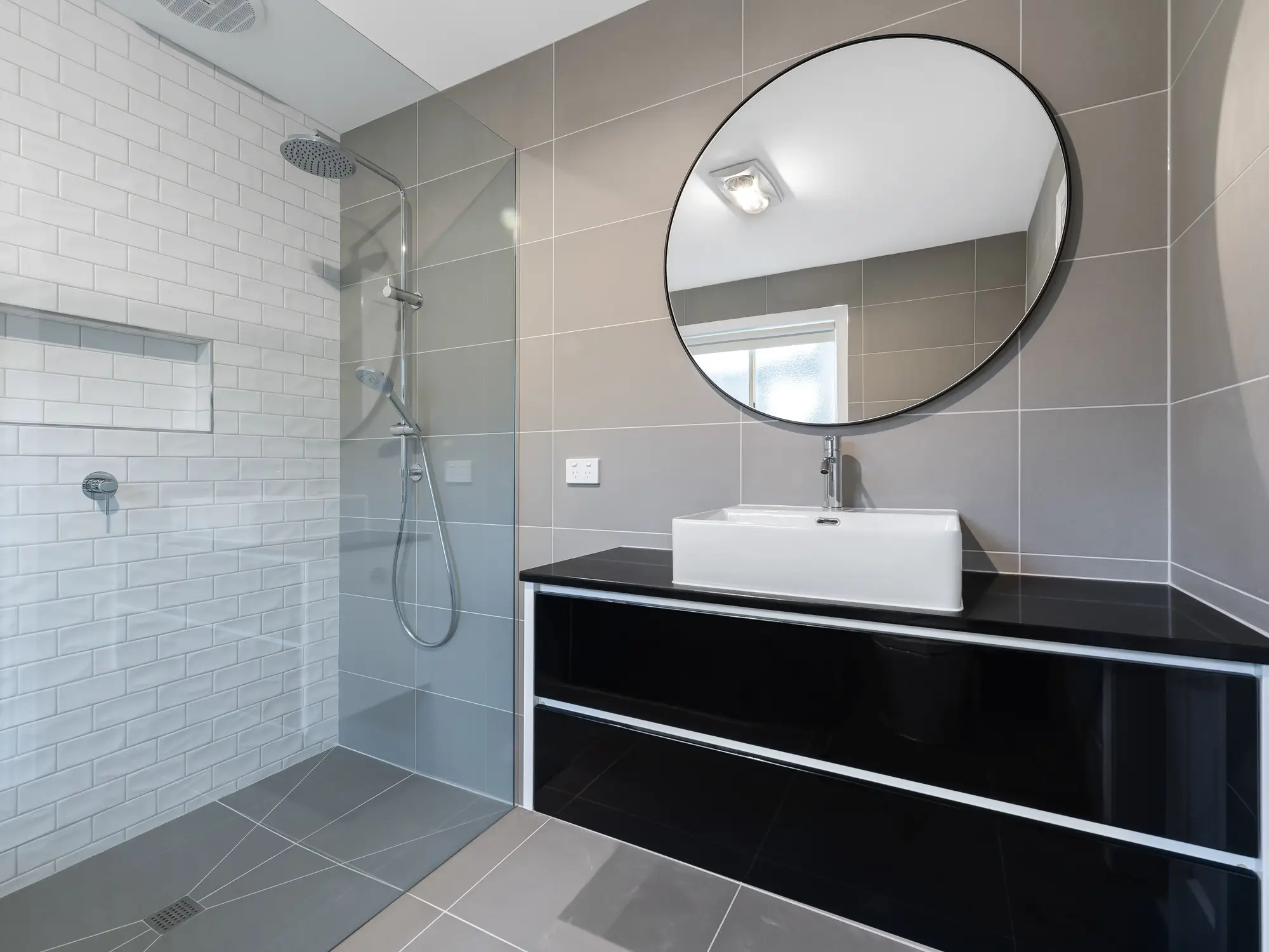 The vanity is a standout element, featuring a glossy black floating cabinet with crisp white framing, topped with a sleek black benchtop. A rectangular above-counter basin, paired with a polished chrome mixer, reinforces the contemporary aesthetic. Above, a large round mirror introduces softness to the otherwise geometric layout, reflecting light and enhancing the sense of space.