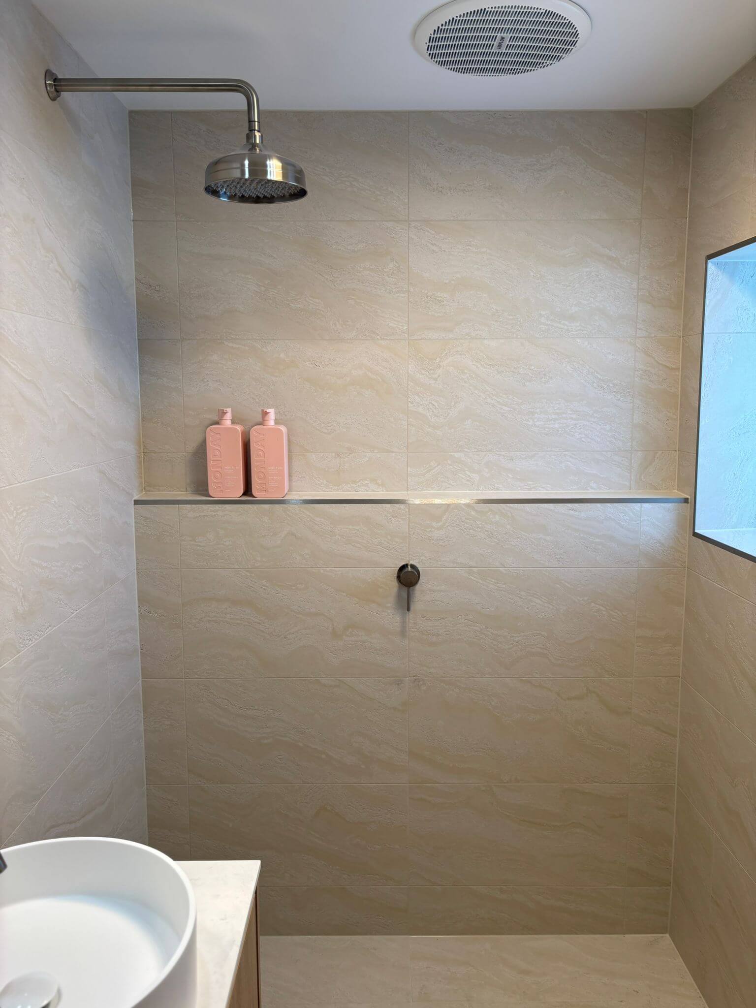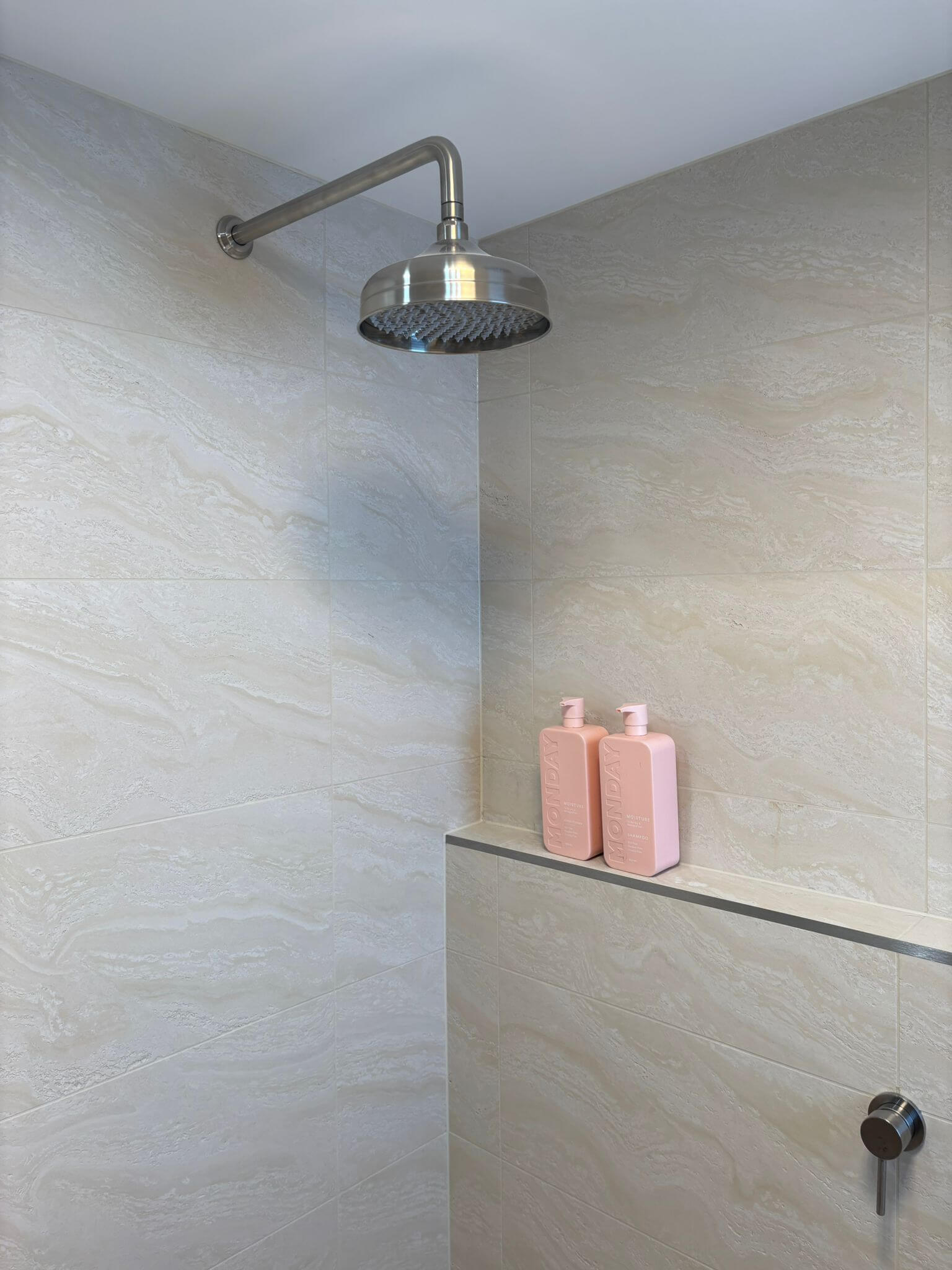 From the moment you step inside, the interplay of textures and tones sets the stage for an immersive experience. The soft, natural hues of the stone tiles envelop the walls and floors, their delicate veining adding organic movement to the space. This subtle backdrop allows the architectural elements—the floating vanity, vessel basin, and rainfall shower—to take centre stage, each piece contributing to a harmonious composition.