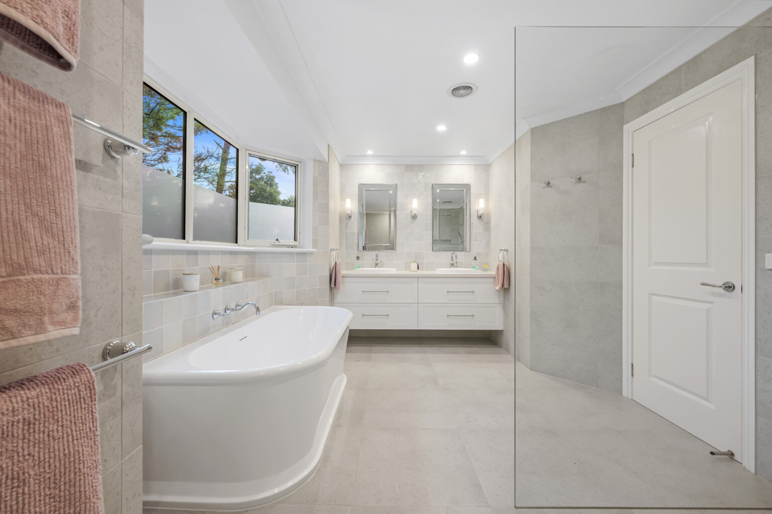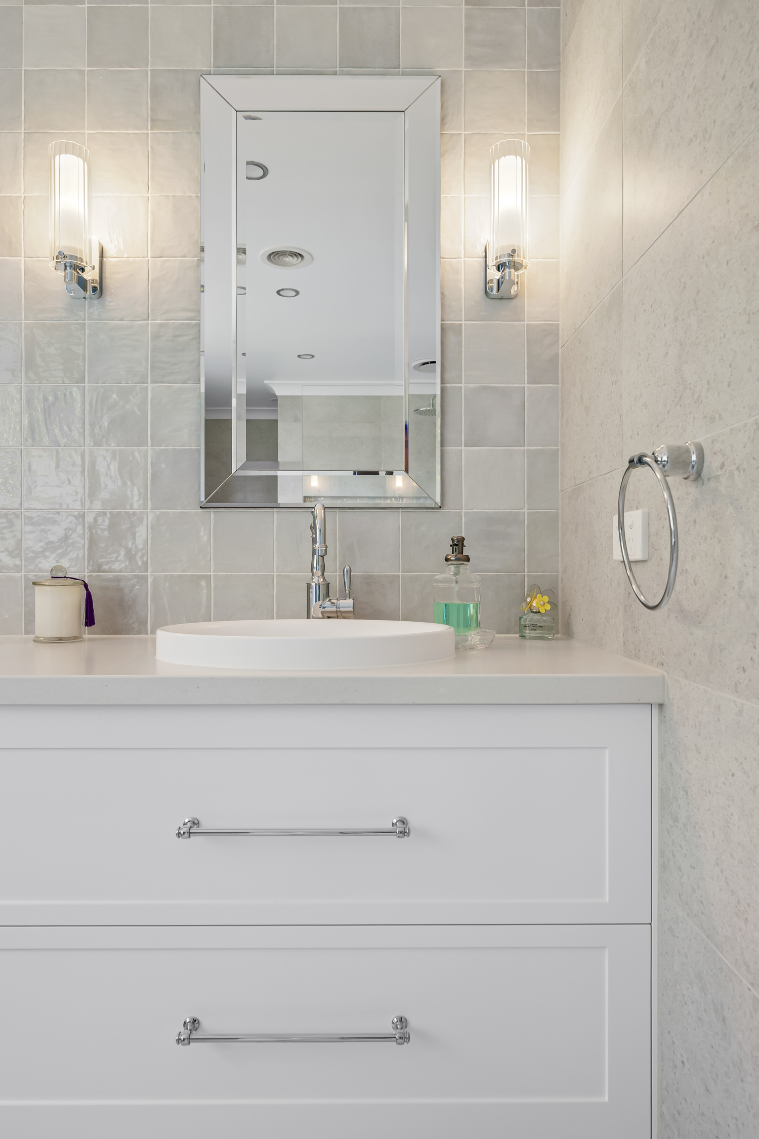 The renovation focuses on creating a serene and sophisticated environment. The full-height wall tiling, including a feature penny round tile on the vanity wall and around the bath area, brings a soft yet modern texture to the room. The tiles are laid in a horizontal stack bond pattern, adding a contemporary edge to the space. The floor is finished with epoxy grout, offering durability and water resistance for years to come.