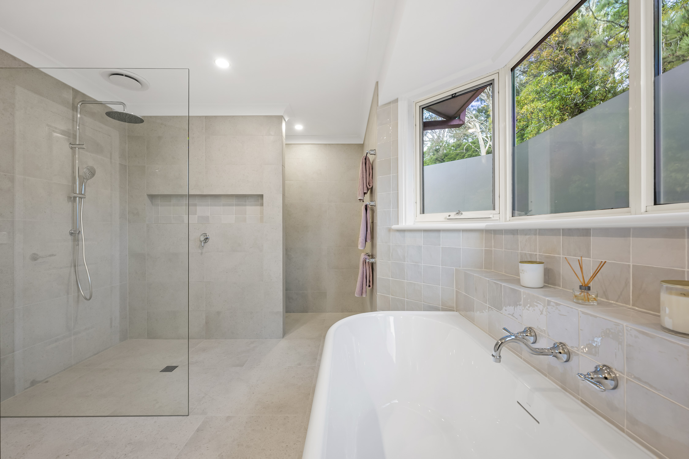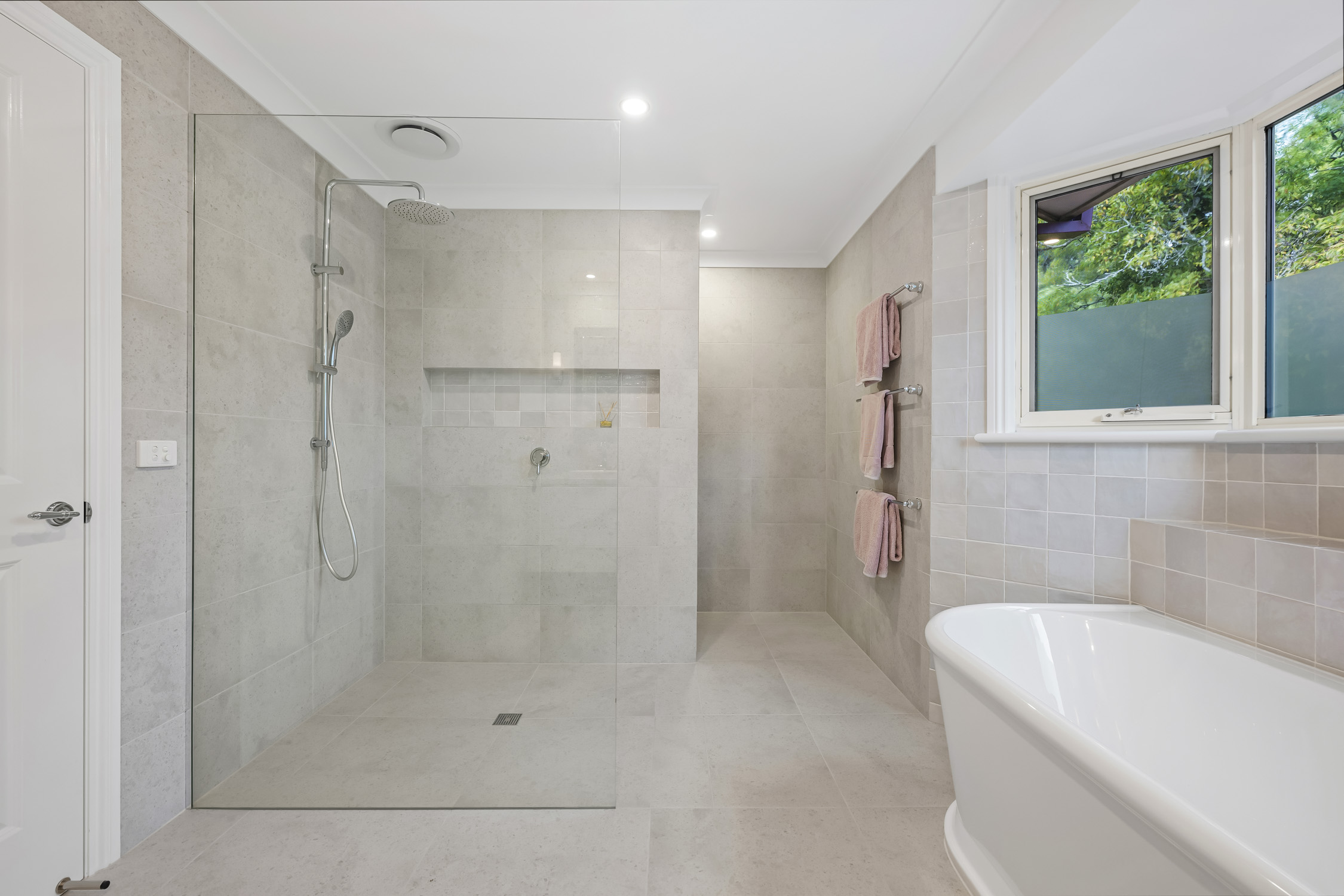 At the heart of this bathroom is a custom double vanity. The wall-hung design features 2 Pac Shaker doors with soft-close drawers and a 40mm stone benchtop. The vanity seamlessly integrates with the space, creating a perfect combination of style and practicality. The installation of a fully frameless, 1200mm wide shower screen enhances the clean lines of the bathroom, while the custom-built shower base provides a sleek, modern touch.