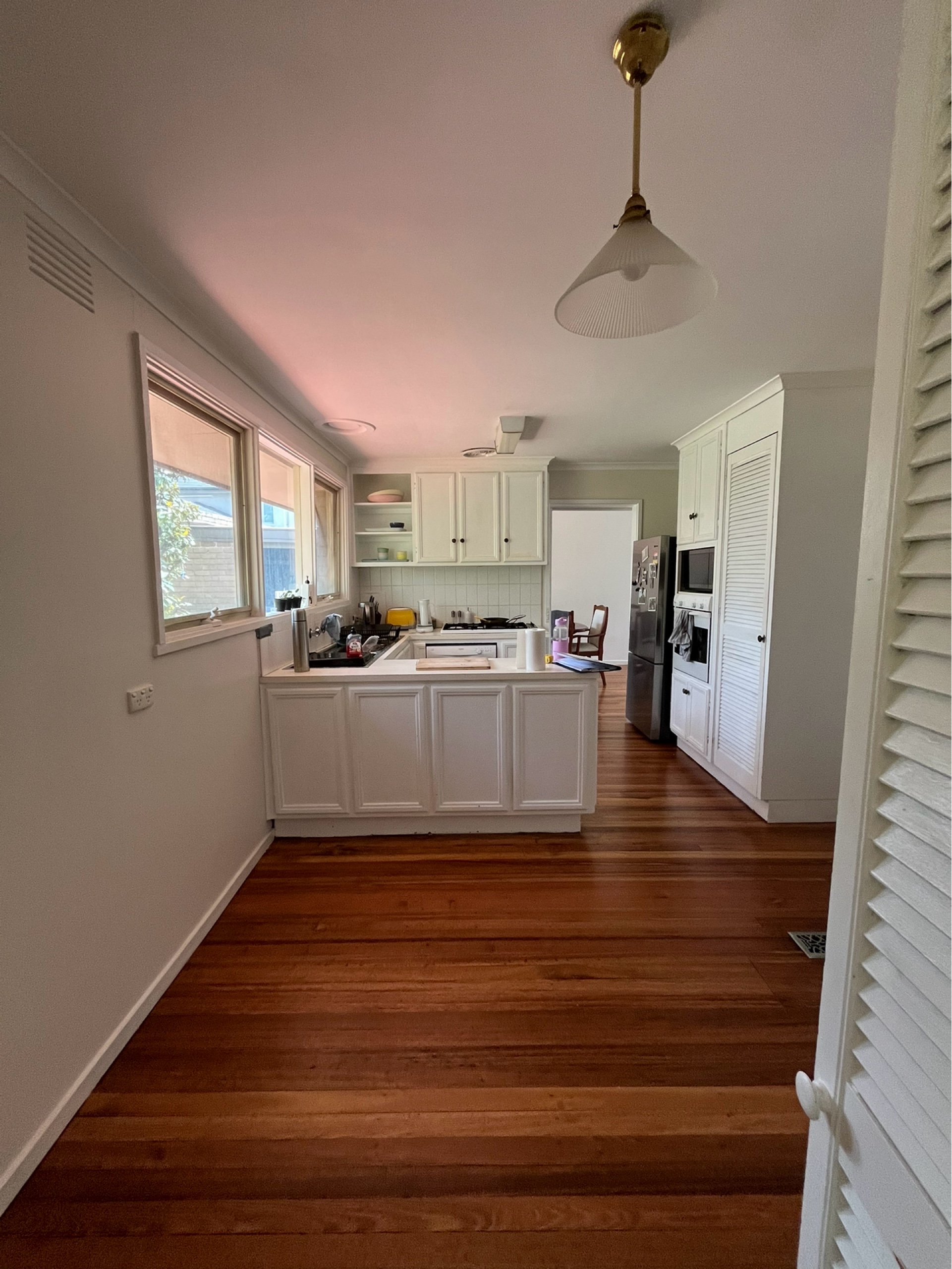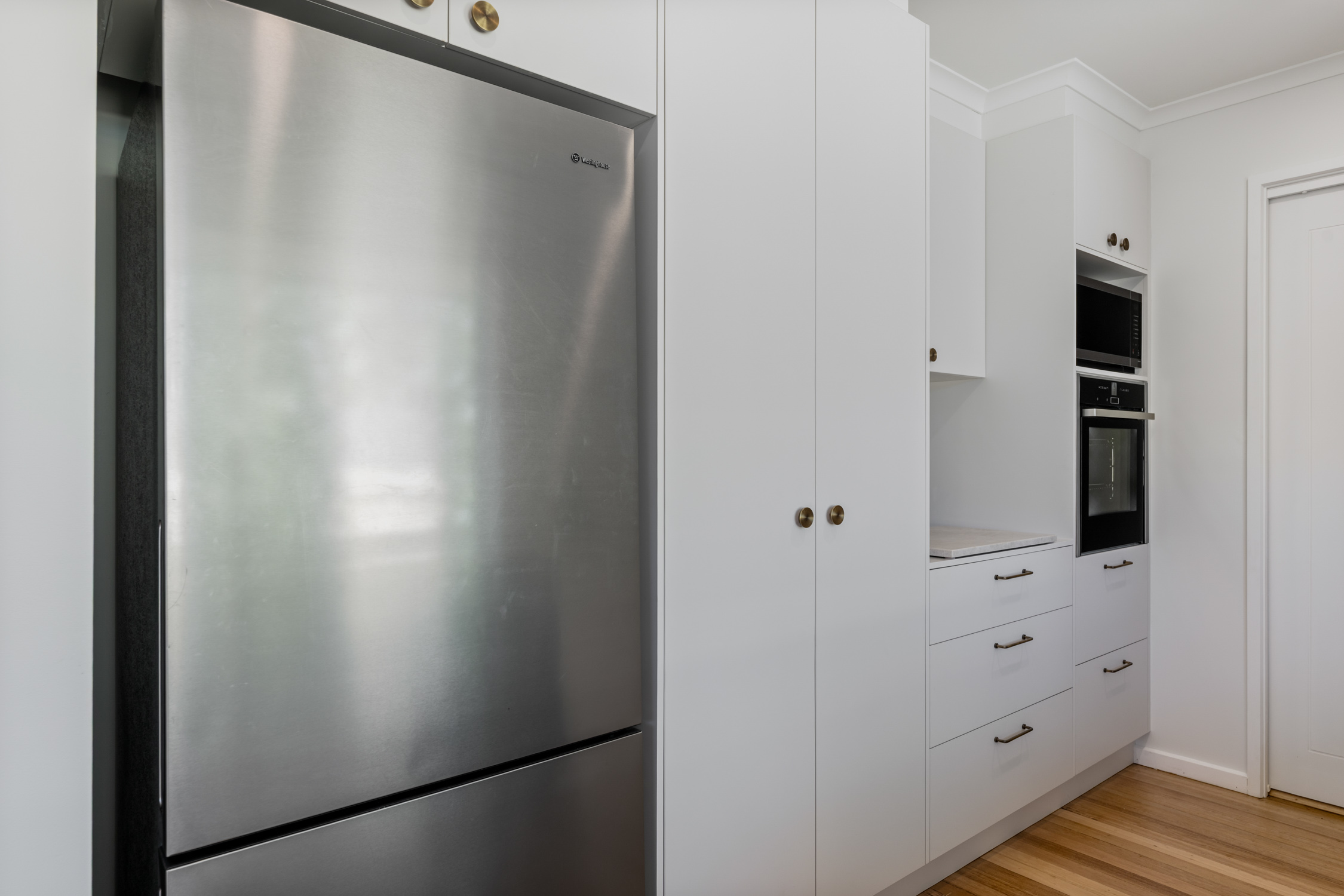 The layout includes a seamlessly integrated fridge cavity, an existing dishwasher built in with matching cabinetry, and dedicated space for modern appliances including a gas cooktop, oven, and microwave. A ducted rangehood was installed with careful attention to compliance, ensuring optimal functionality without compromising on aesthetics. The undermount sink and contemporary kitchen tapware complete the space with understated elegance.