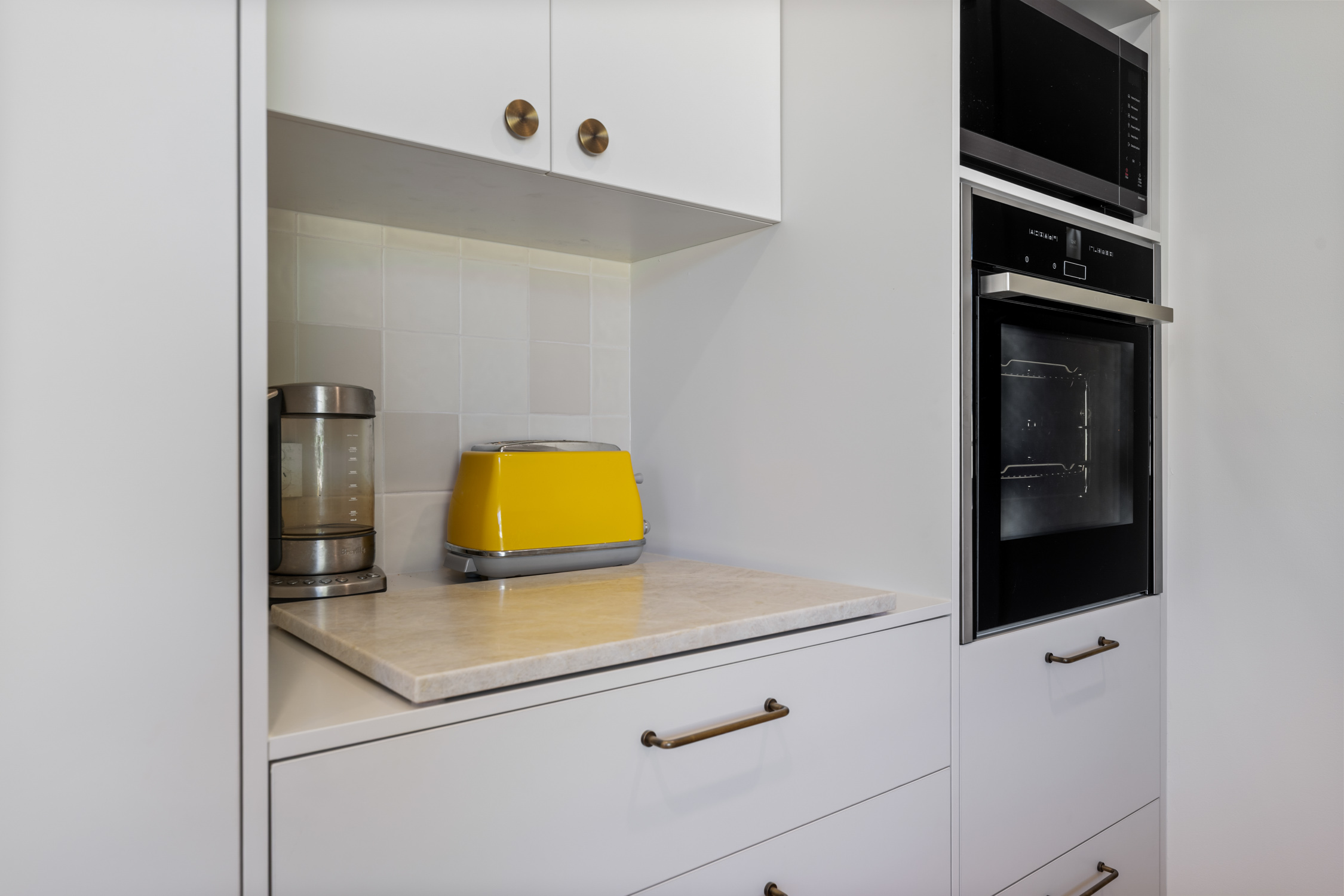 The renovation features custom kitchen cabinetry crafted to the ceiling with a smooth Polytec laminate finish and MDF bulkheads. Every detail was considered, from soft-close hinges on the cabinetry doors to ten drawers fitted with soft-close runners, ensuring both practicality and longevity. A Hafele pull-out bin system enhances convenience while maintaining the streamlined appearance.