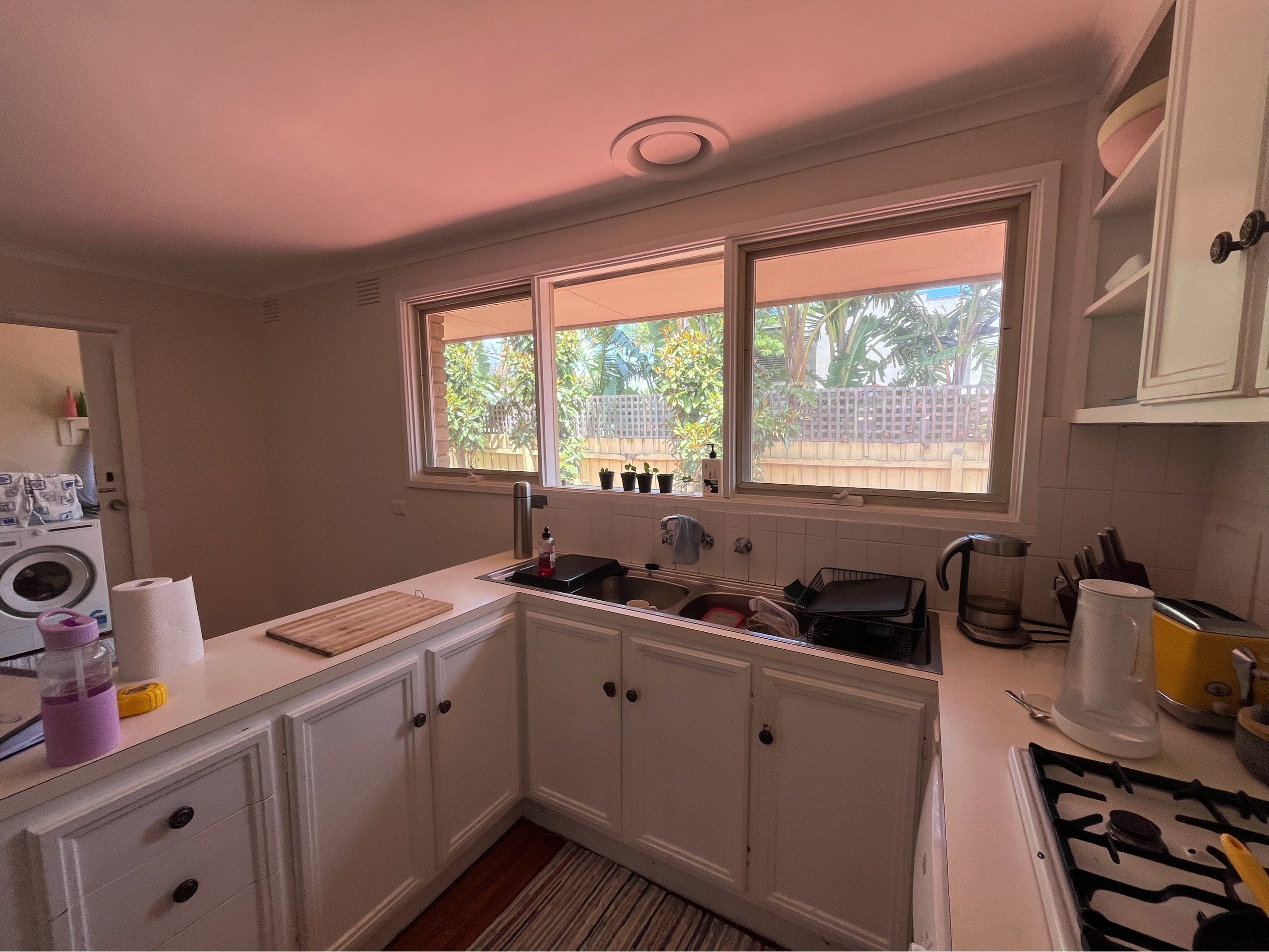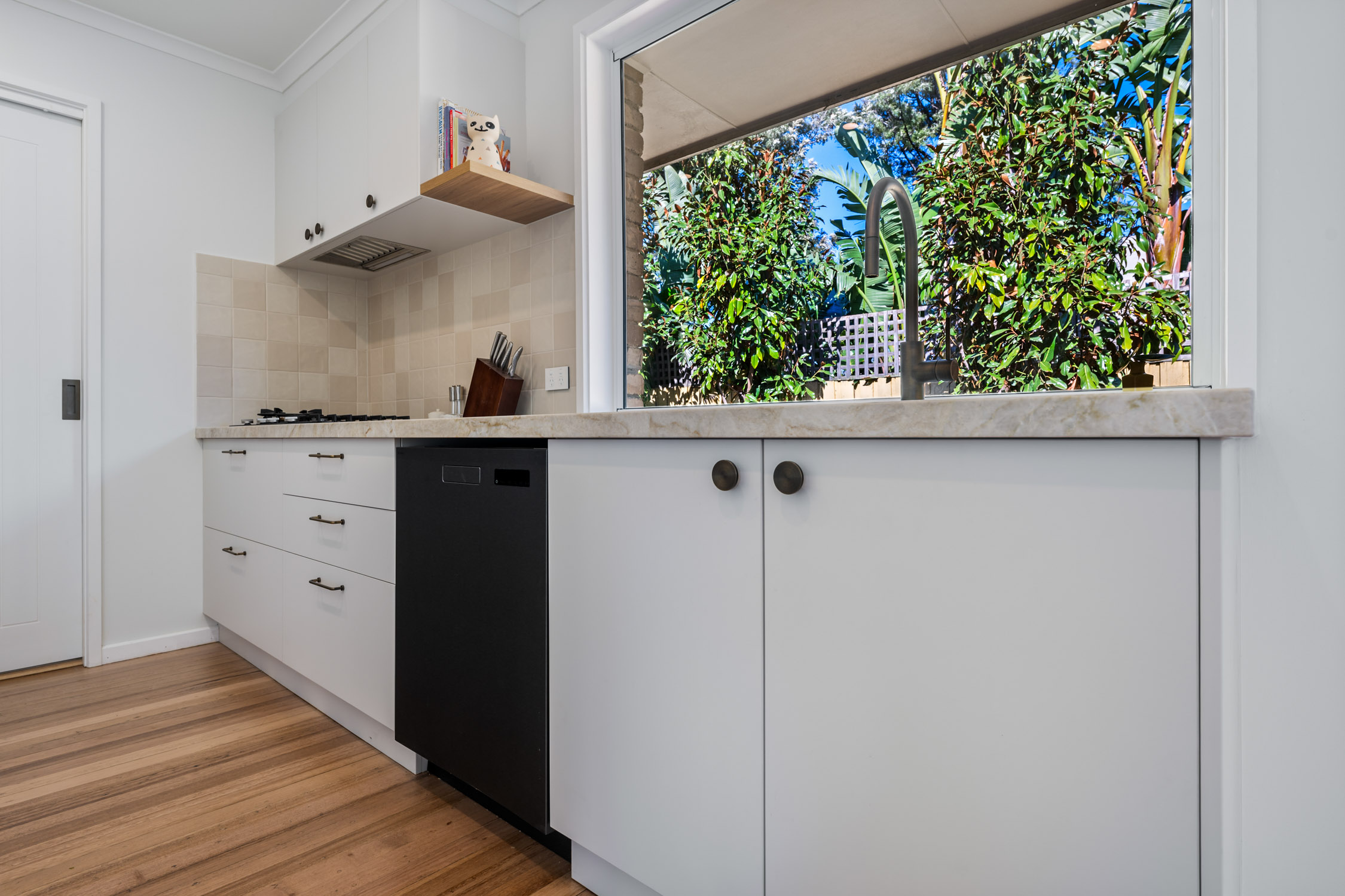 Lighting was thoughtfully designed, with Ecogem LED downlights strategically positioned to brighten work areas, complemented by Clipsal Saturn Zen switches and power points for a refined finish. The oak-toned timber flooring adds warmth underfoot and balances the crisp white cabinetry, while the large window over the sink enhances natural light and creates a strong connection with the outdoor greenery.