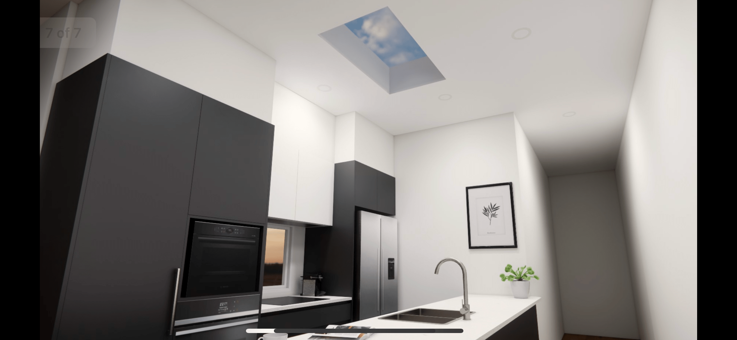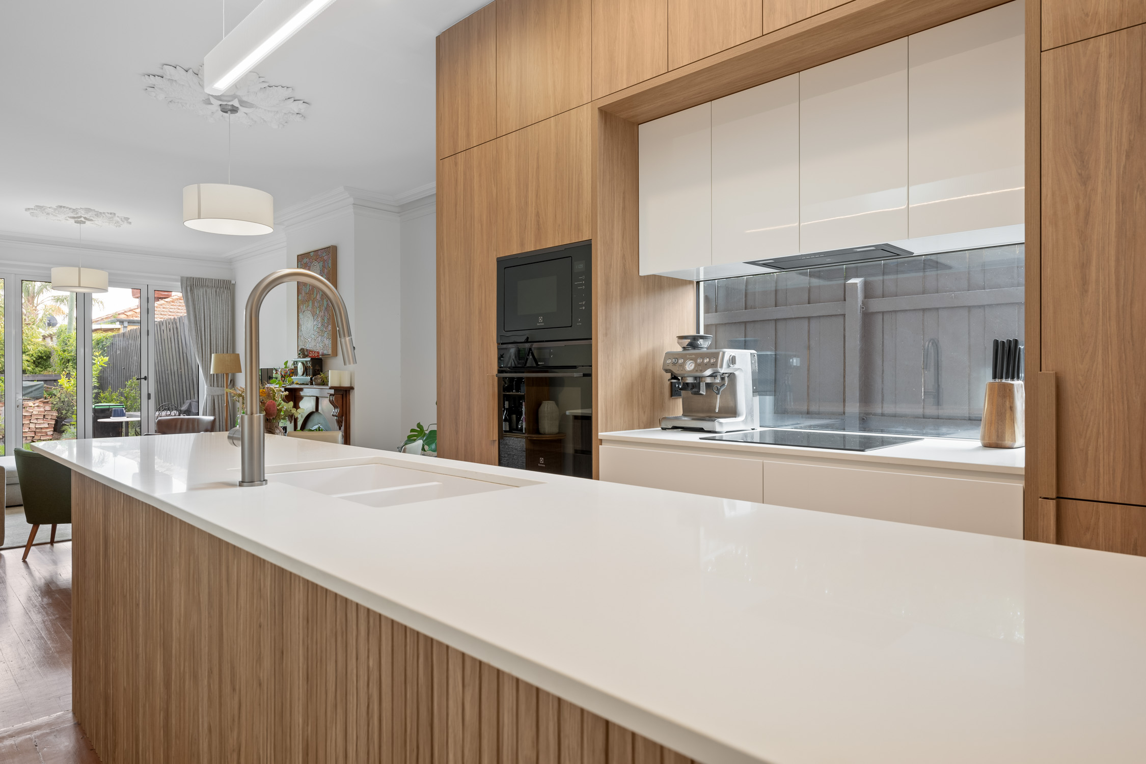 A standout feature of the space is the oversized island with a fluted timber panel base and 20mm Quantum Quartz Deluxe stone benchtop. Three elegantly curved radius corners soften the geometry and highlight the meticulous craftsmanship. The stonework also includes an undermount sink and a minimalist gooseneck tap, all framed under a Velux skylight that floods the kitchen with natural light.