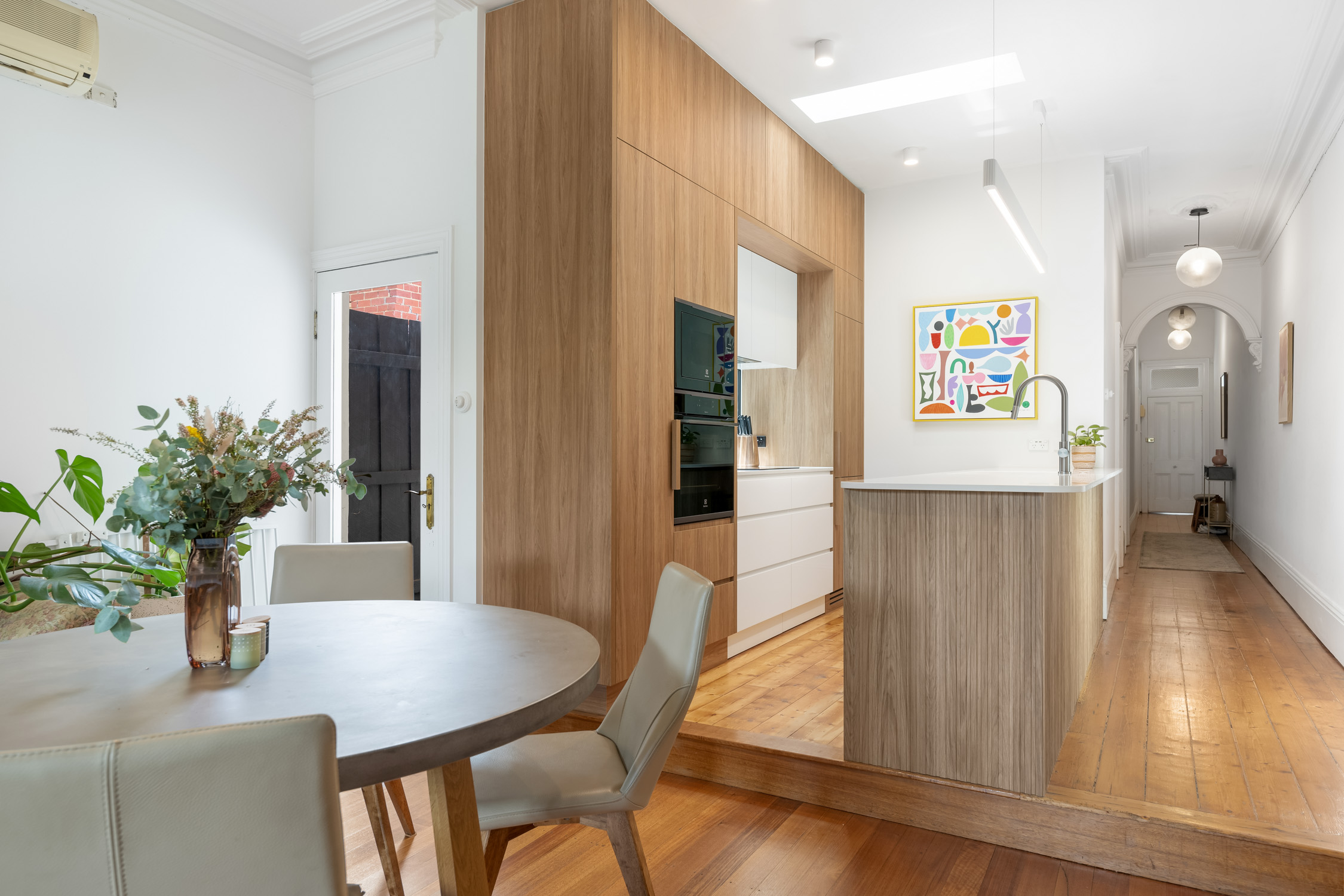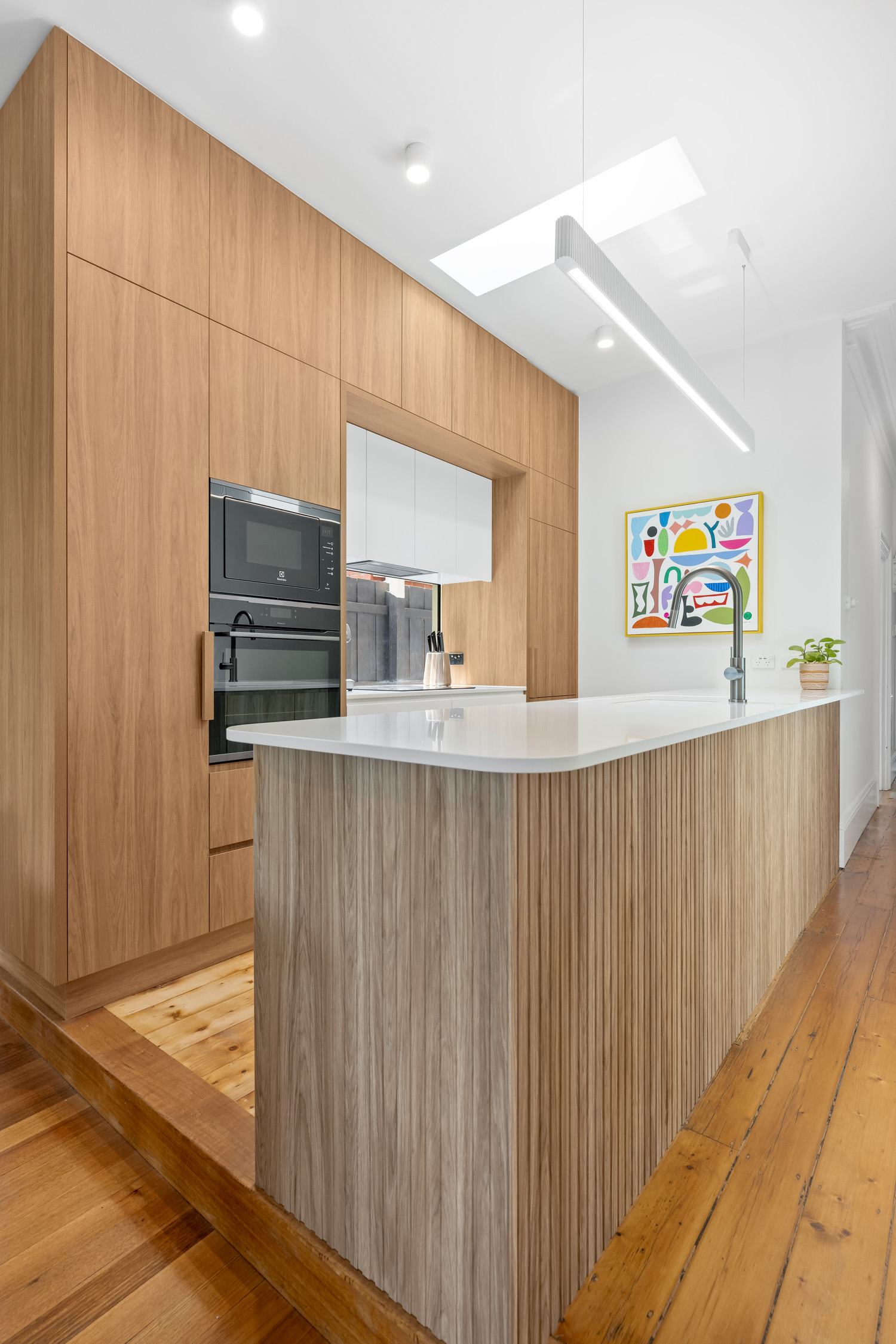Every detail was addressed—from soft-close drawers to double power points positioned for practicality. Painting was limited to a refined builder’s white, maintaining a clean palette and allowing the natural tones of the cabinetry and floors to stand out. A colourful abstract artwork selected by the client brings a playful vibrancy to the space.