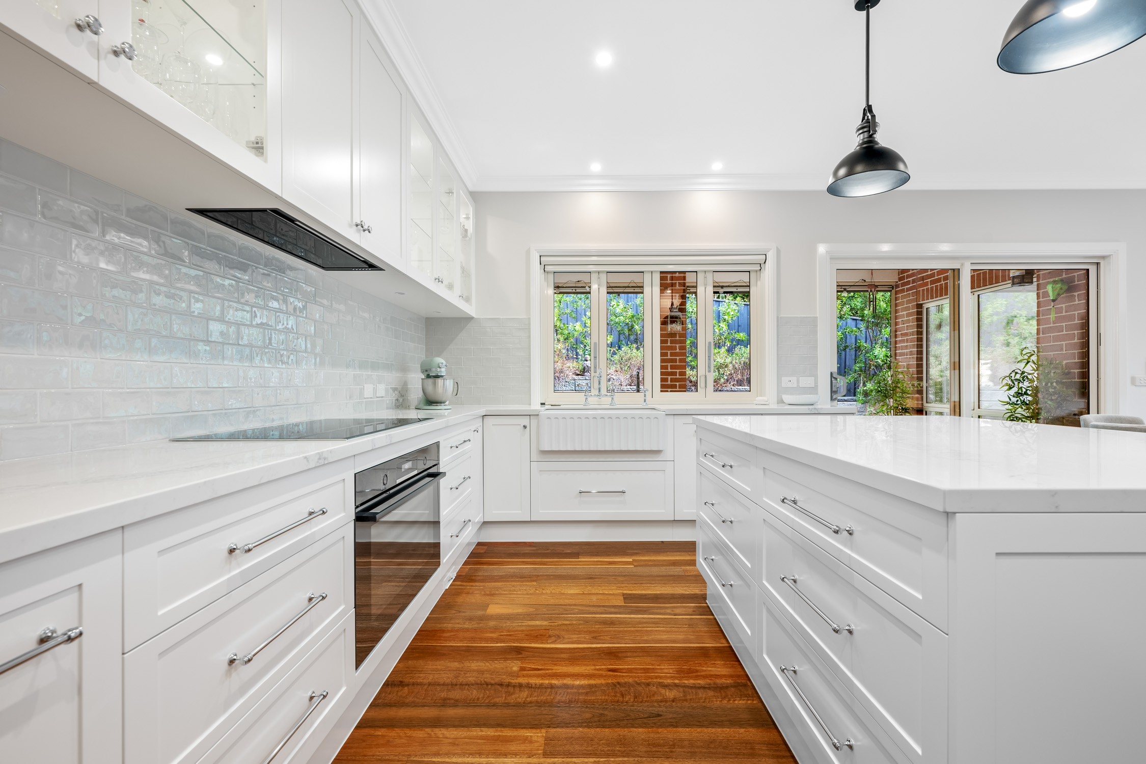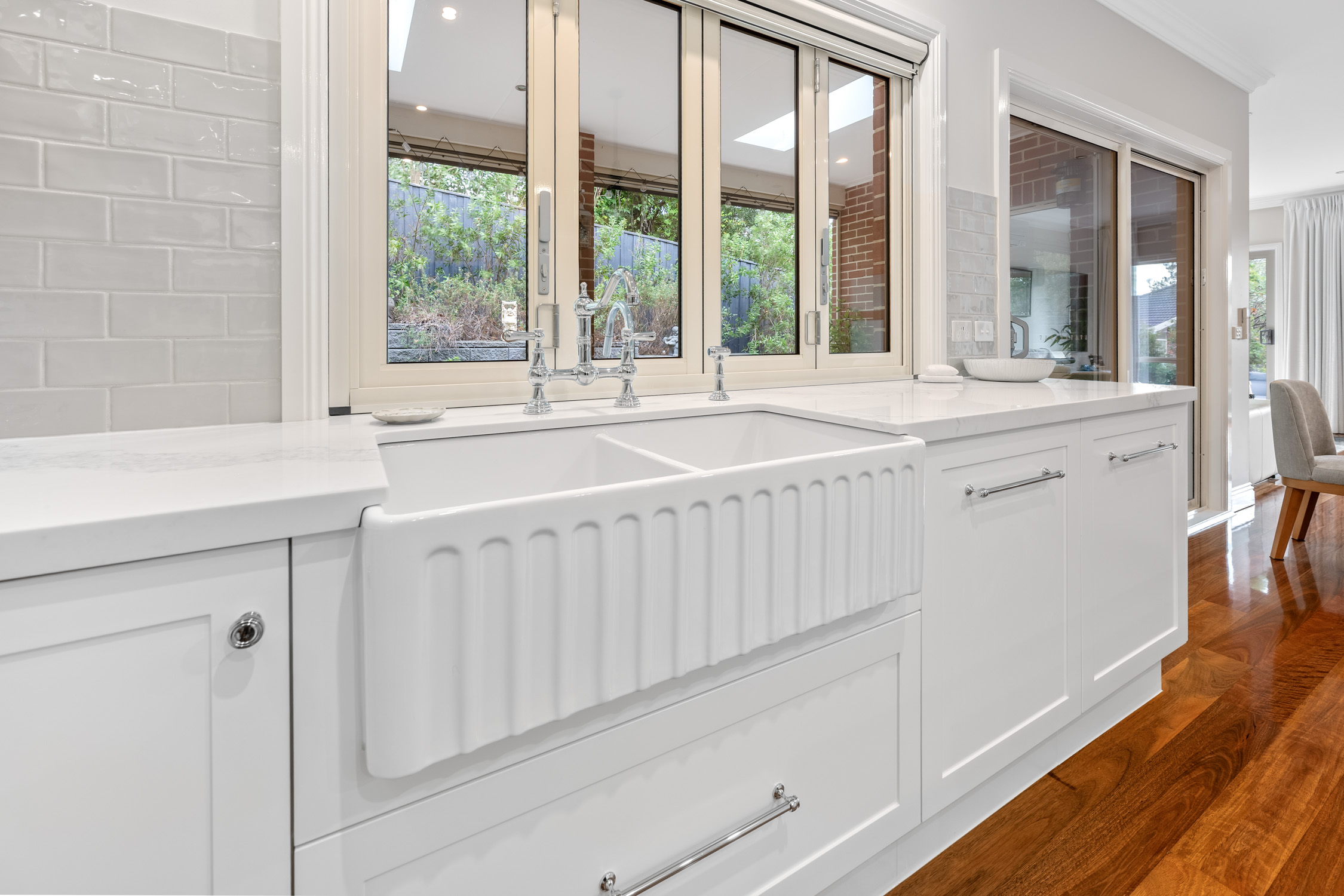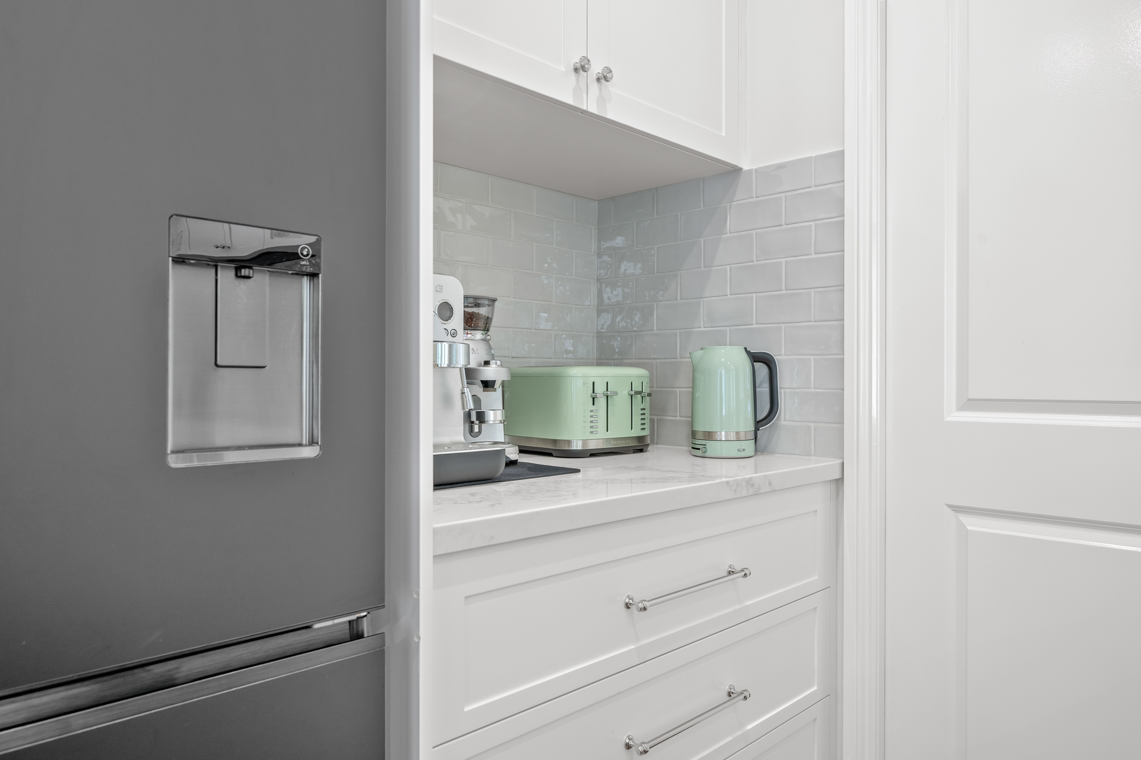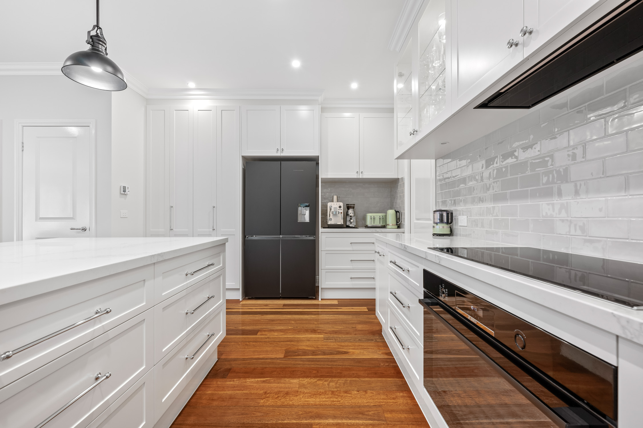 The kitchen’s layout was carefully planned to improve both workflow and storage. We removed the existing walk-in pantry wall and replastered the space, ensuring a more open and fluid design. The addition of custom cabinetry, including specialized storage for a microwave and fridge, further contributes to the kitchen’s functionality. A bifold window next to the sink opens up the space, allowing for a connection to the outdoors while cooking.