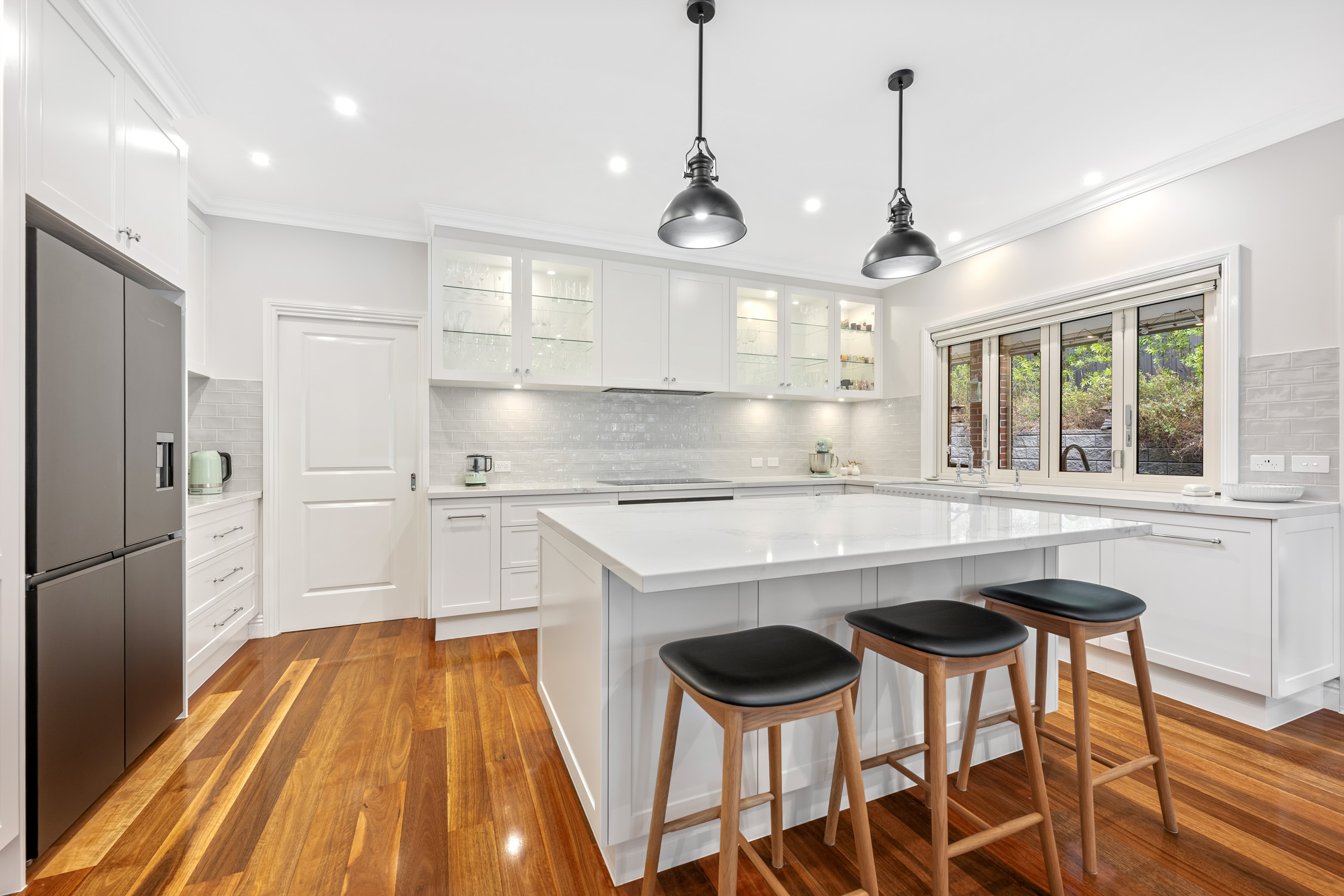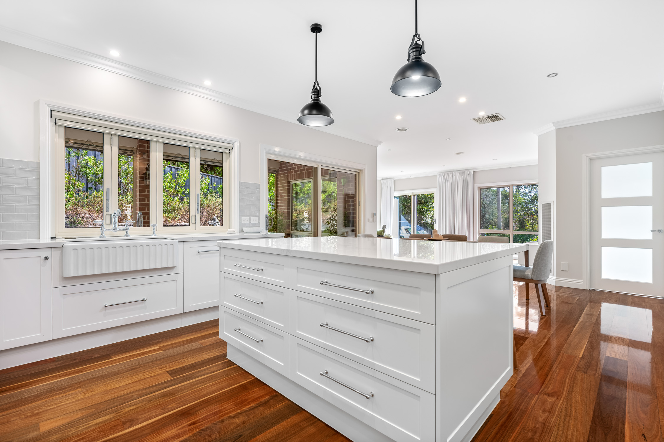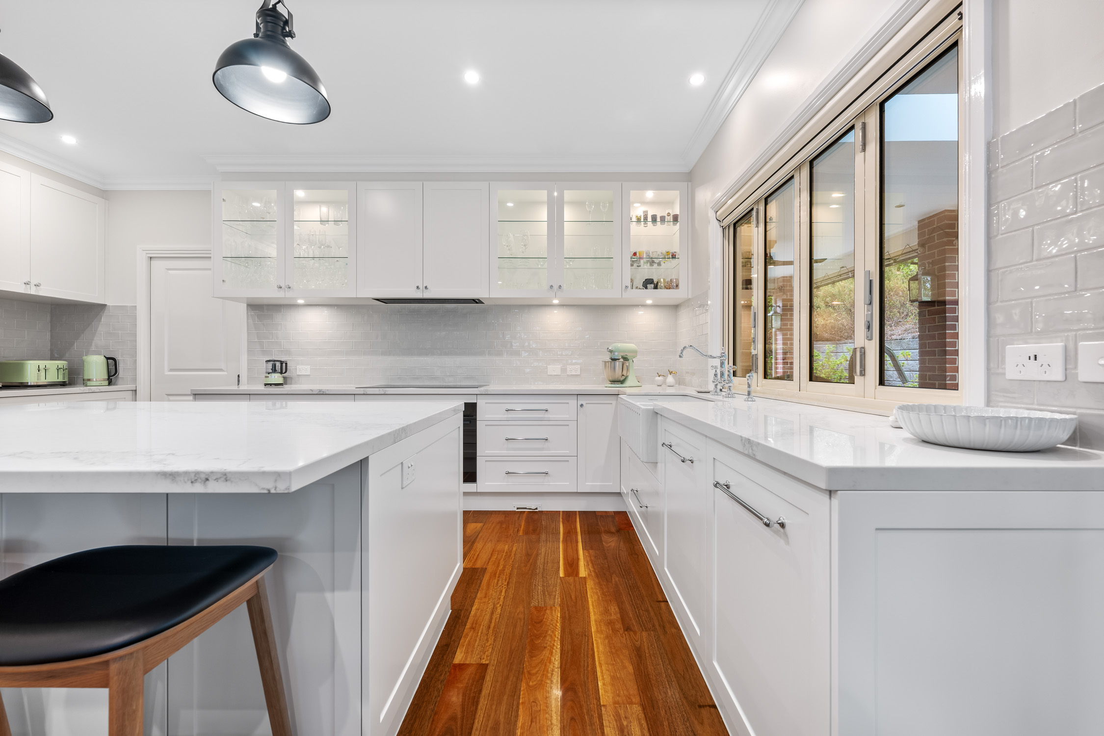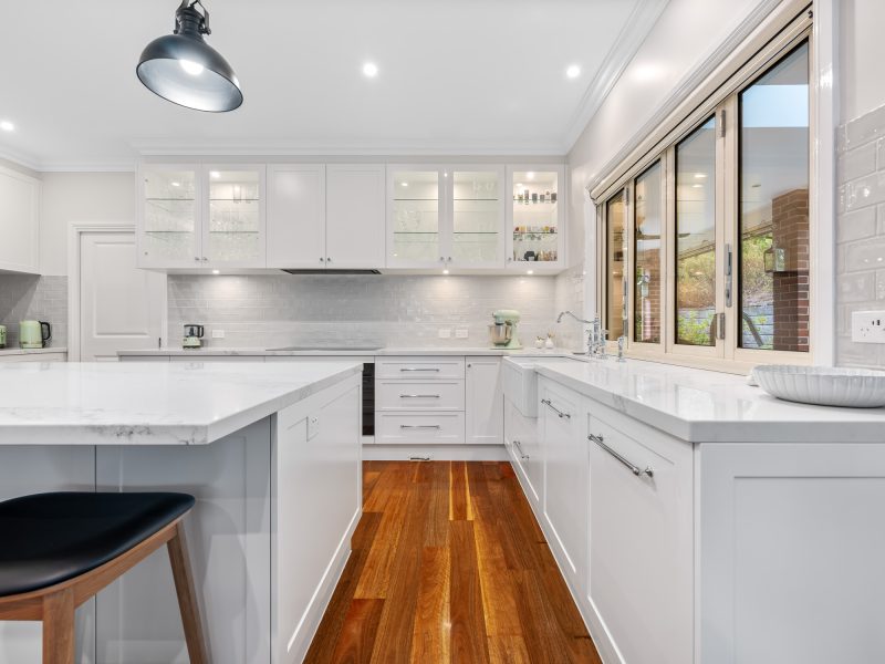 The kitchen’s layout was carefully planned to improve both workflow and storage. We removed the existing walk-in pantry wall and replastered the space, ensuring a more open and fluid design. The addition of custom cabinetry, including specialized storage for a microwave and fridge, further contributes to the kitchen’s functionality. A bifold window next to the sink opens up the space, allowing for a connection to the outdoors while cooking.