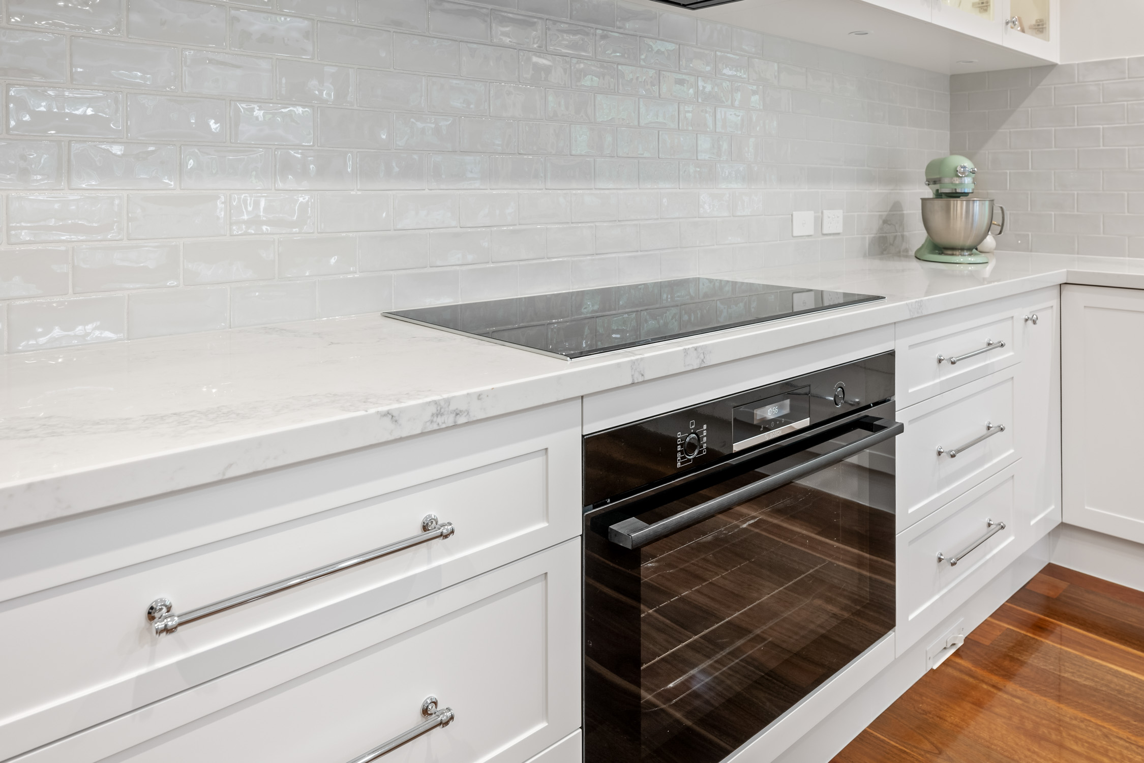 A key feature of the design is the under-mount sink and high-end tapware, providing both form and function. The sink is paired with sleek cabinetry and high-efficiency appliances, such as the Bosch induction cooktop, Bosch under-bench oven, and fully integrated Bosch dishwasher, which blend perfectly into the modern aesthetic.