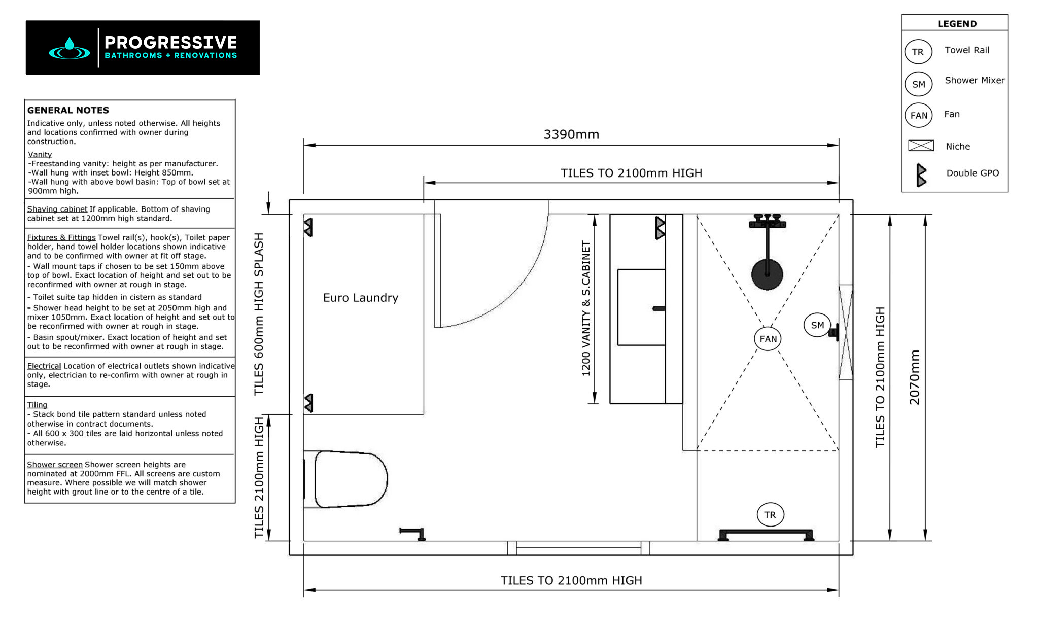 Combining a bathroom with a Euro laundry is a clever solution for homes where space needs to serve multiple purposes. This design (3390mm x 2070mm) integrates essential bathroom features with a compact laundry area, delivering efficiency without compromising on style or functionality.