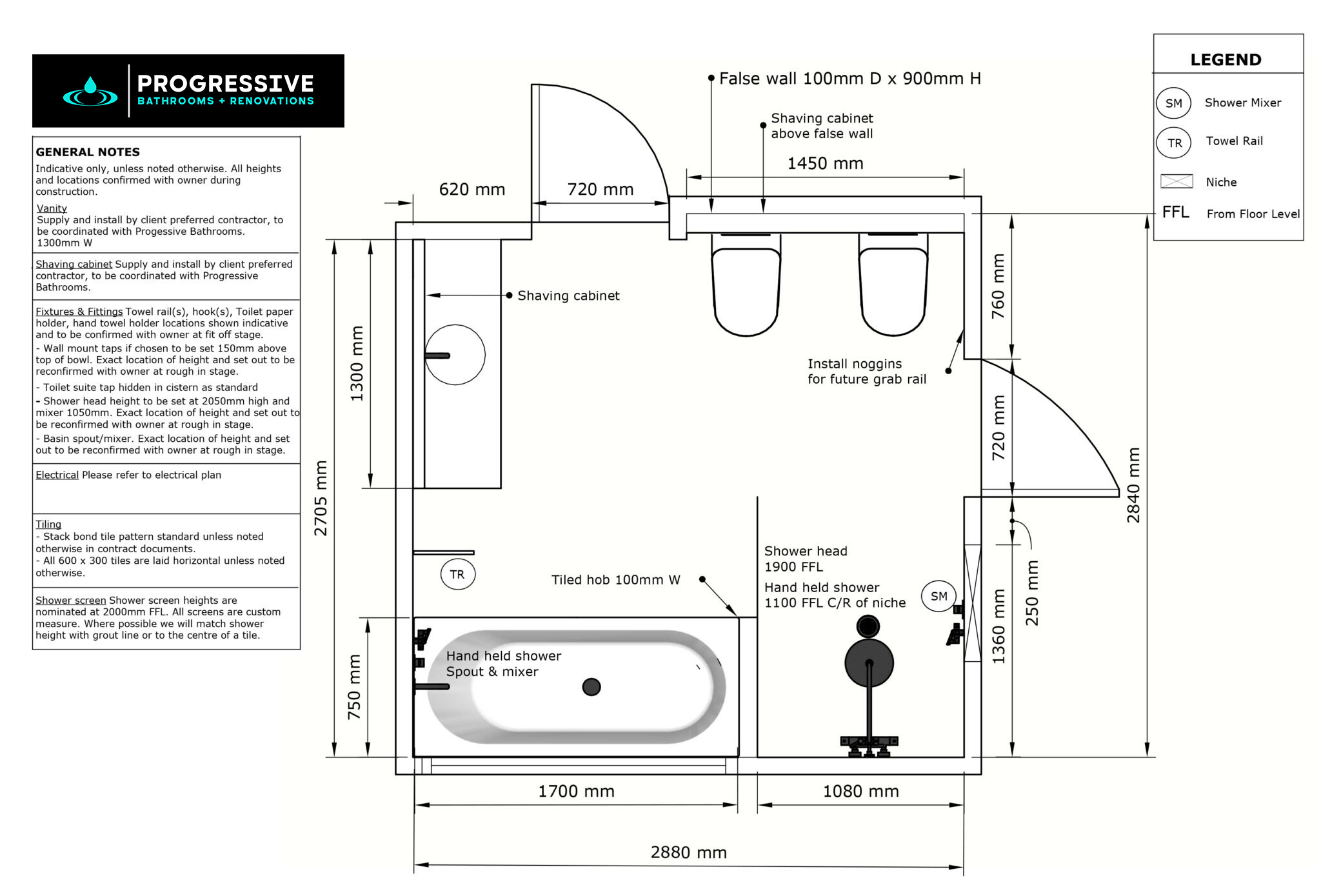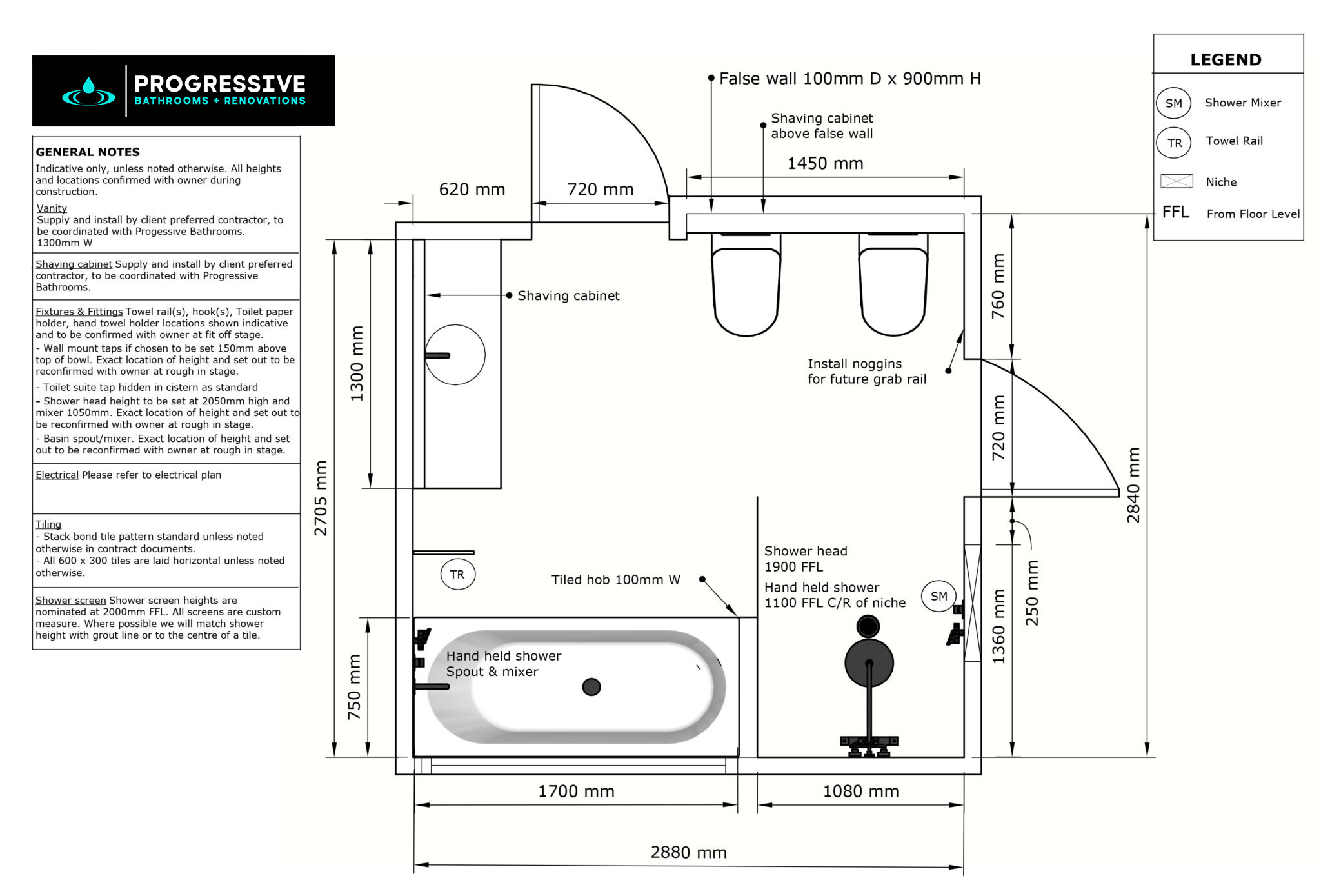 This design (2880mm x 2840mm) delivers a versatile bathroom layout that prioritises comfort, functionality, and future-proofing. Ideal for families or individuals planning for long-term accessibility, this layout combines modern aesthetics with thoughtful design elements like grab-rail readiness and spacious zones.