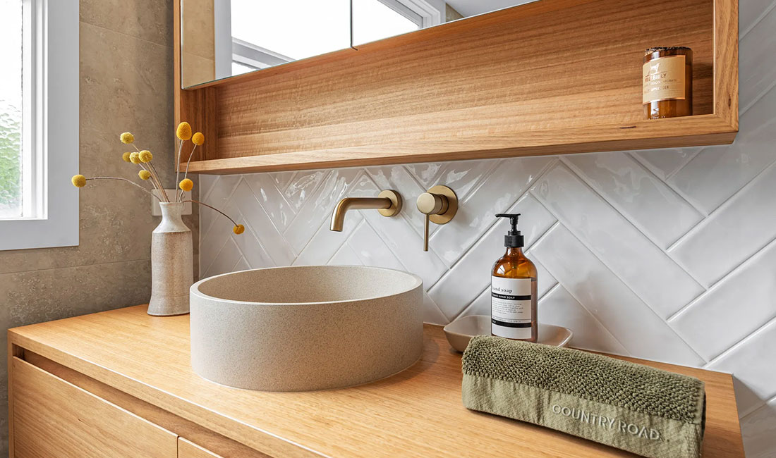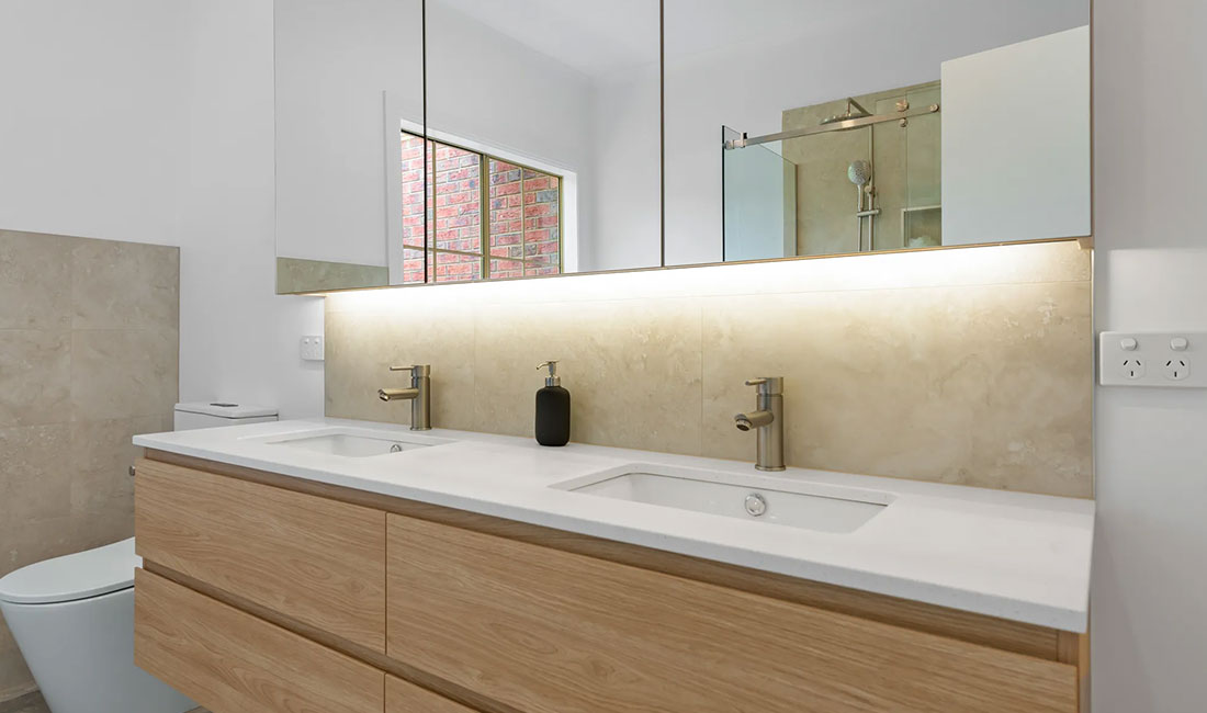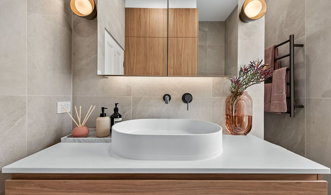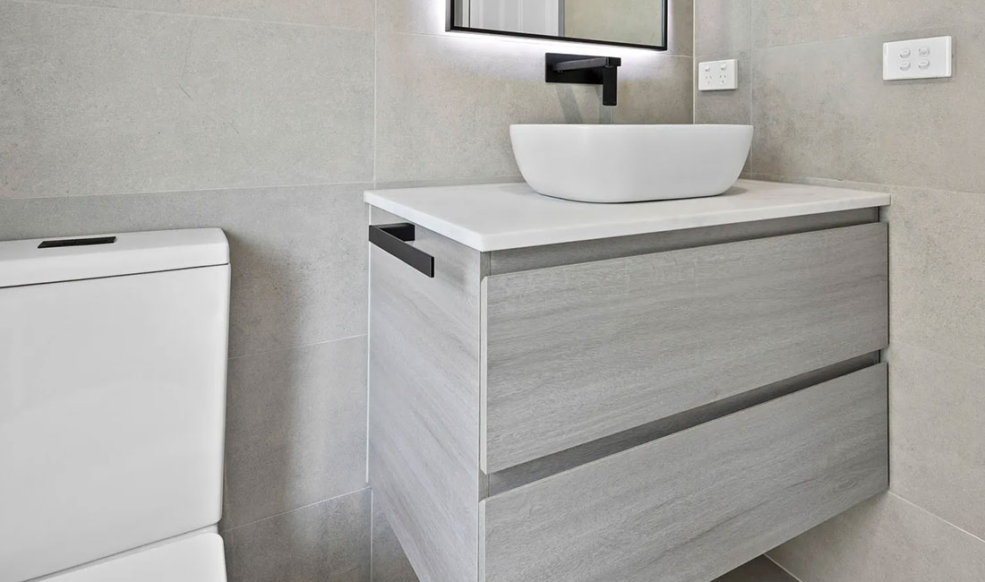 Maximise floor space with a sleek, floating vanity. Not only do they offer a modern look, but they also make small bathrooms appear larger by revealing more of the floor. Adding under-bench lighting also adds to the illusion of creating more space by illuminating dark areas under the vanity while adding a sophisticated and moody touch.